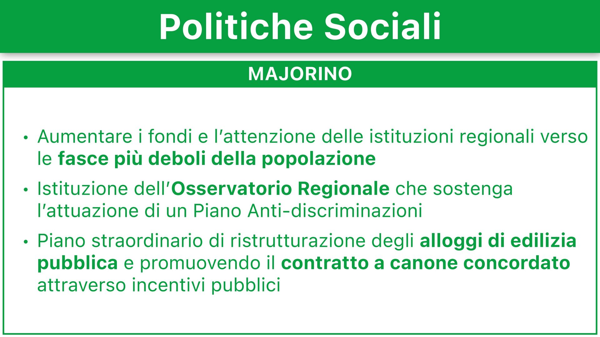 verso le fasce più deboli della popolazione • Istituzione dell’Osservatorio Regionale che sostenga l’attuazione di un Piano Anti-discriminazioni • Piano straordinario di ristrutturazione degli alloggi di edilizia pubblica e promuovendo il contratto a canone concordato attraverso incentivi pubblici Politiche Sociali