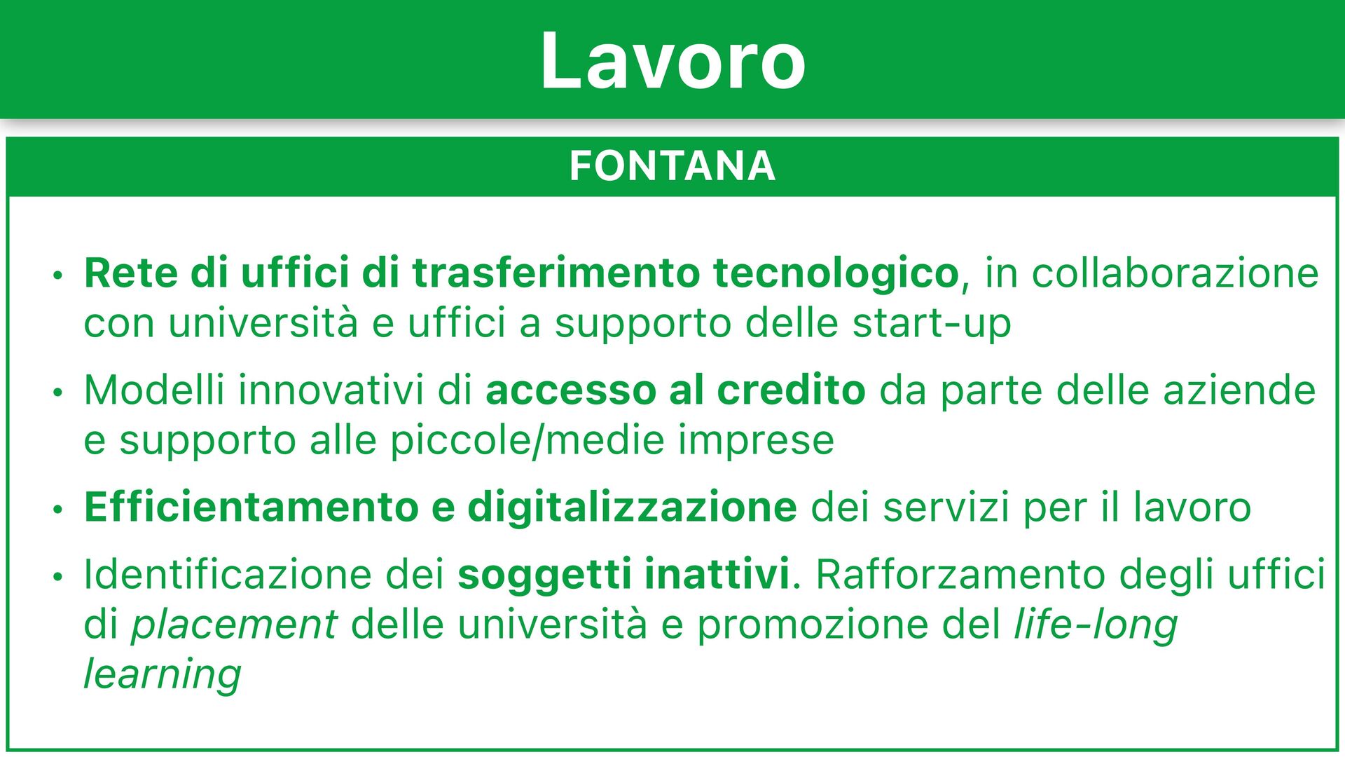 con università e uffici a supporto delle start-up • Modelli innovativi di accesso al credito da parte delle aziende e supporto alle piccole/medie imprese • Efficientamento e digitalizzazione dei servizi per il lavoro • Identificazione dei soggetti inattivi. Rafforzamento degli uffici di placement delle università e promozione del life-long learning Lavoro