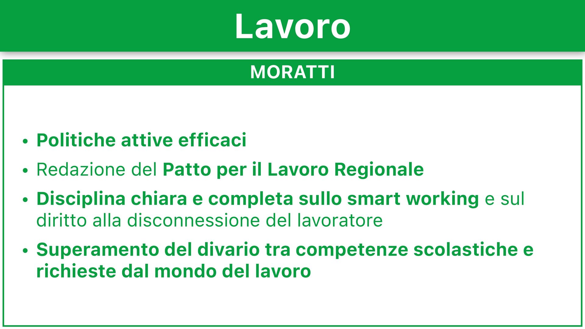 1.3% a 3% • Rafforzamento dell’apprendistato attraverso misure di decontribuzione • Aumento di tutele e opportunità per freelance e partite IVA • Istituzione di un Osservatorio sui Salari, sostenendo il salario minimo e contrastando la disparità salariale tra generi • Potenziamento dei centri per l’impiego Lavoro
