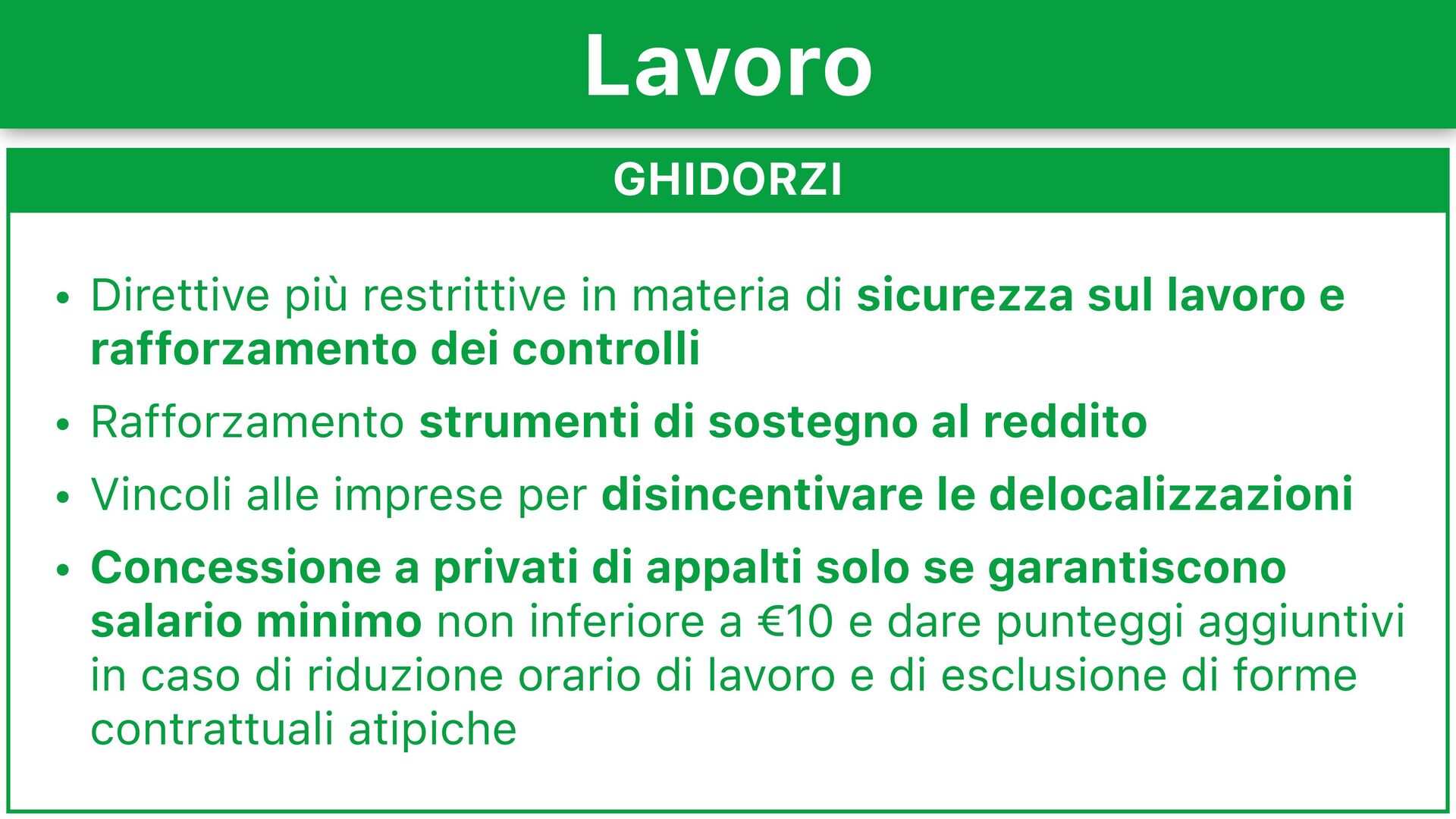 lavoro e rafforzamento dei controlli • Rafforzamento strumenti di sostegno al reddito • Vincoli alle imprese per disincentivare le delocalizzazioni • Concessione a privati di appalti solo se garantiscono salario minimo non inferiore a 10 e dare punteggi aggiuntivi in caso di riduzione orario di lavoro e di esclusione di forme contrattuali atipiche Lavoro