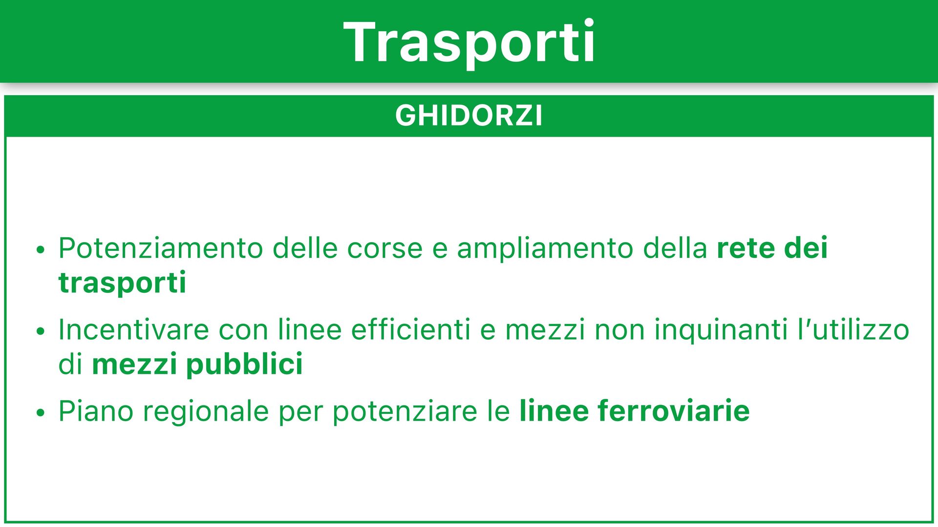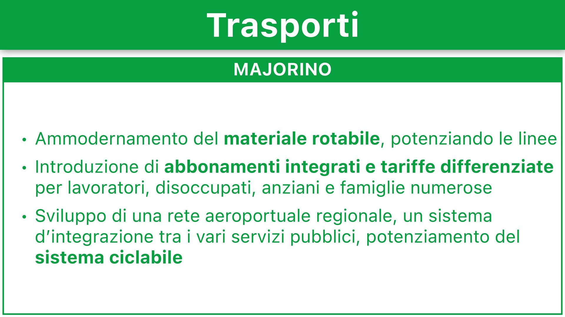 Introduzione di abbonamenti integrati e tariffe differenziate per lavoratori, disoccupati, anziani e famiglie numerose • Sviluppo di una rete aeroportuale regionale, un sistema d’integrazione tra i vari servizi pubblici, potenziamento del sistema ciclabile Trasporti