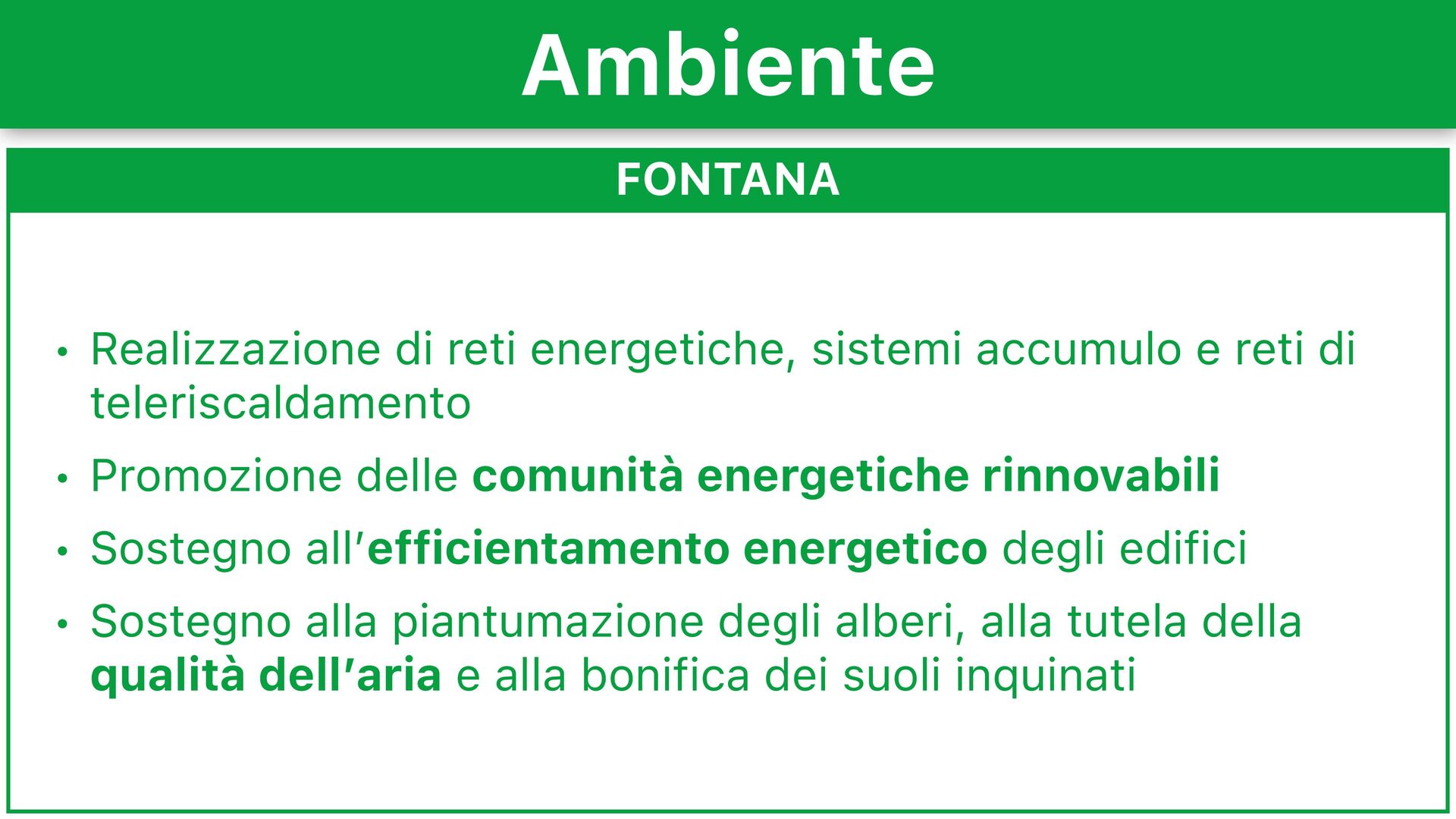di teleriscaldamento • Promozione delle comunità energetiche rinnovabili • Sostegno all’efficientamento energetico degli edifici • Sostegno alla piantumazione degli alberi, alla tutela della qualità dell’aria e alla bonifica dei suoli inquinati Ambiente