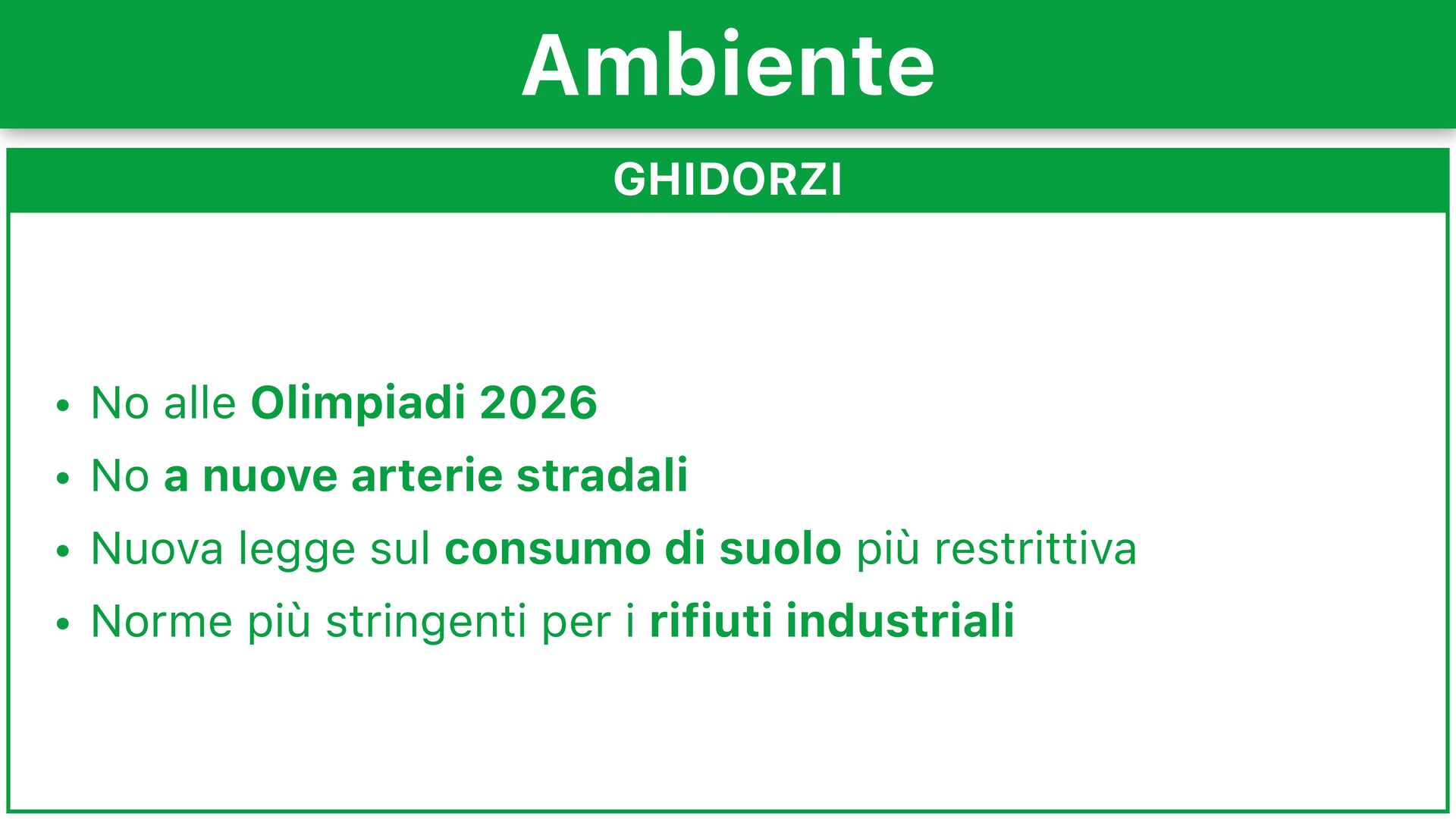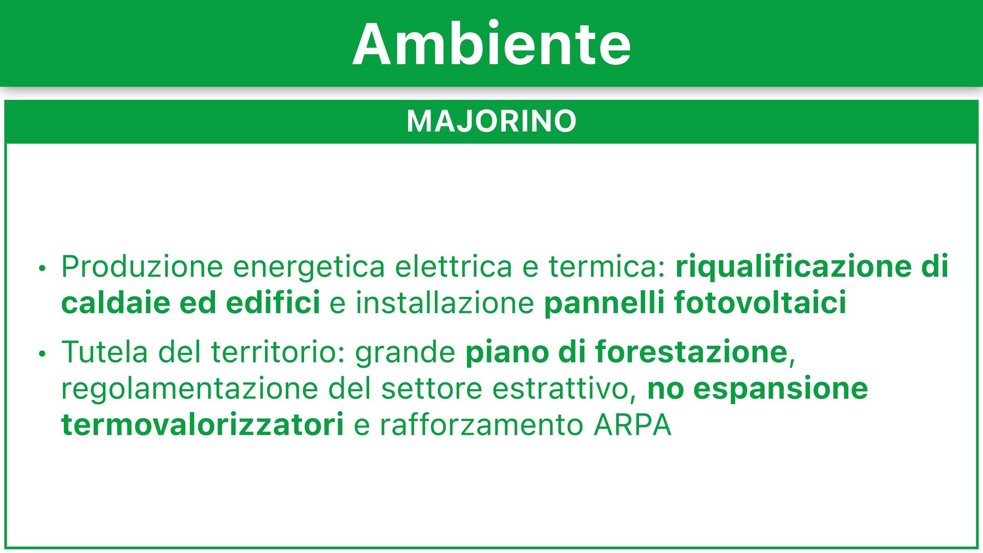 ed edifici e installazione pannelli fotovoltaici • Tutela del territorio: grande piano di forestazione, regolamentazione del settore estrattivo, no espansione termovalorizzatori e rafforzamento ARPA Ambiente