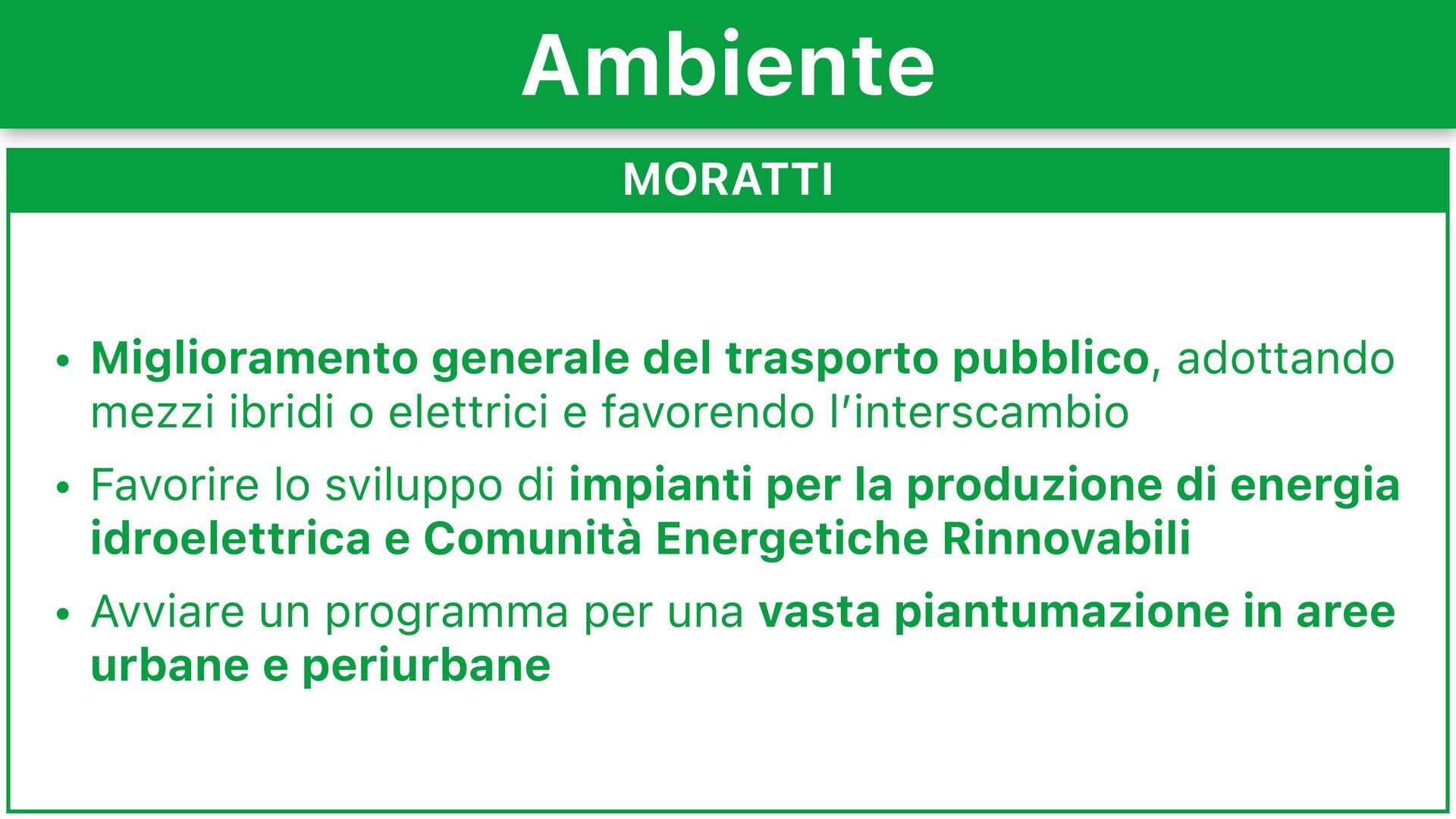 o elettrici e favorendo l’interscambio • Favorire lo sviluppo di impianti per la produzione di energia idroelettrica e Comunità Energetiche Rinnovabili • Avviare un programma per una vasta piantumazione in aree urbane e periurbane Ambiente