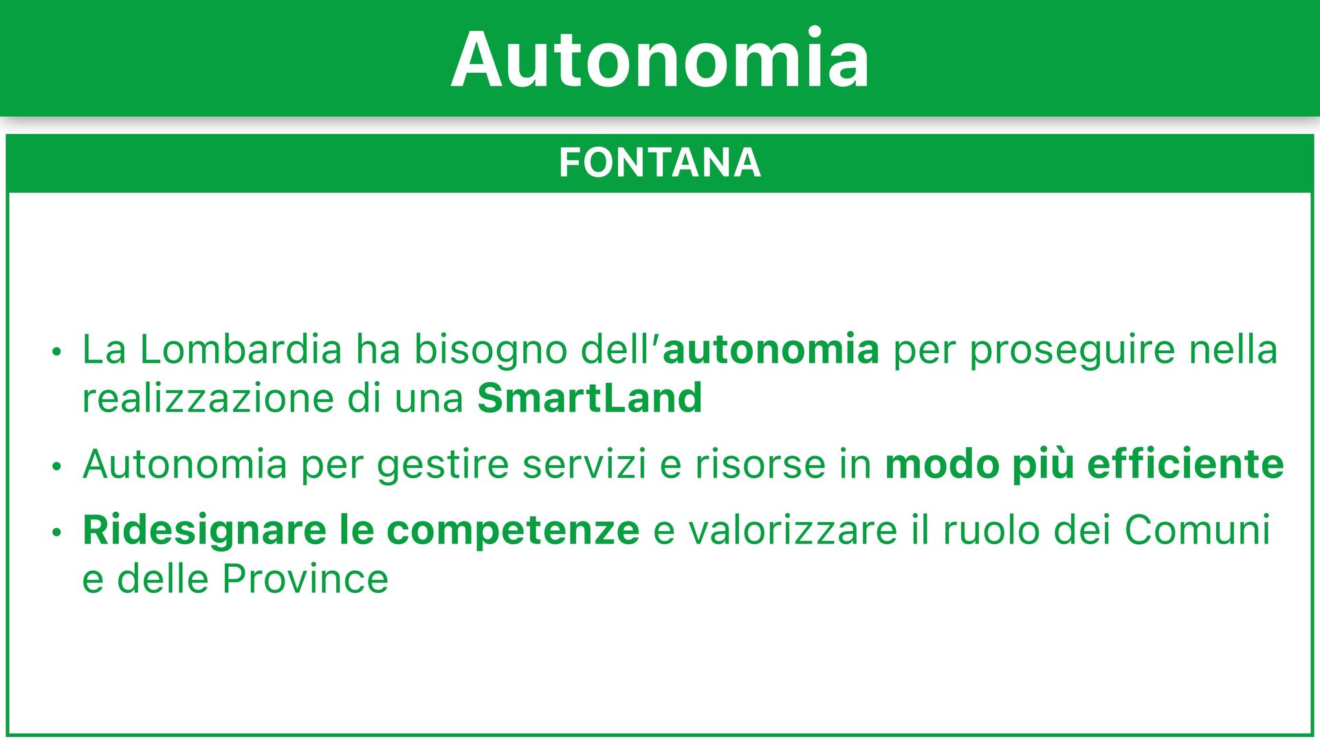 realizzazione di una SmartLand • Autonomia per gestire servizi e risorse in modo più efficiente • Ridesignare le competenze e valorizzare il ruolo dei Comuni e delle Province Autonomia