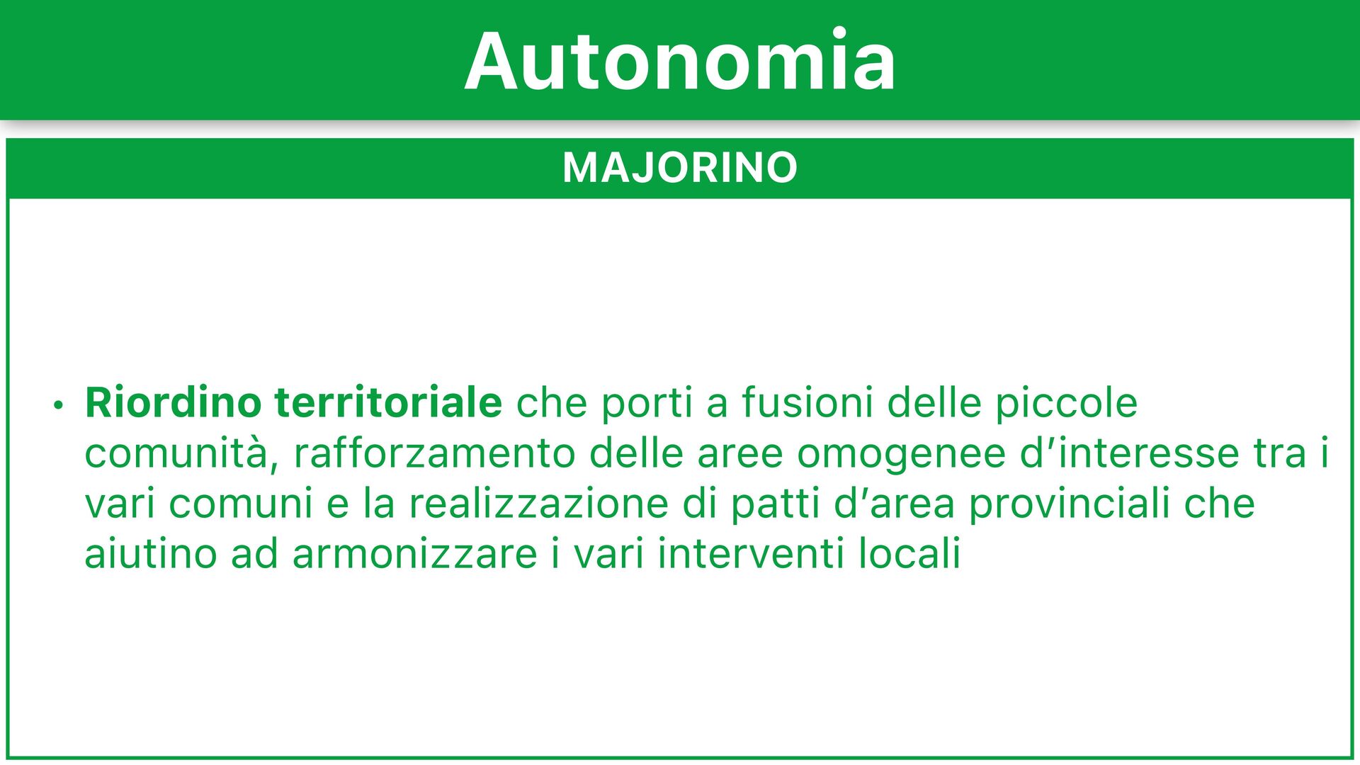 comunità, rafforzamento delle aree omogenee d’interesse tra i vari comuni e la realizzazione di patti d’area provinciali che aiutino ad armonizzare i vari interventi locali Autonomia