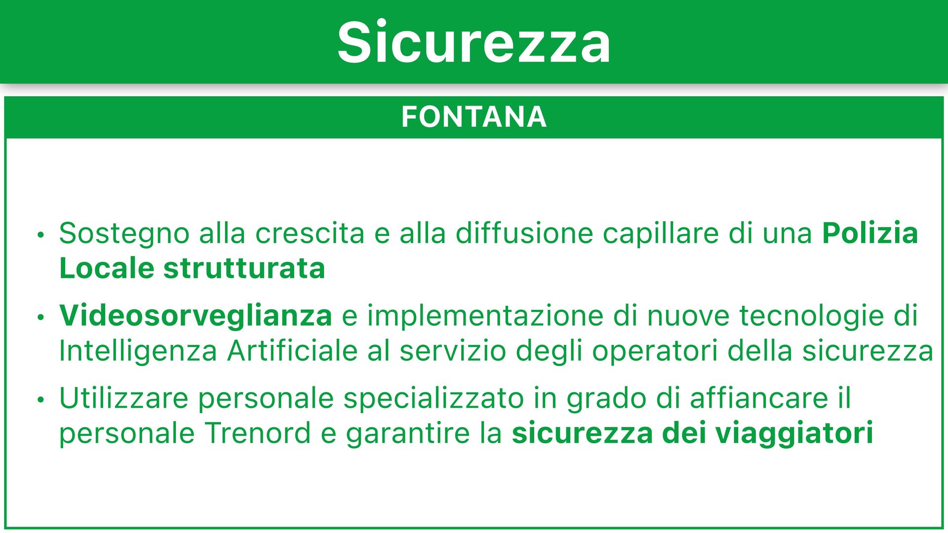 una Polizia Locale strutturata • Videosorveglianza e implementazione di nuove tecnologie di Intelligenza Artificiale al servizio degli operatori della sicurezza • Utilizzare personale specializzato in grado di affiancare il personale Trenord e garantire la sicurezza dei viaggiatori Sicurezza