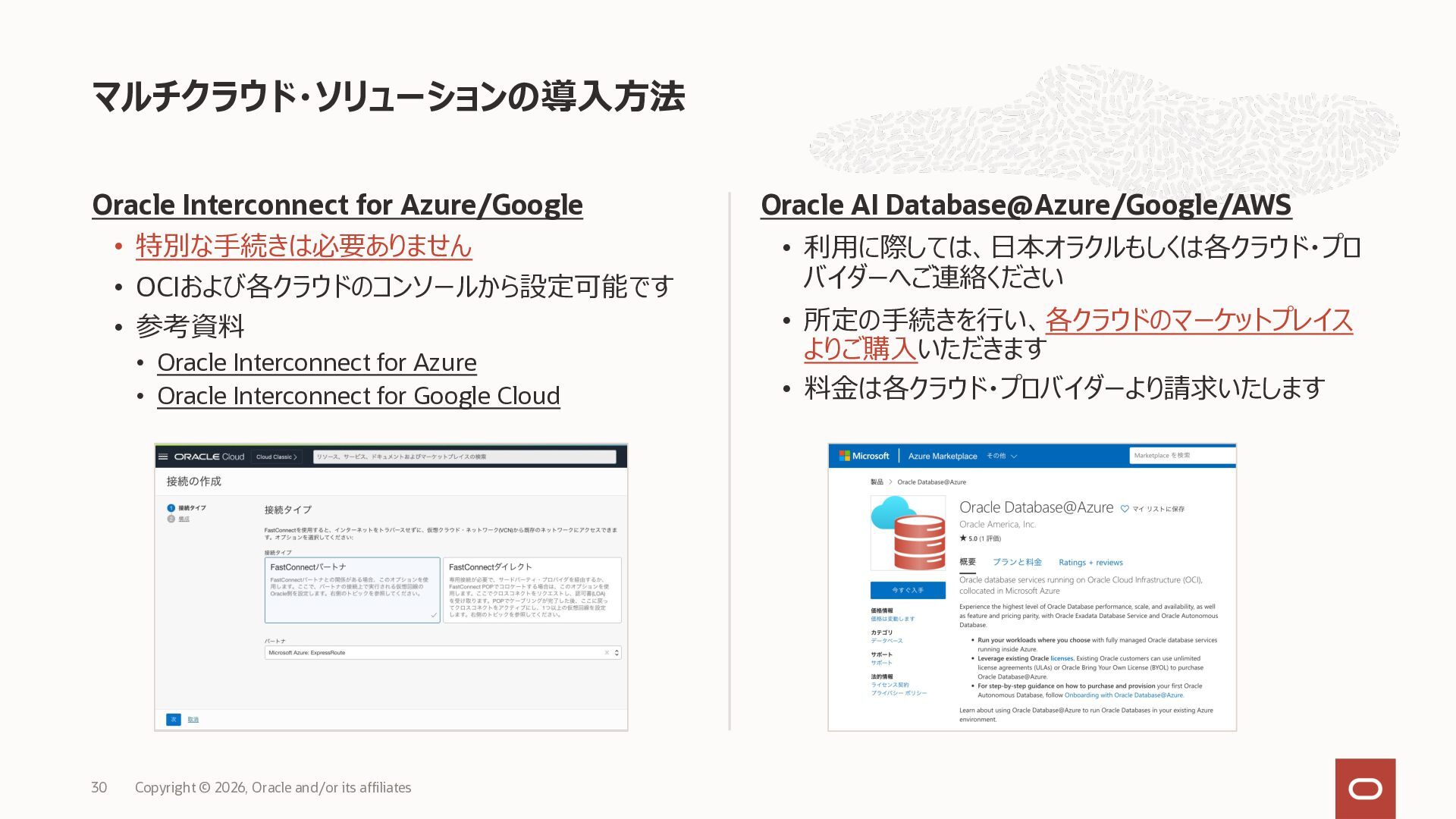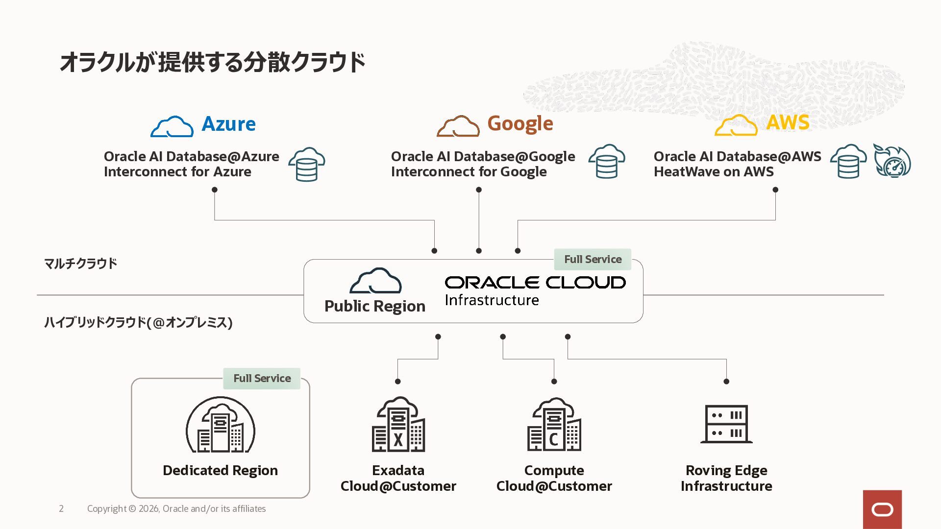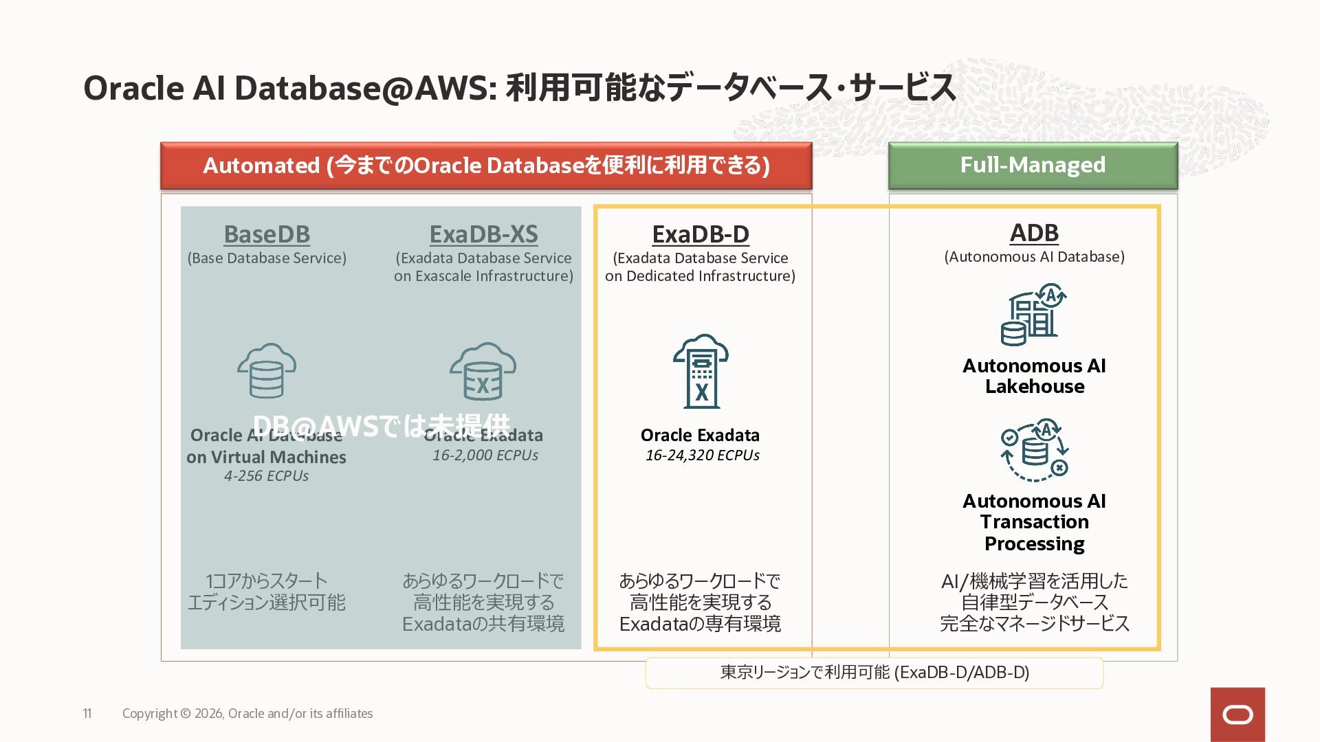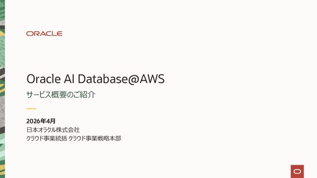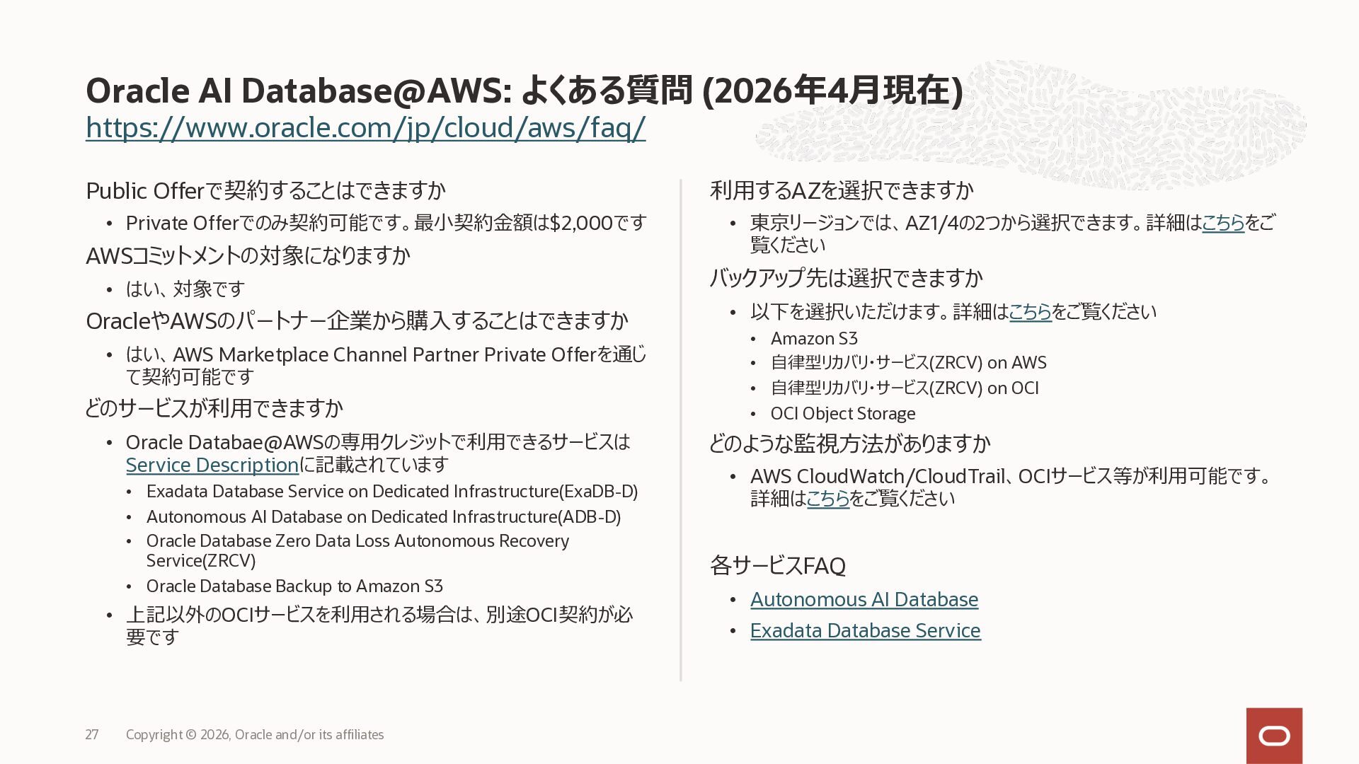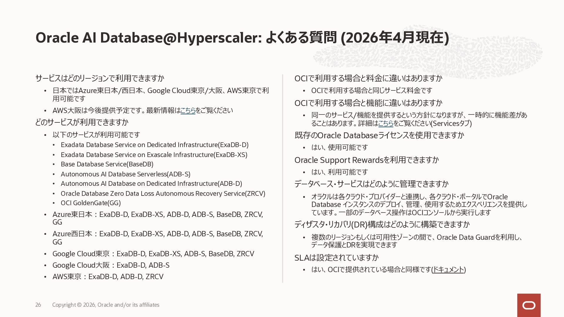 • Exadata Database Service on Dedicated Infrastructure(ExaDB-D) • Exadata Database Service on Exascale Infrastructure(ExaDB-XS) • Base Database Service(BaseDB) • Autonomous AI Database Serverless(ADB-S) • Autonomous AI Database on Dedicated Infrastructure(ADB-D) • Oracle Database Zero Data Loss Autonomous Recovery Service(ZRCV) • OCI GoldenGate(GG) • Azure東⽇本︓ExaDB-D, ExaDB-XS, ADB-D, ADB-S, BaseDB, ZRCV, GG • Azure⻄⽇本︓ExaDB-D, ExaDB-XS, ADB-D, ADB-S, BaseDB, ZRCV, GG • Google Cloud東京︓ExaDB-D, ExaDB-XS, ADB-S, BaseDB, ZRCV • Google Cloud⼤阪︓ExaDB-D, ADB-S • AWS東京︓ExaDB-D, ADB-D, ZRCV OCIで利⽤する場合と料⾦に違いはありますか • OCIで利⽤する場合と同じサービス料⾦です OCIで利⽤する場合と機能に違いはありますか • 同⼀のサービス/機能を提供するという⽅針になりますが、⼀時的に機能差があ ることはあります。詳細はこちらをご覧ください(Servicesタブ) 既存のOracle Databaseライセンスを使⽤できますか • はい、使⽤可能です Oracle Support Rewardsを利⽤できますか • はい、利⽤可能です データベース・サービスはどのように管理できますか • オラクルは各クラウド・プロバイダーと連携し、各クラウド・ポータルでOracle Database インスタンスのデプロイ、管理、使⽤するためエクスペリエンスを提供し ています。⼀部のデータベース操作はOCIコンソールから実⾏します ディザスタ・リカバリ(DR)構成はどのように構築できますか • 複数のリージョンもしくは可⽤性ゾーンの間で、Oracle Data Guardを利⽤し、 データ保護とDRを実現できます SLAは設定されていますか • はい、OCIで提供されている場合と同様です(ドキュメント) Oracle AI Database@Hyperscaler: よくある質問 (2026年4⽉現在) Copyright © 2026, Oracle and/or its affiliates 26