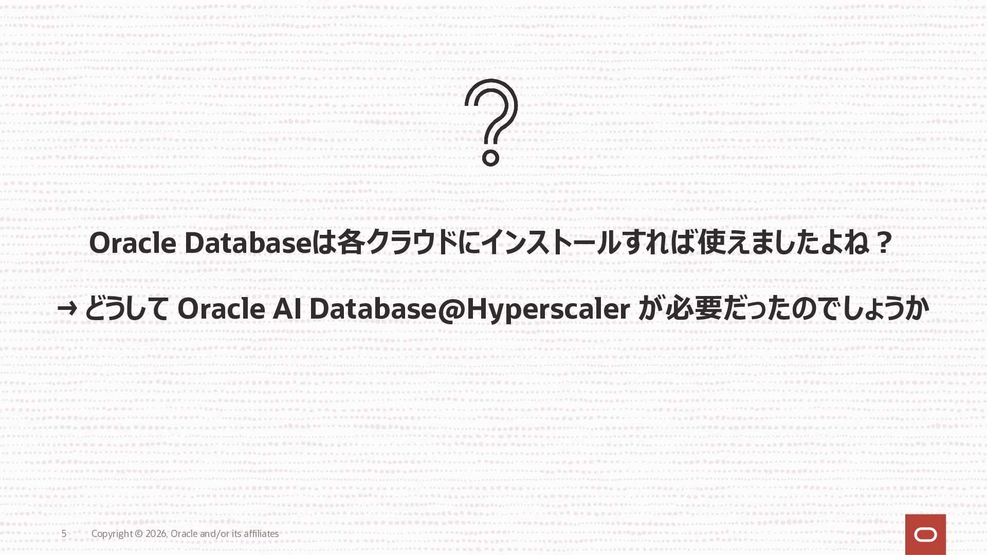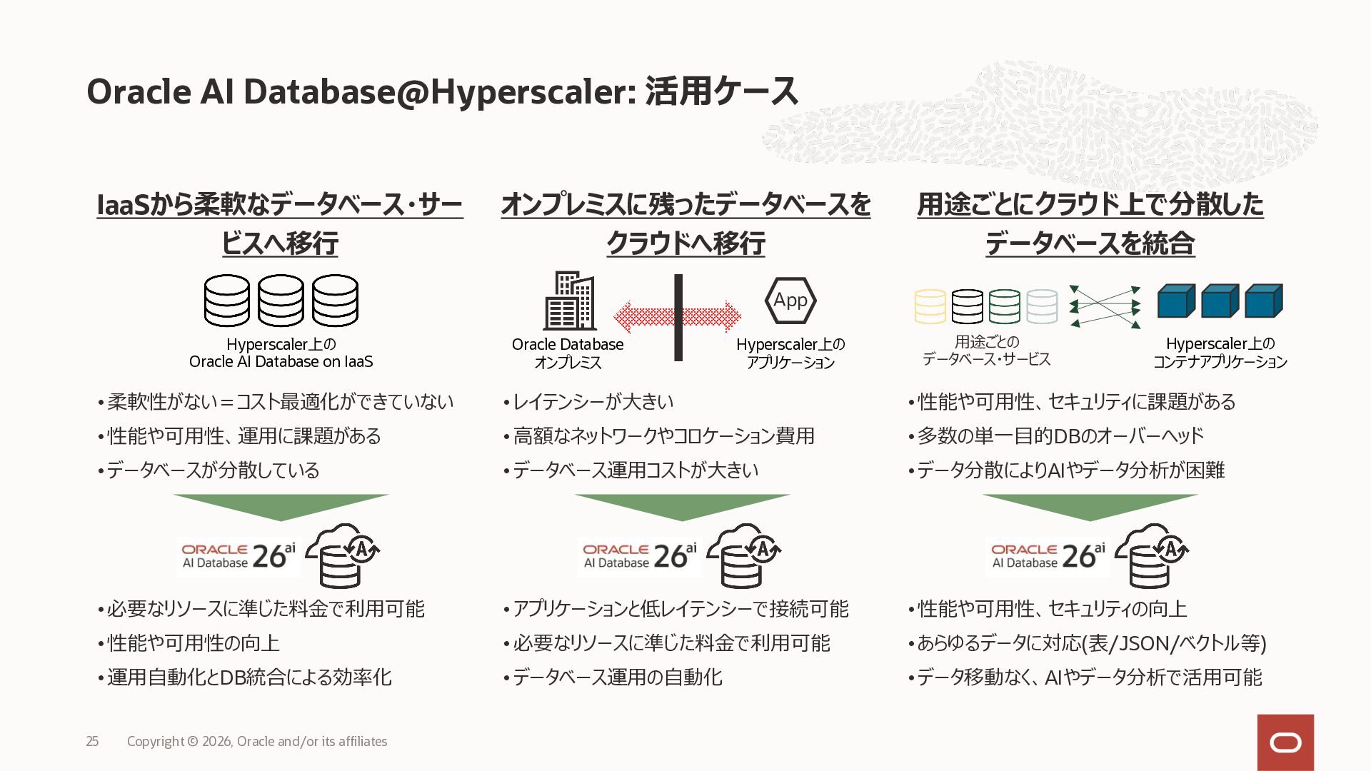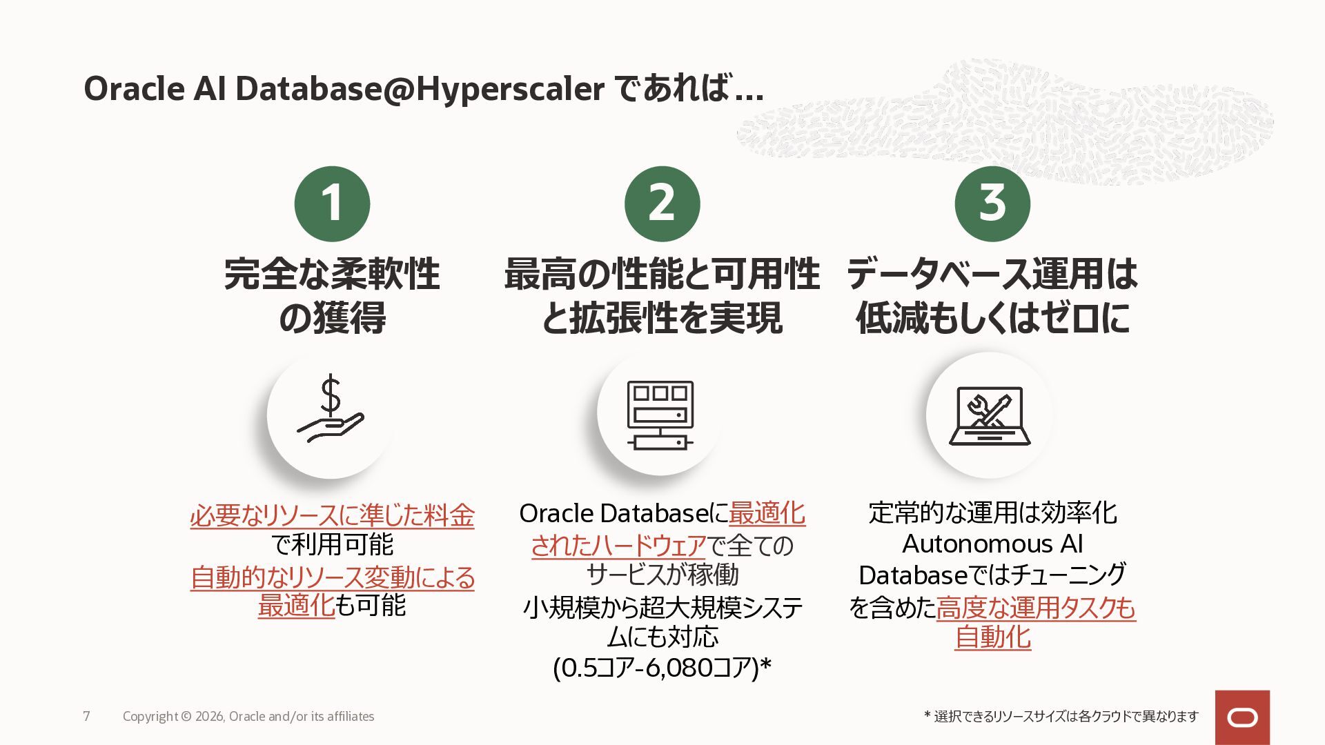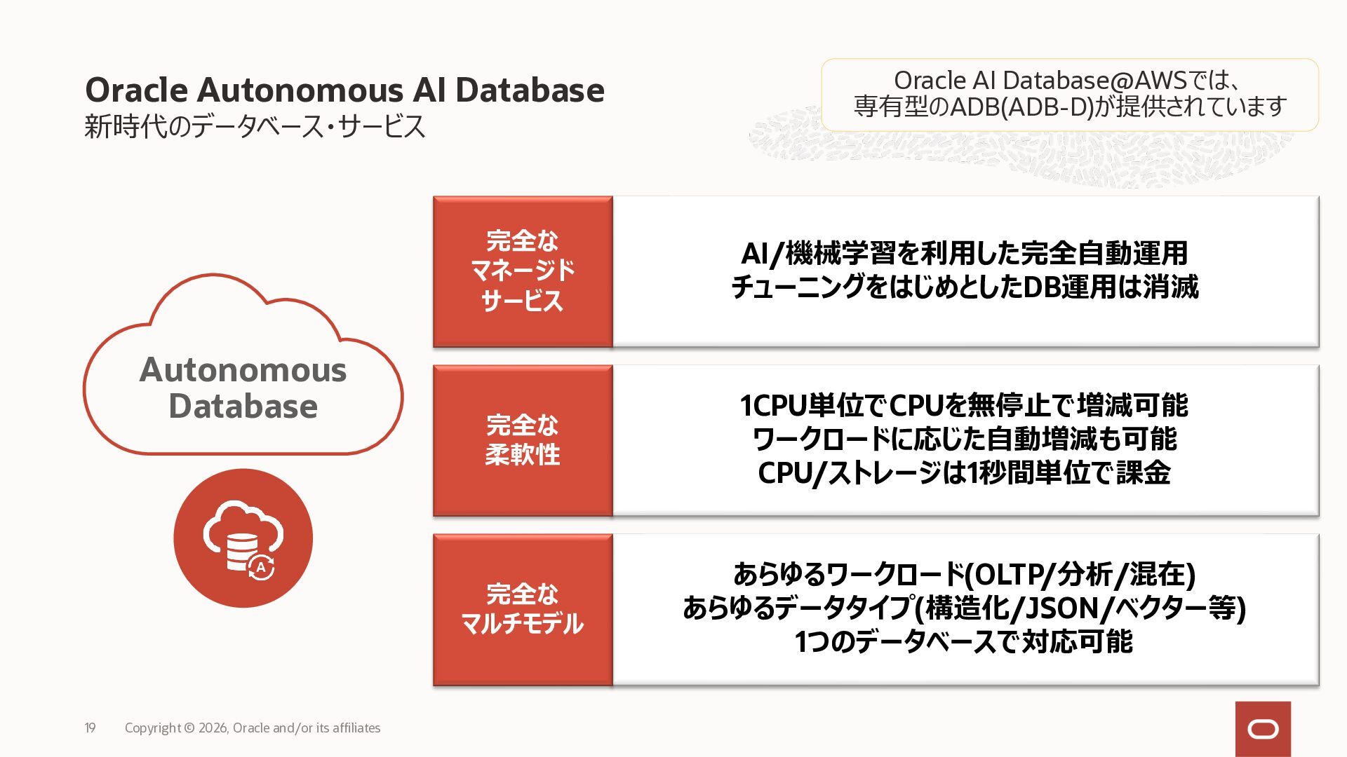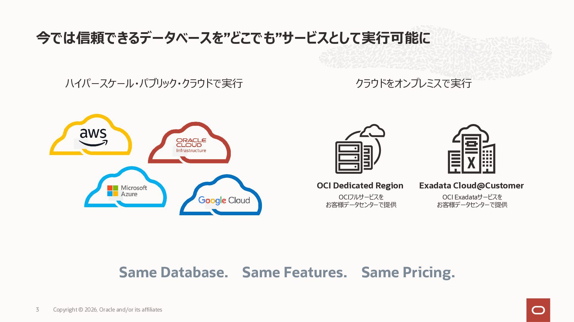 • Exadata Database Service on Dedicated Infrastructure(ExaDB-D) • Exadata Database Service on Exascale Infrastructure(ExaDB-XS) • Base Database Service(BaseDB) • Autonomous AI Database Serverless(ADB-S) • Autonomous AI Database on Dedicated Infrastructure(ADB-D) • Oracle Database Zero Data Loss Autonomous Recovery Service(ZRCV) • OCI GoldenGate(GG) • Azure東⽇本︓ExaDB-D, ExaDB-XS, ADB-D, ADB-S, BaseDB, ZRCV, GG • Azure⻄⽇本︓ExaDB-D, ExaDB-XS, ADB-D, ADB-S, BaseDB, ZRCV, GG • Google Cloud東京︓ExaDB-D, ExaDB-XS, ADB-S, BaseDB, ZRCV • Google Cloud⼤阪︓ExaDB-D, ADB-S • AWS東京︓ExaDB-D, ADB-D, ZRCV OCIで利⽤する場合と料⾦に違いはありますか • OCIで利⽤する場合と同じサービス料⾦です OCIで利⽤する場合と機能に違いはありますか • 同⼀のサービス/機能を提供するという⽅針になりますが、⼀時的に機能差があ ることはあります。詳細はこちらをご覧ください(Servicesタブ) 既存のOracle Databaseライセンスを使⽤できますか • はい、使⽤可能です Oracle Support Rewardsを利⽤できますか • はい、利⽤可能です データベース・サービスはどのように管理できますか • オラクルは各クラウド・プロバイダーと連携し、各クラウド・ポータルでOracle Database インスタンスのデプロイ、管理、使⽤するためエクスペリエンスを提供し ています。⼀部のデータベース操作はOCIコンソールから実⾏します ディザスタ・リカバリ(DR)構成はどのように構築できますか • 複数のリージョンもしくは可⽤性ゾーンの間で、Oracle Data Guardを利⽤し、 データ保護とDRを実現できます SLAは設定されていますか • はい、OCIで提供されている場合と同様です(ドキュメント) Oracle AI Database@Hyperscaler: よくある質問 (2026年4⽉現在) Copyright © 2026, Oracle and/or its affiliates 26
