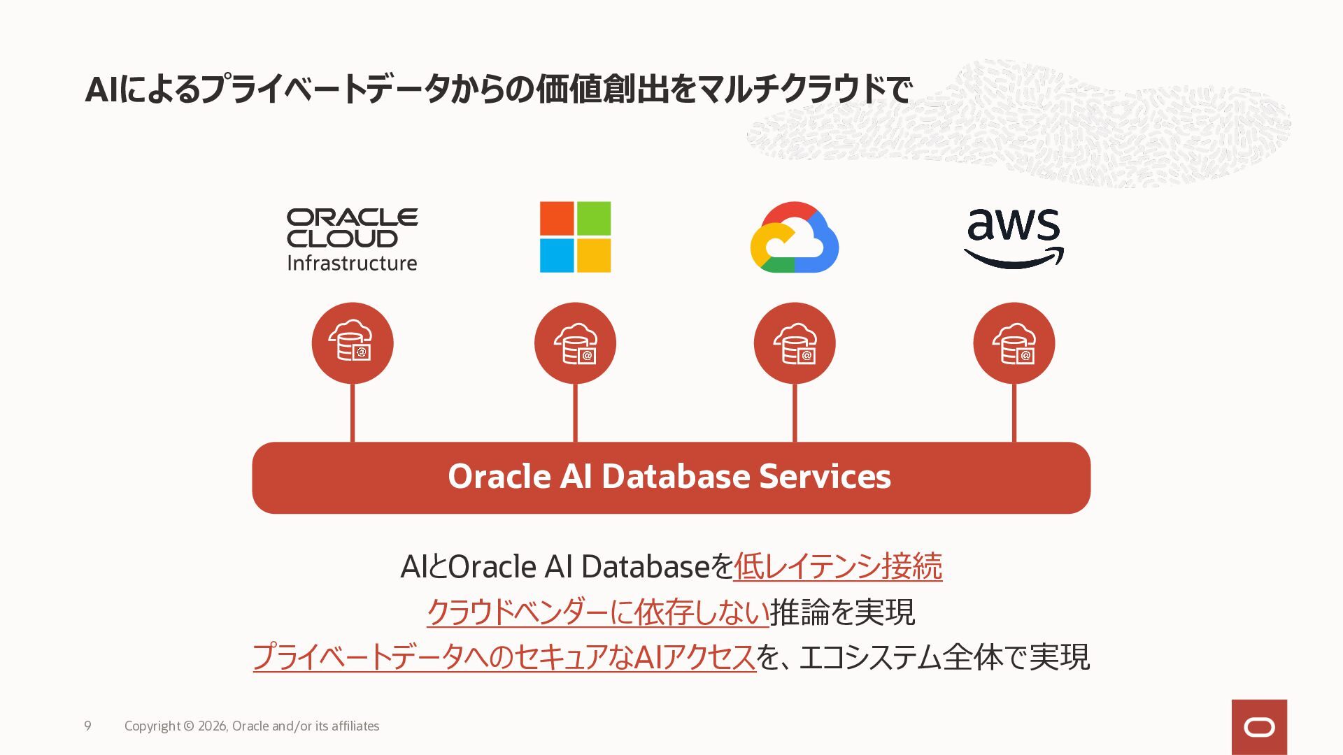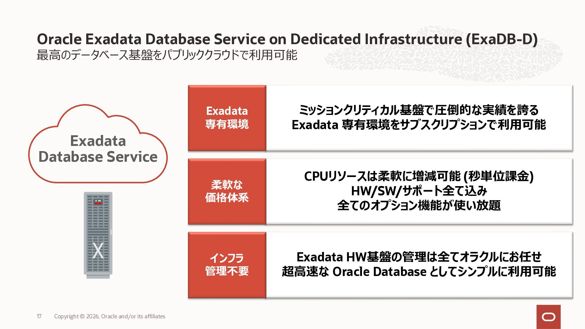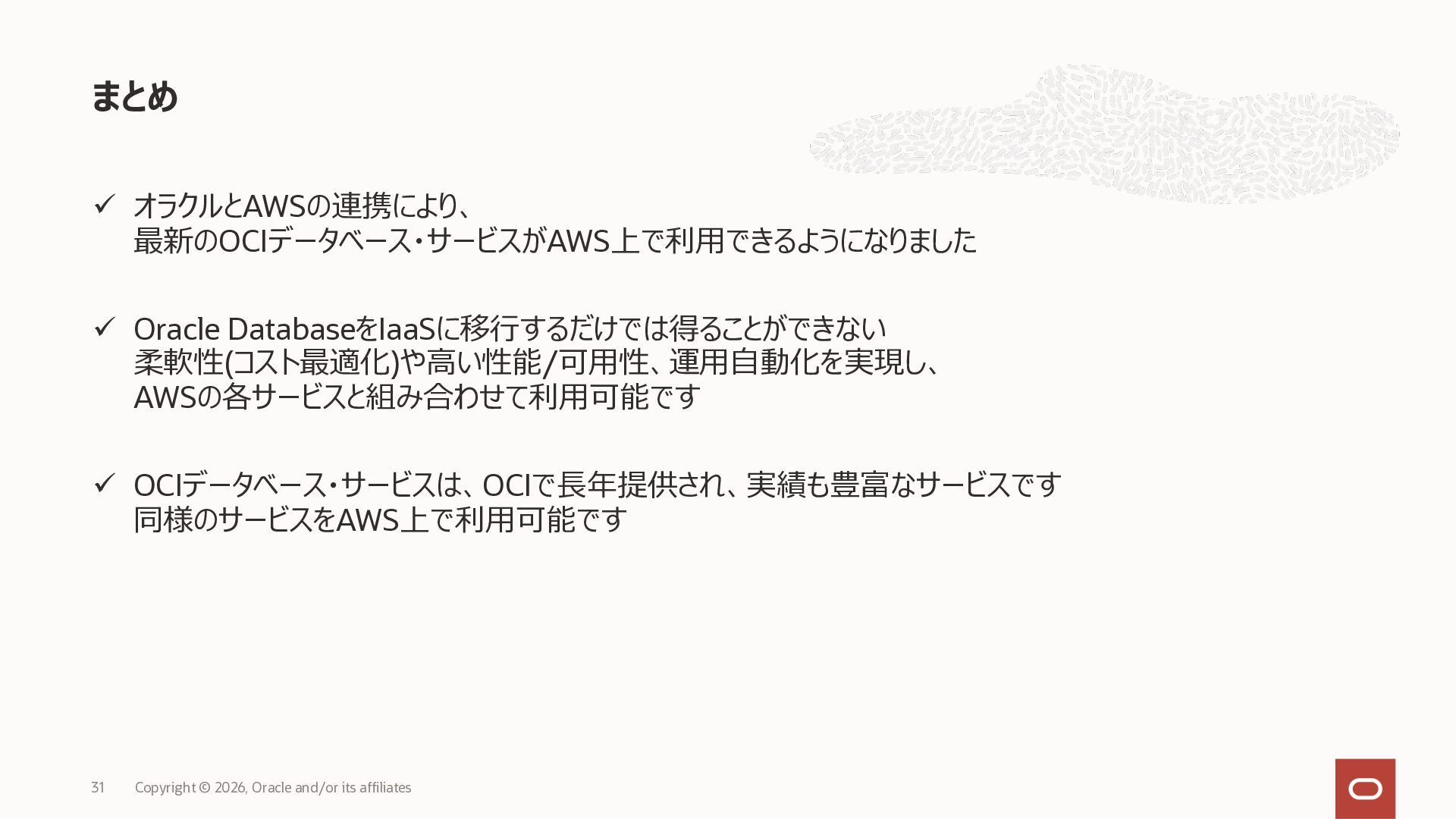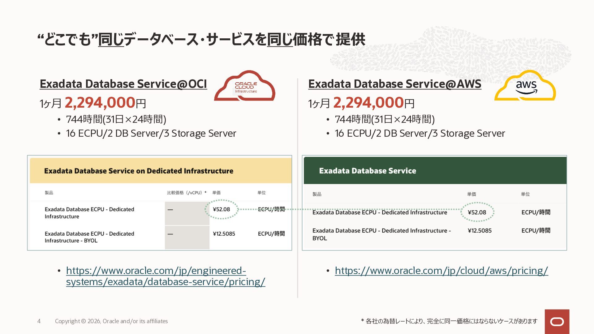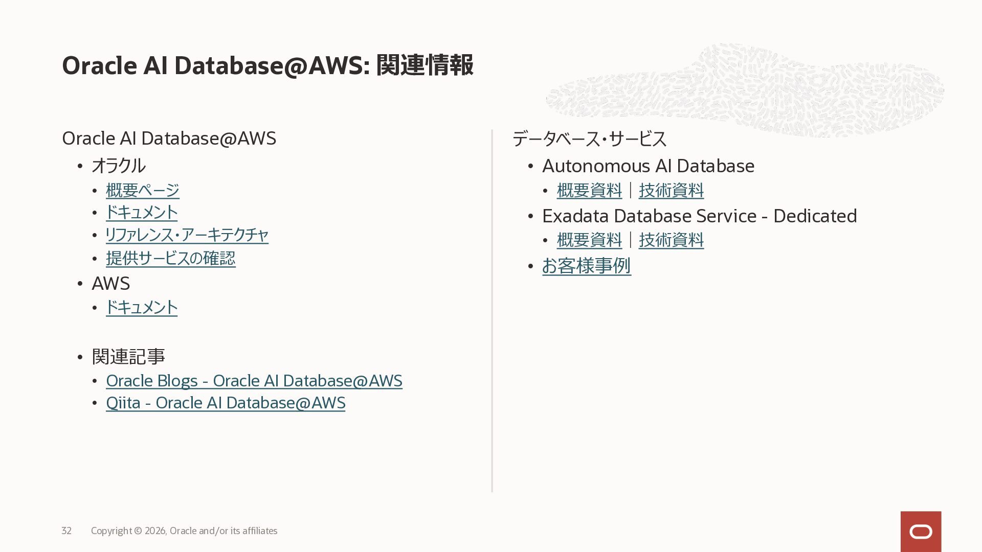 • Exadata Database Service on Dedicated Infrastructure(ExaDB-D) • Exadata Database Service on Exascale Infrastructure(ExaDB-XS) • Base Database Service(BaseDB) • Autonomous AI Database Serverless(ADB-S) • Autonomous AI Database on Dedicated Infrastructure(ADB-D) • Oracle Database Zero Data Loss Autonomous Recovery Service(ZRCV) • OCI GoldenGate(GG) • Azure東⽇本︓ExaDB-D, ExaDB-XS, ADB-D, ADB-S, BaseDB, ZRCV, GG • Azure⻄⽇本︓ExaDB-D, ExaDB-XS, ADB-D, ADB-S, BaseDB, ZRCV, GG • Google Cloud東京︓ExaDB-D, ExaDB-XS, ADB-S, BaseDB, ZRCV • Google Cloud⼤阪︓ExaDB-D, ADB-S • AWS東京︓ExaDB-D, ADB-D, ZRCV OCIで利⽤する場合と料⾦に違いはありますか • OCIで利⽤する場合と同じサービス料⾦です OCIで利⽤する場合と機能に違いはありますか • 同⼀のサービス/機能を提供するという⽅針になりますが、⼀時的に機能差があ ることはあります。詳細はこちらをご覧ください(Servicesタブ) 既存のOracle Databaseライセンスを使⽤できますか • はい、使⽤可能です Oracle Support Rewardsを利⽤できますか • はい、利⽤可能です データベース・サービスはどのように管理できますか • オラクルは各クラウド・プロバイダーと連携し、各クラウド・ポータルでOracle Database インスタンスのデプロイ、管理、使⽤するためエクスペリエンスを提供し ています。⼀部のデータベース操作はOCIコンソールから実⾏します ディザスタ・リカバリ(DR)構成はどのように構築できますか • 複数のリージョンもしくは可⽤性ゾーンの間で、Oracle Data Guardを利⽤し、 データ保護とDRを実現できます SLAは設定されていますか • はい、OCIで提供されている場合と同様です(ドキュメント) Oracle AI Database@Hyperscaler: よくある質問 (2026年4⽉現在) Copyright © 2026, Oracle and/or its affiliates 26