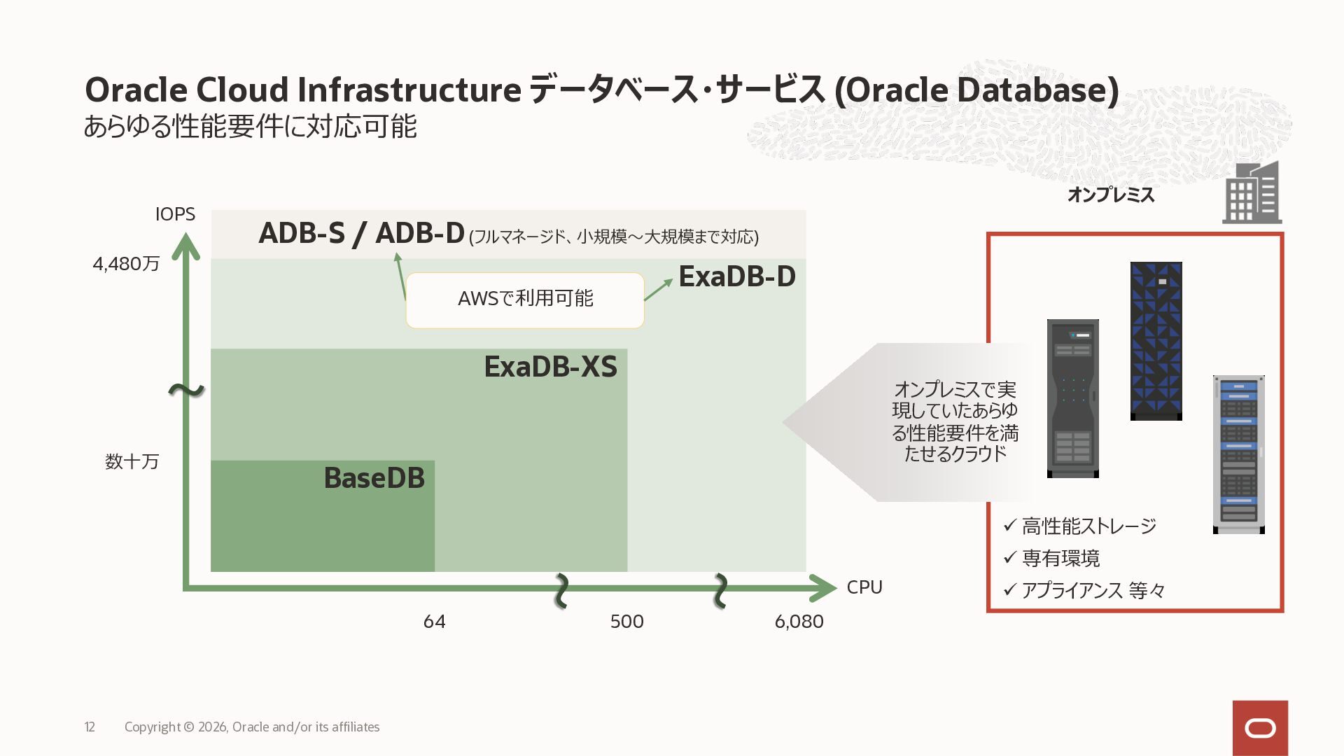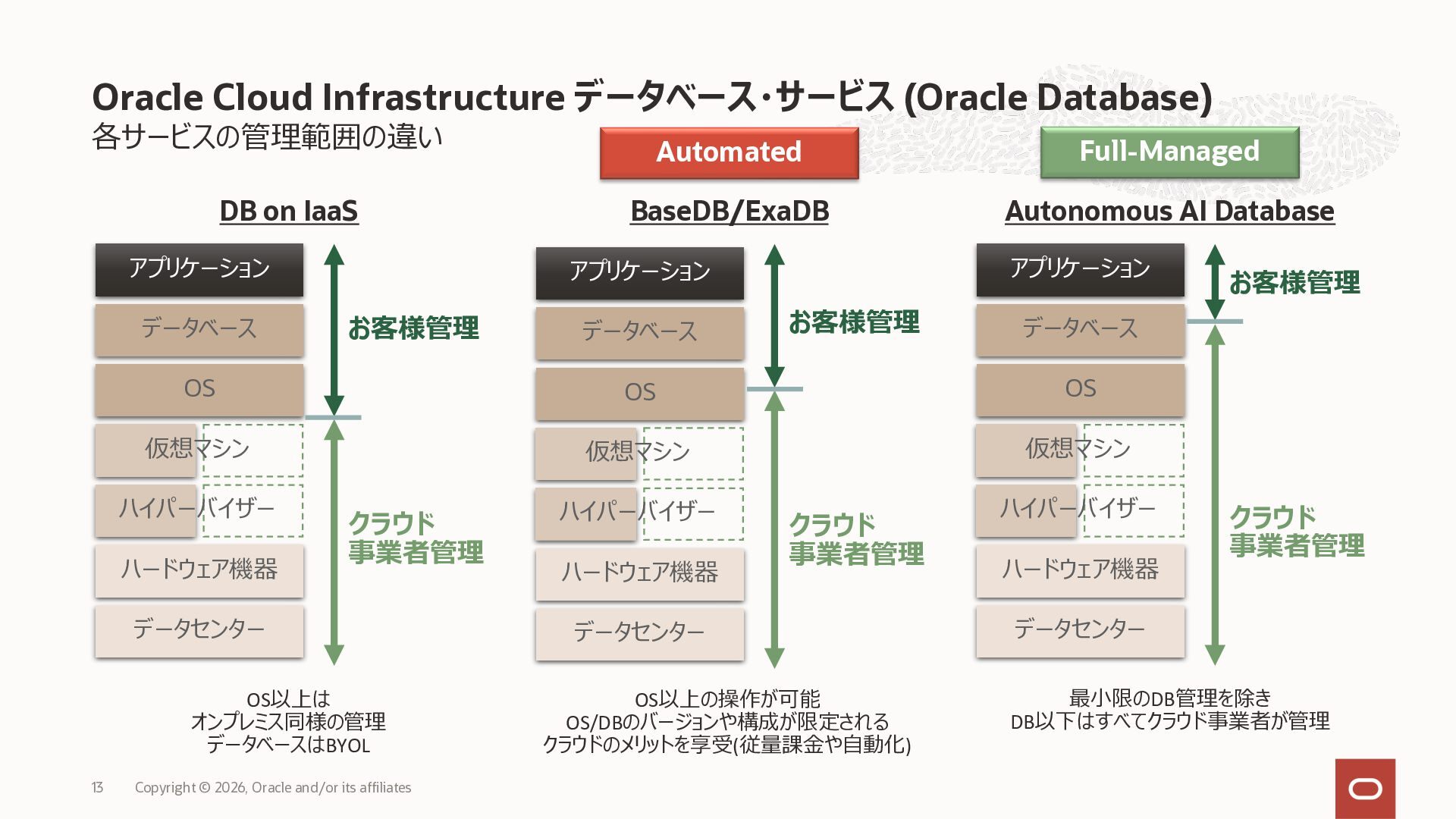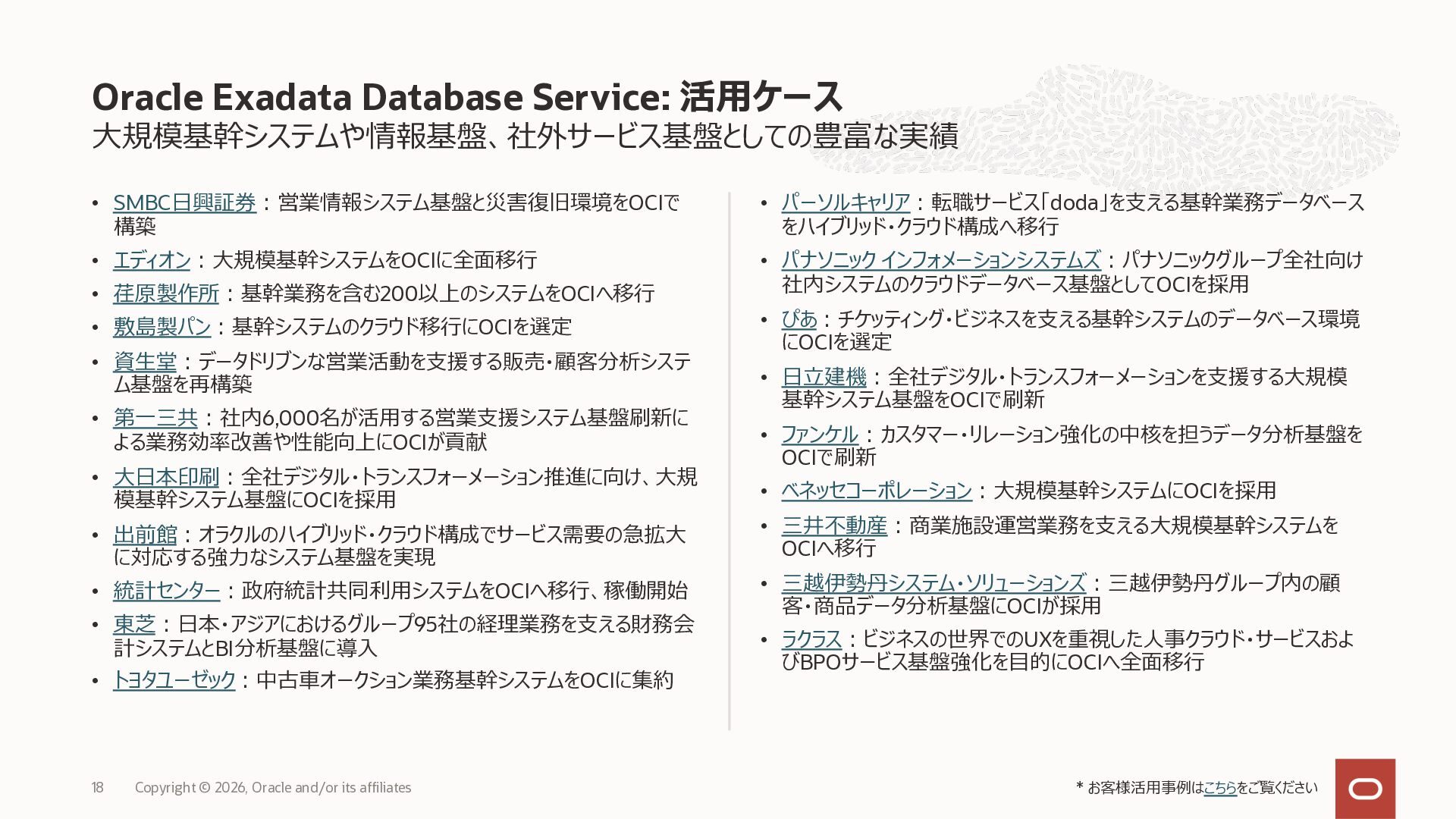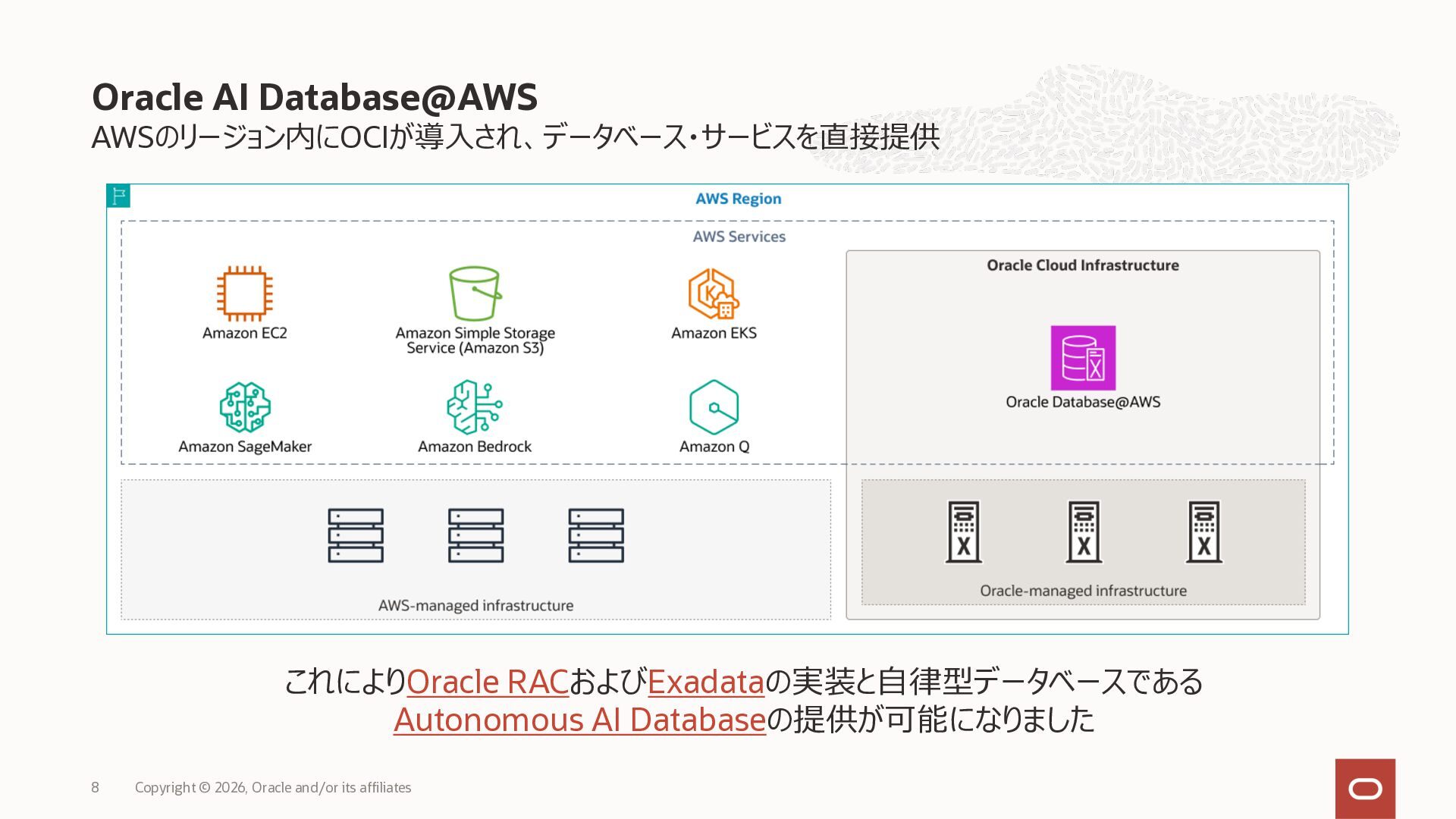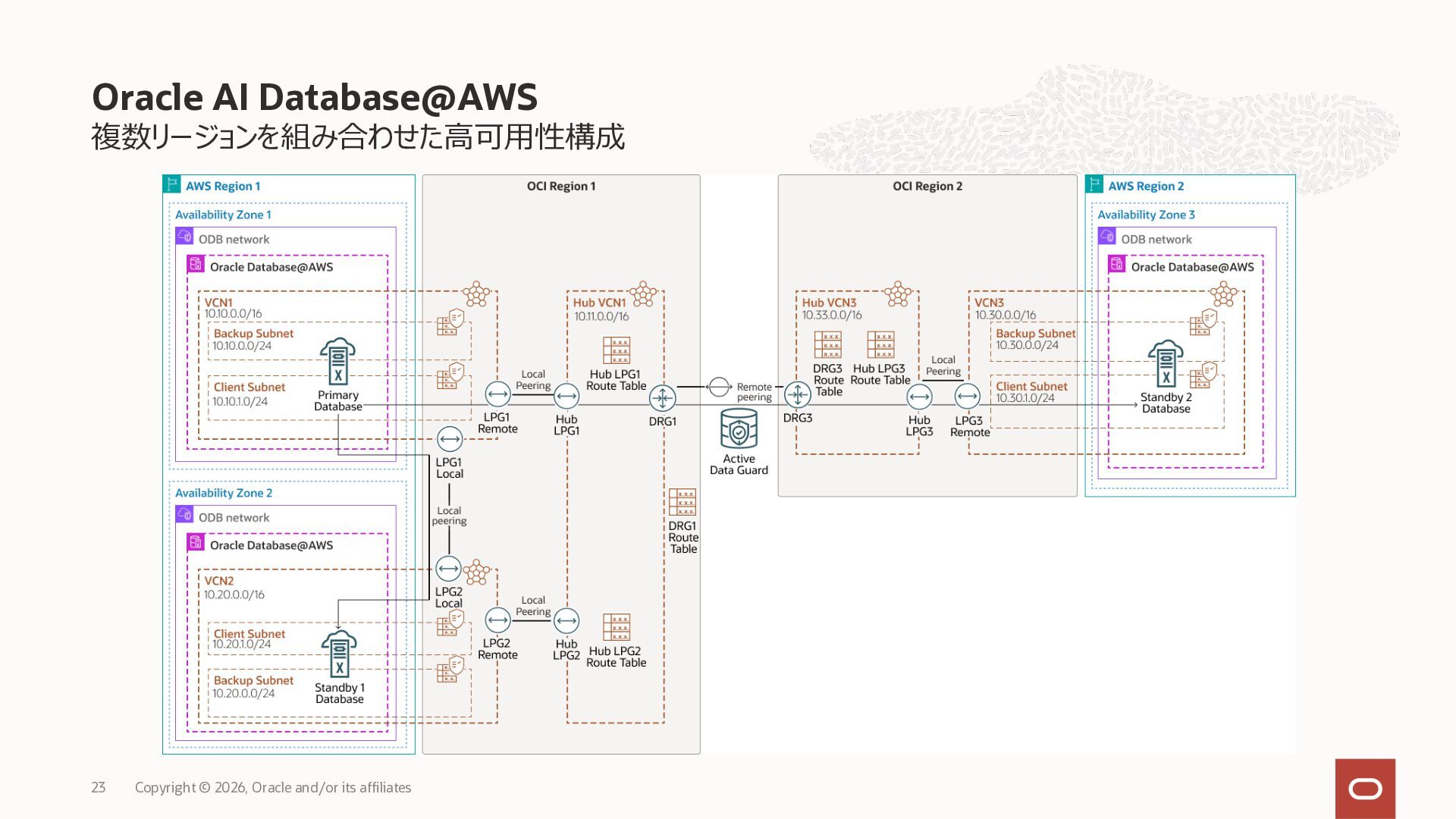 • Exadata Database Service on Dedicated Infrastructure(ExaDB-D) • Exadata Database Service on Exascale Infrastructure(ExaDB-XS) • Base Database Service(BaseDB) • Autonomous AI Database Serverless(ADB-S) • Autonomous AI Database on Dedicated Infrastructure(ADB-D) • Oracle Database Zero Data Loss Autonomous Recovery Service(ZRCV) • OCI GoldenGate(GG) • Azure東⽇本︓ExaDB-D, ExaDB-XS, ADB-D, ADB-S, BaseDB, ZRCV, GG • Azure⻄⽇本︓ExaDB-D, ExaDB-XS, ADB-D, ADB-S, BaseDB, ZRCV, GG • Google Cloud東京︓ExaDB-D, ExaDB-XS, ADB-S, BaseDB, ZRCV • Google Cloud⼤阪︓ExaDB-D, ADB-S • AWS東京︓ExaDB-D, ADB-D, ZRCV OCIで利⽤する場合と料⾦に違いはありますか • OCIで利⽤する場合と同じサービス料⾦です OCIで利⽤する場合と機能に違いはありますか • 同⼀のサービス/機能を提供するという⽅針になりますが、⼀時的に機能差があ ることはあります。詳細はこちらをご覧ください(Servicesタブ) 既存のOracle Databaseライセンスを使⽤できますか • はい、使⽤可能です Oracle Support Rewardsを利⽤できますか • はい、利⽤可能です データベース・サービスはどのように管理できますか • オラクルは各クラウド・プロバイダーと連携し、各クラウド・ポータルでOracle Database インスタンスのデプロイ、管理、使⽤するためエクスペリエンスを提供し ています。⼀部のデータベース操作はOCIコンソールから実⾏します ディザスタ・リカバリ(DR)構成はどのように構築できますか • 複数のリージョンもしくは可⽤性ゾーンの間で、Oracle Data Guardを利⽤し、 データ保護とDRを実現できます SLAは設定されていますか • はい、OCIで提供されている場合と同様です(ドキュメント) Oracle AI Database@Hyperscaler: よくある質問 (2026年4⽉現在) Copyright © 2026, Oracle and/or its affiliates 26