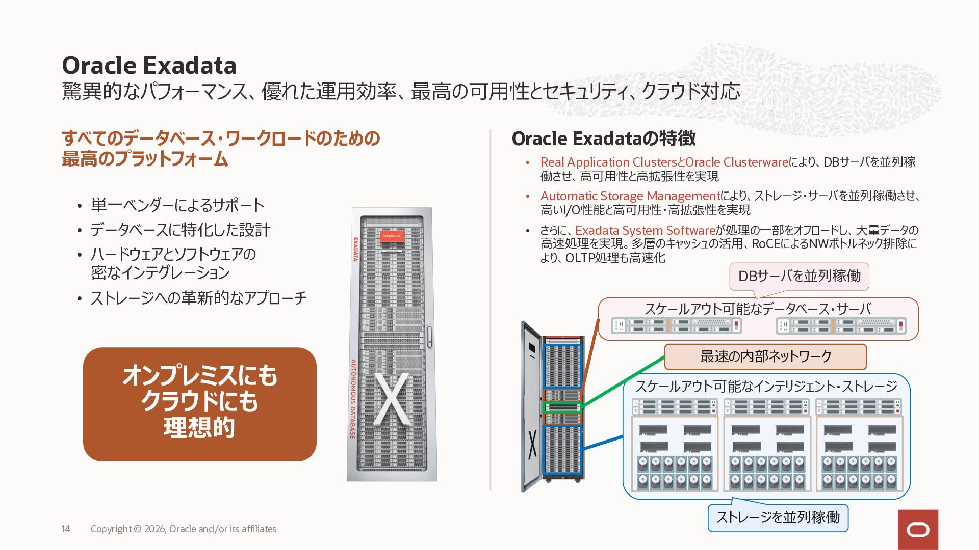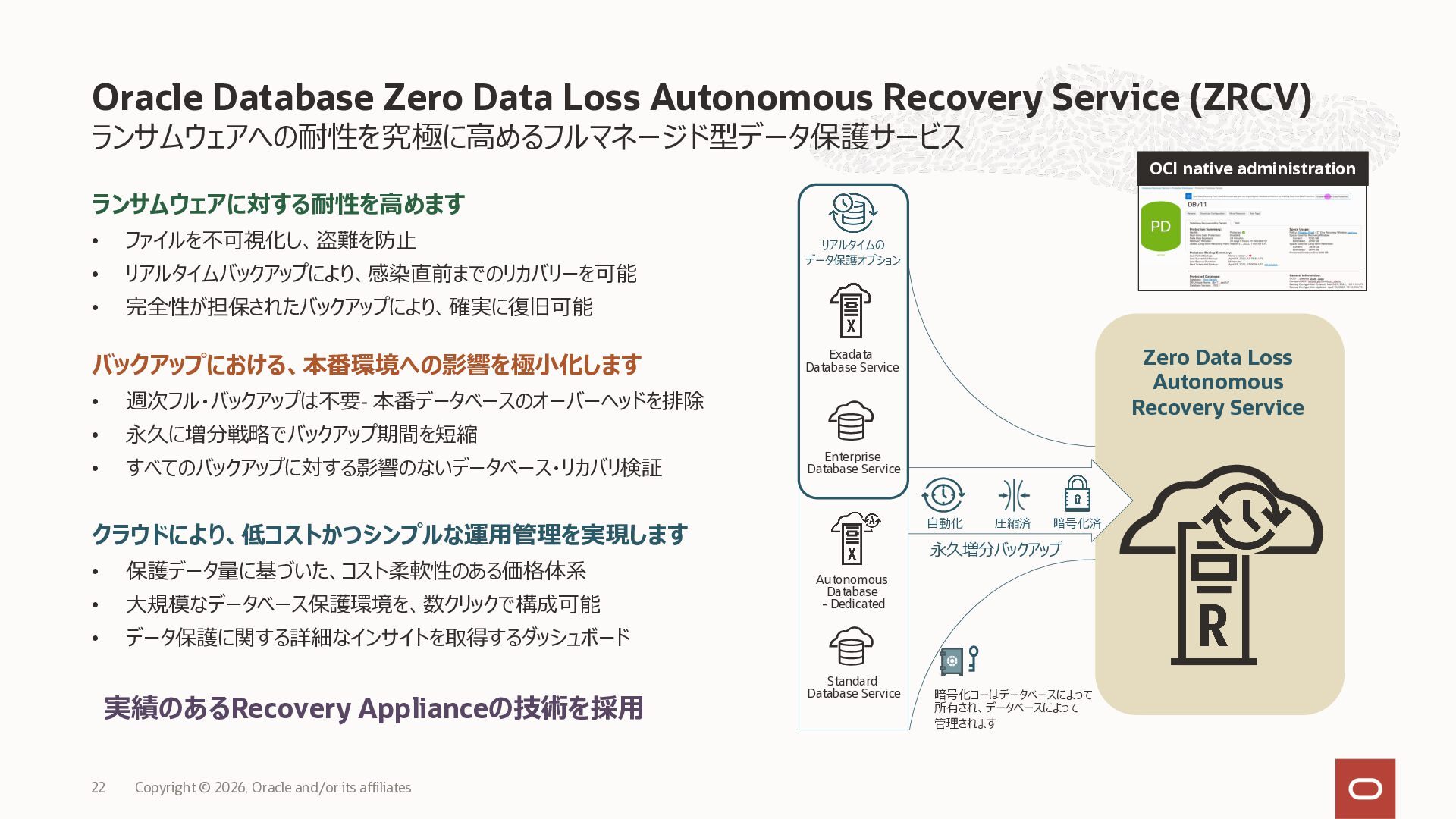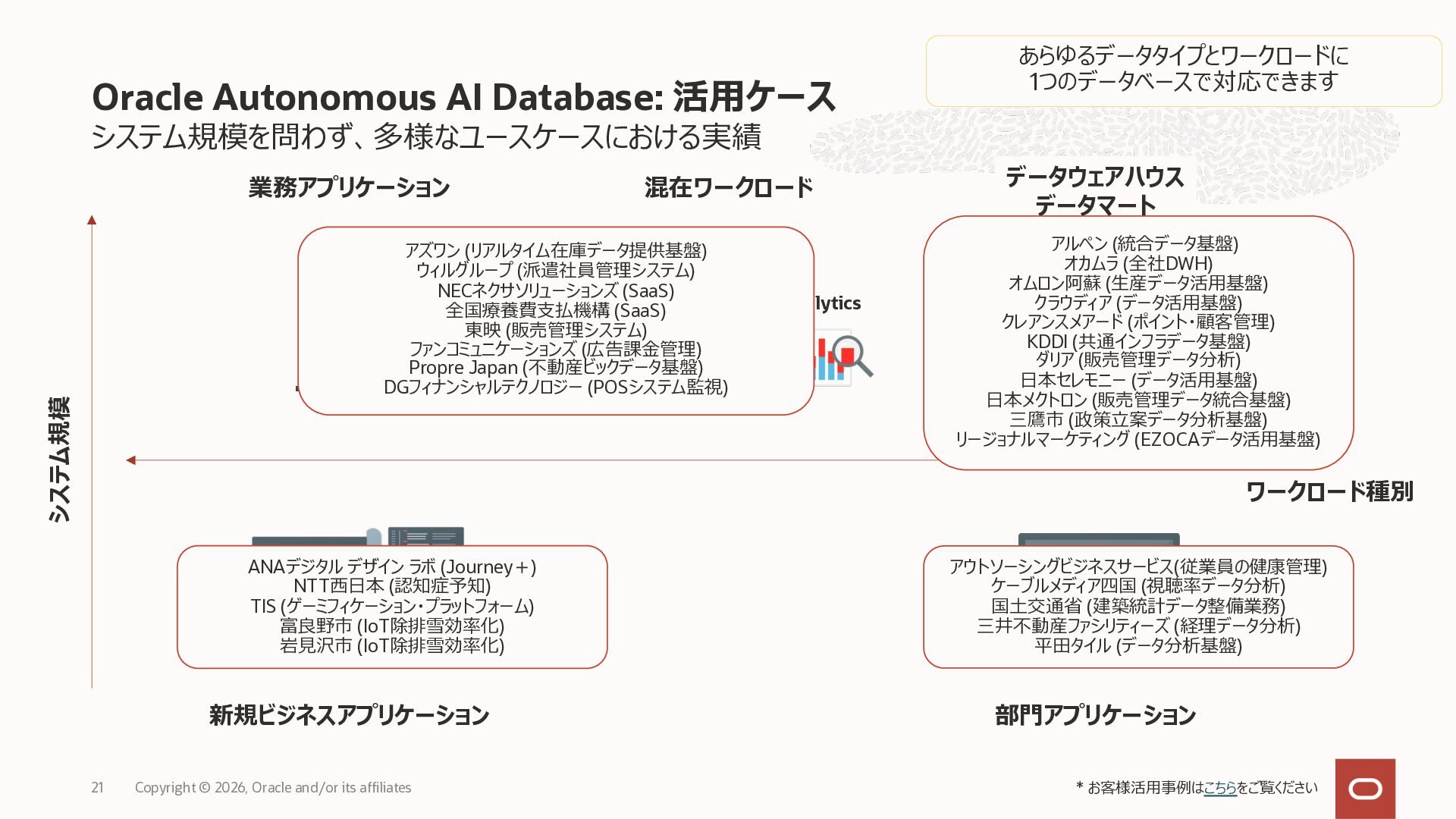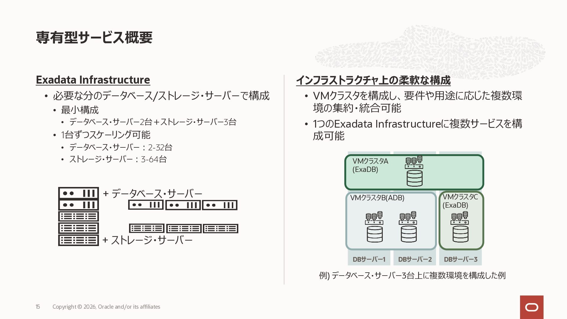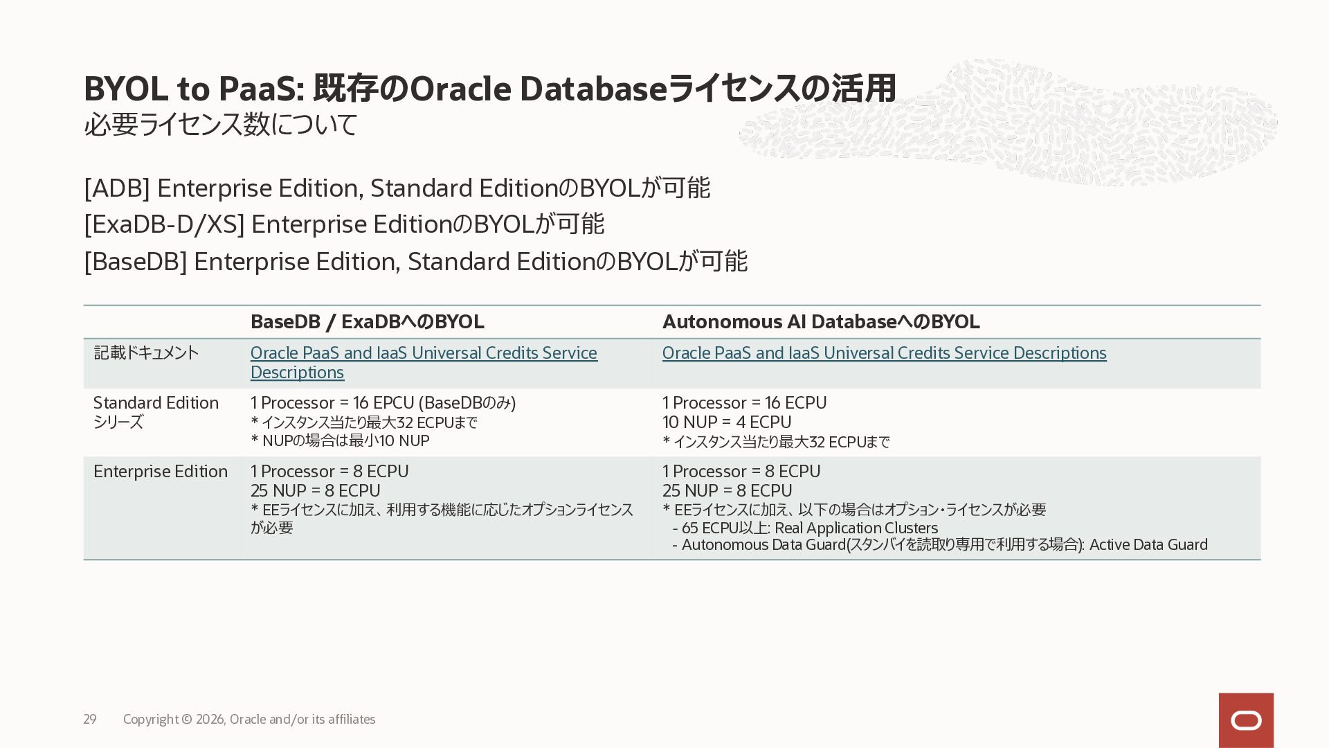 • Exadata Database Service on Dedicated Infrastructure(ExaDB-D) • Exadata Database Service on Exascale Infrastructure(ExaDB-XS) • Base Database Service(BaseDB) • Autonomous AI Database Serverless(ADB-S) • Autonomous AI Database on Dedicated Infrastructure(ADB-D) • Oracle Database Zero Data Loss Autonomous Recovery Service(ZRCV) • OCI GoldenGate(GG) • Azure東⽇本︓ExaDB-D, ExaDB-XS, ADB-D, ADB-S, BaseDB, ZRCV, GG • Azure⻄⽇本︓ExaDB-D, ExaDB-XS, ADB-D, ADB-S, BaseDB, ZRCV, GG • Google Cloud東京︓ExaDB-D, ExaDB-XS, ADB-S, BaseDB, ZRCV • Google Cloud⼤阪︓ExaDB-D, ADB-S • AWS東京︓ExaDB-D, ADB-D, ZRCV OCIで利⽤する場合と料⾦に違いはありますか • OCIで利⽤する場合と同じサービス料⾦です OCIで利⽤する場合と機能に違いはありますか • 同⼀のサービス/機能を提供するという⽅針になりますが、⼀時的に機能差があ ることはあります。詳細はこちらをご覧ください(Servicesタブ) 既存のOracle Databaseライセンスを使⽤できますか • はい、使⽤可能です Oracle Support Rewardsを利⽤できますか • はい、利⽤可能です データベース・サービスはどのように管理できますか • オラクルは各クラウド・プロバイダーと連携し、各クラウド・ポータルでOracle Database インスタンスのデプロイ、管理、使⽤するためエクスペリエンスを提供し ています。⼀部のデータベース操作はOCIコンソールから実⾏します ディザスタ・リカバリ(DR)構成はどのように構築できますか • 複数のリージョンもしくは可⽤性ゾーンの間で、Oracle Data Guardを利⽤し、 データ保護とDRを実現できます SLAは設定されていますか • はい、OCIで提供されている場合と同様です(ドキュメント) Oracle AI Database@Hyperscaler: よくある質問 (2026年4⽉現在) Copyright © 2026, Oracle and/or its affiliates 26
