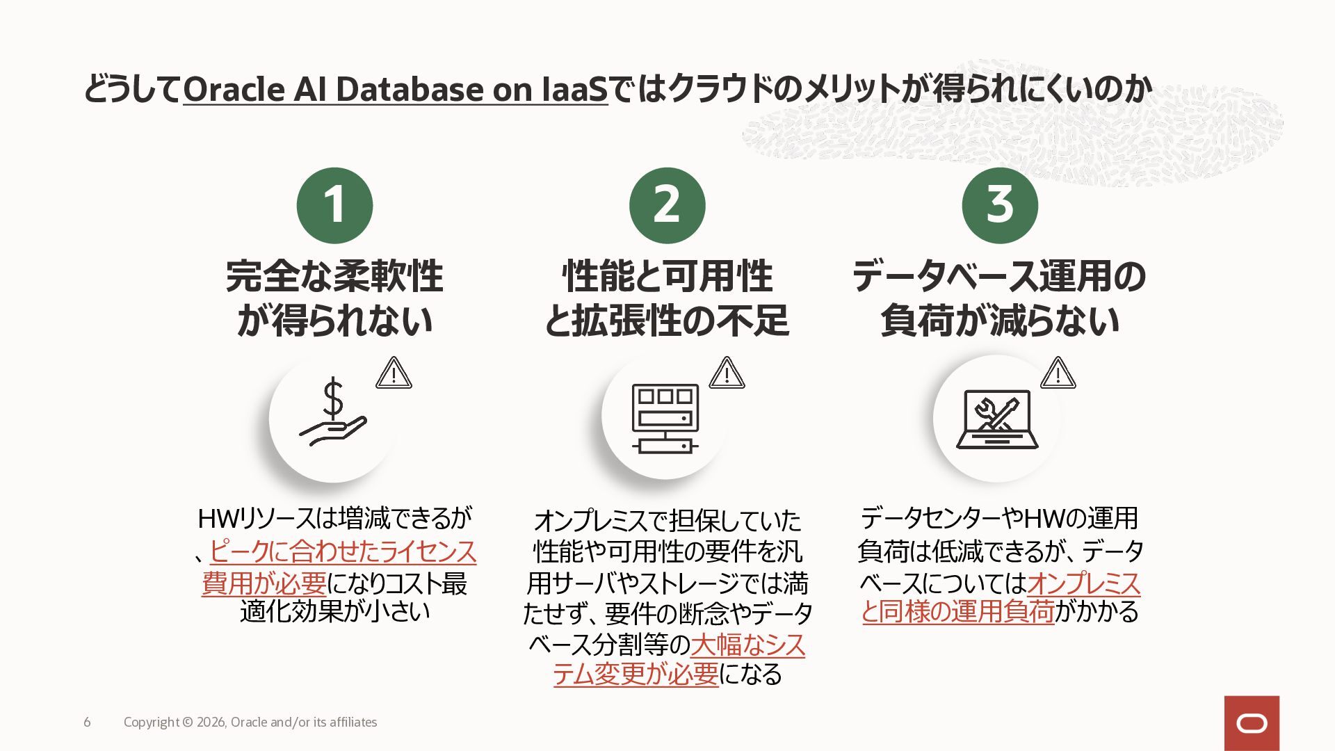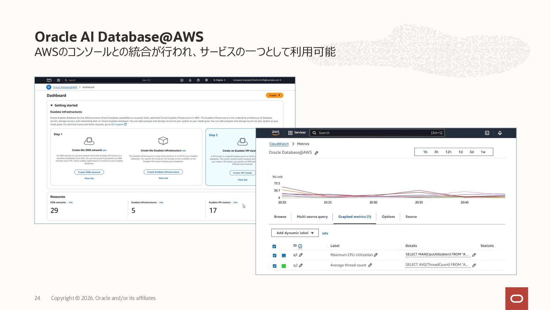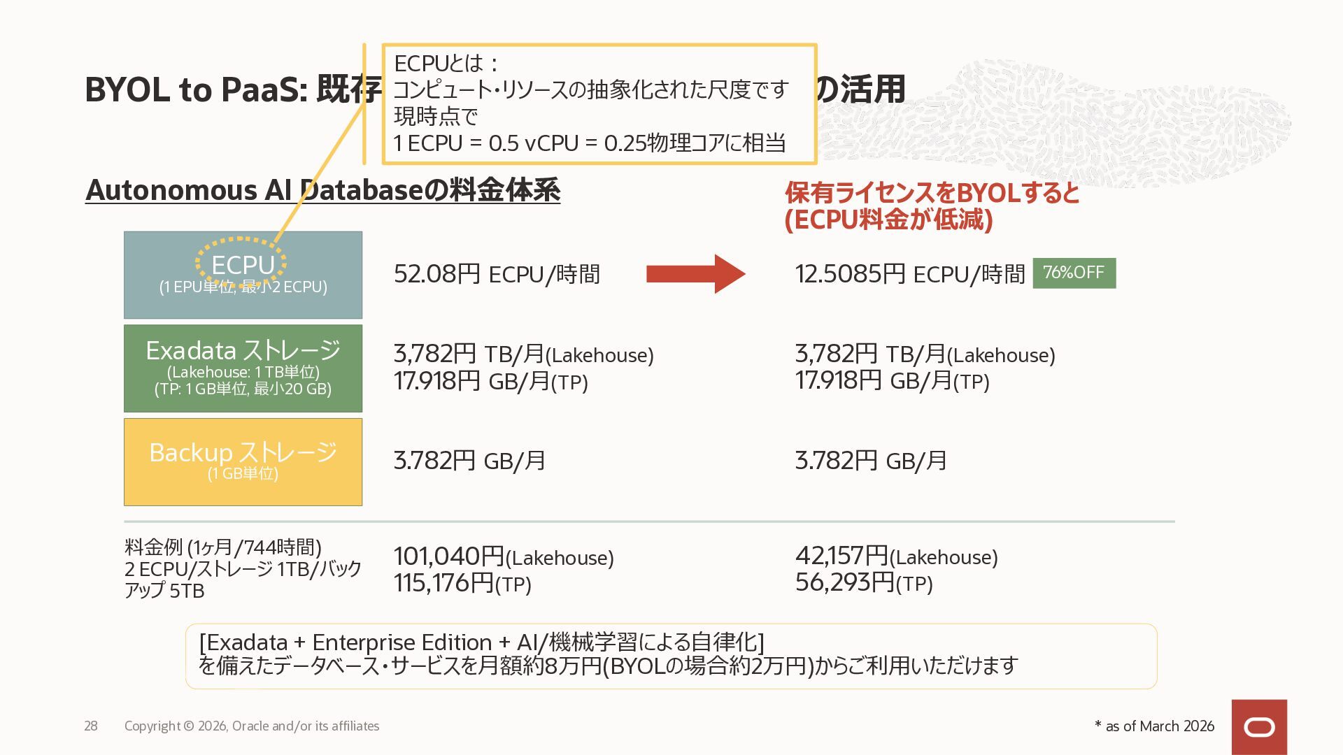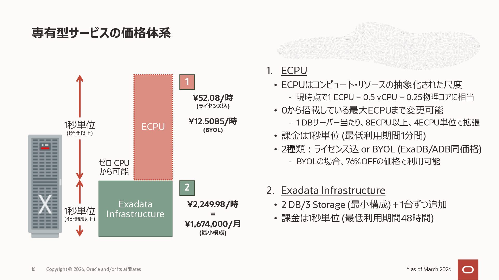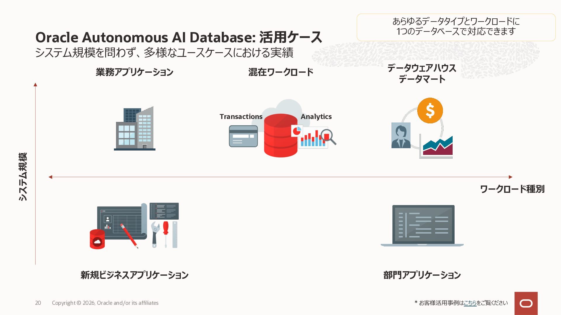 • Exadata Database Service on Dedicated Infrastructure(ExaDB-D) • Exadata Database Service on Exascale Infrastructure(ExaDB-XS) • Base Database Service(BaseDB) • Autonomous AI Database Serverless(ADB-S) • Autonomous AI Database on Dedicated Infrastructure(ADB-D) • Oracle Database Zero Data Loss Autonomous Recovery Service(ZRCV) • OCI GoldenGate(GG) • Azure東⽇本︓ExaDB-D, ExaDB-XS, ADB-D, ADB-S, BaseDB, ZRCV, GG • Azure⻄⽇本︓ExaDB-D, ExaDB-XS, ADB-D, ADB-S, BaseDB, ZRCV, GG • Google Cloud東京︓ExaDB-D, ExaDB-XS, ADB-S, BaseDB, ZRCV • Google Cloud⼤阪︓ExaDB-D, ADB-S • AWS東京︓ExaDB-D, ADB-D, ZRCV OCIで利⽤する場合と料⾦に違いはありますか • OCIで利⽤する場合と同じサービス料⾦です OCIで利⽤する場合と機能に違いはありますか • 同⼀のサービス/機能を提供するという⽅針になりますが、⼀時的に機能差があ ることはあります。詳細はこちらをご覧ください(Servicesタブ) 既存のOracle Databaseライセンスを使⽤できますか • はい、使⽤可能です Oracle Support Rewardsを利⽤できますか • はい、利⽤可能です データベース・サービスはどのように管理できますか • オラクルは各クラウド・プロバイダーと連携し、各クラウド・ポータルでOracle Database インスタンスのデプロイ、管理、使⽤するためエクスペリエンスを提供し ています。⼀部のデータベース操作はOCIコンソールから実⾏します ディザスタ・リカバリ(DR)構成はどのように構築できますか • 複数のリージョンもしくは可⽤性ゾーンの間で、Oracle Data Guardを利⽤し、 データ保護とDRを実現できます SLAは設定されていますか • はい、OCIで提供されている場合と同様です(ドキュメント) Oracle AI Database@Hyperscaler: よくある質問 (2026年4⽉現在) Copyright © 2026, Oracle and/or its affiliates 26