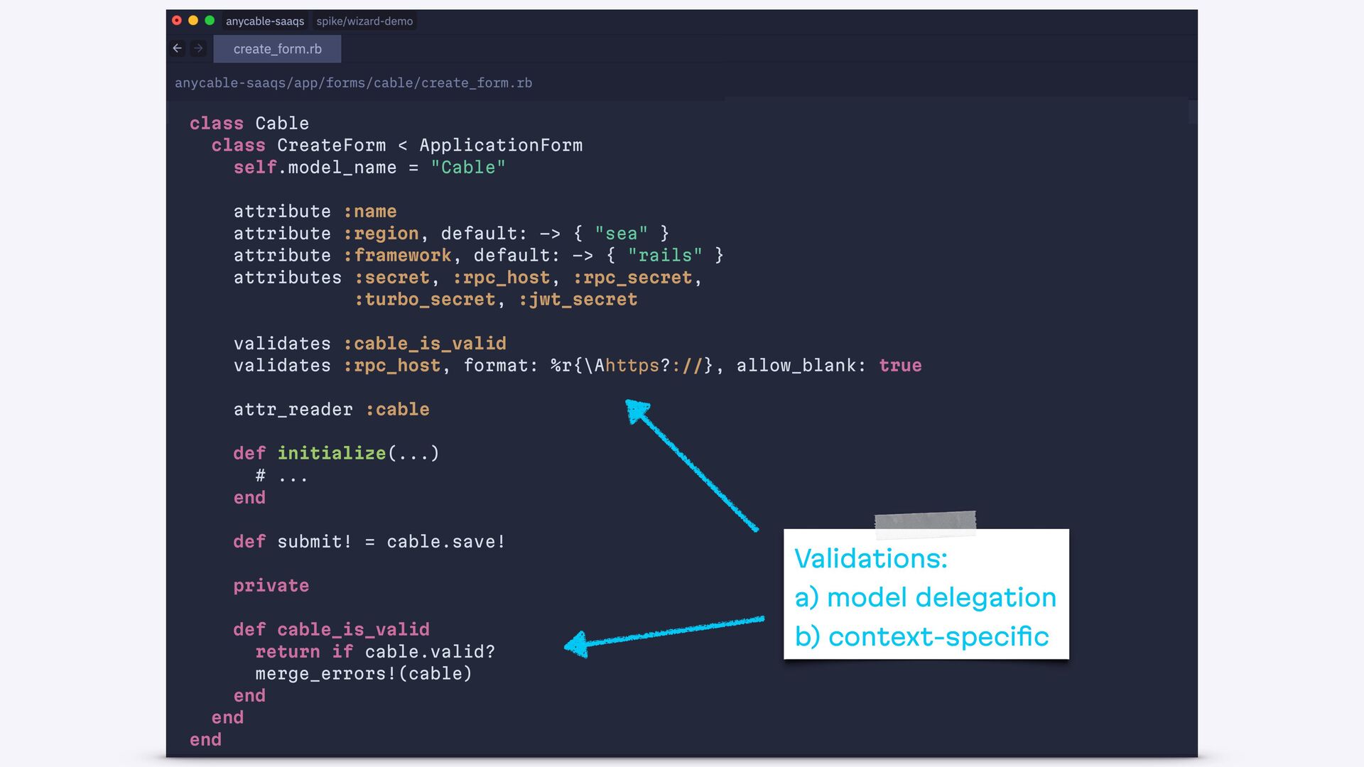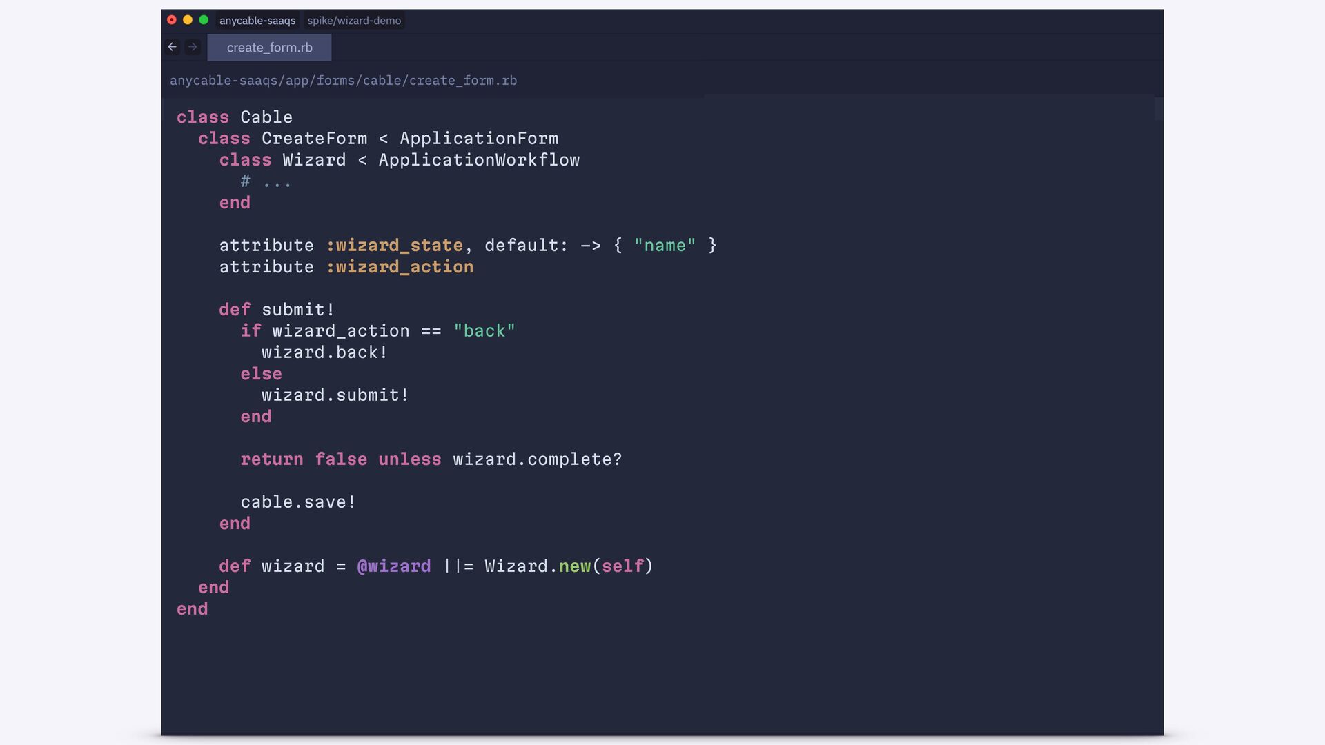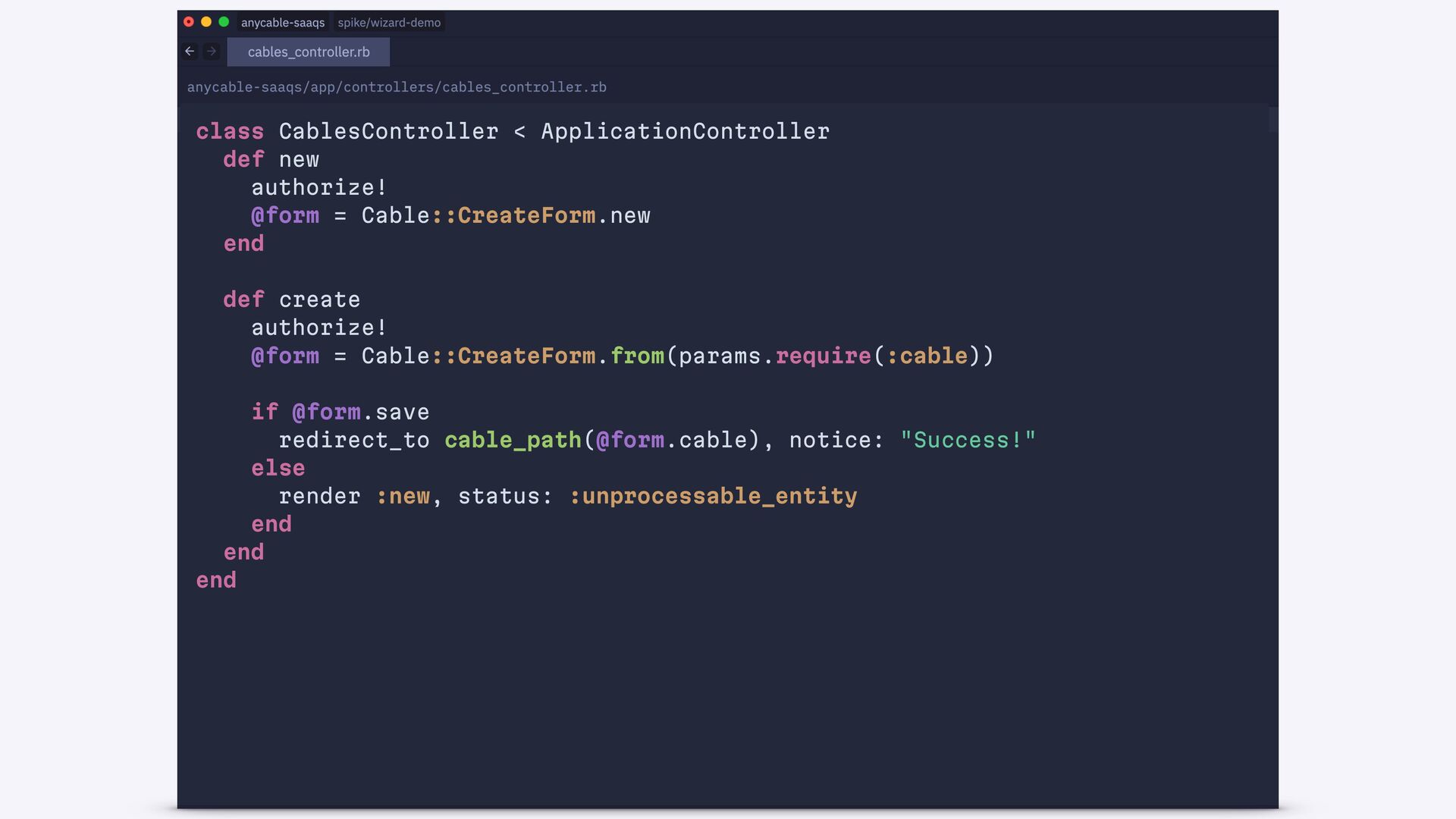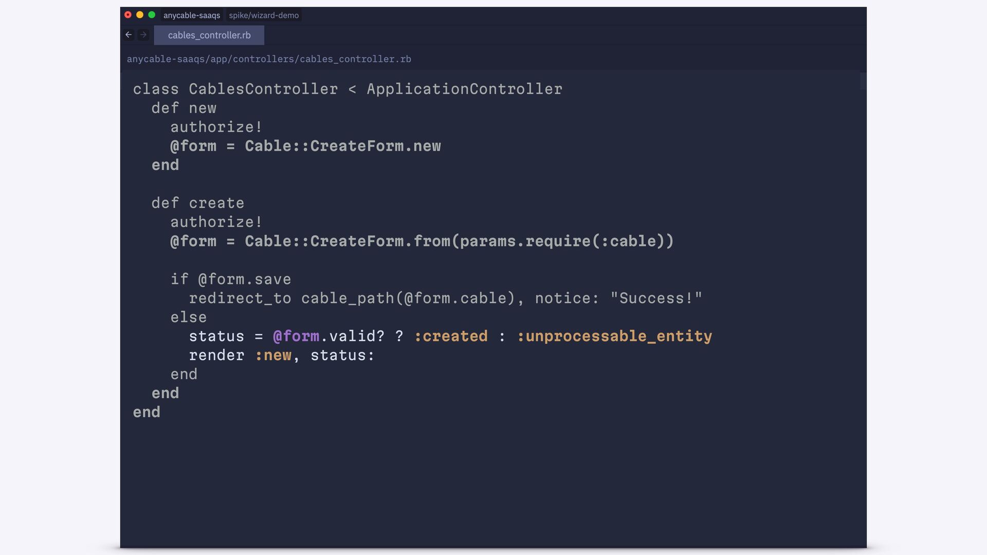 end def create authorize! @form = Cable::CreateForm.from(params.require(:cable)) if @form.save redirect_to cable_path(@form.cable), notice: "Success!" else status = @form.valid? ? :created : :unprocessable_entity render :new, status: end end end