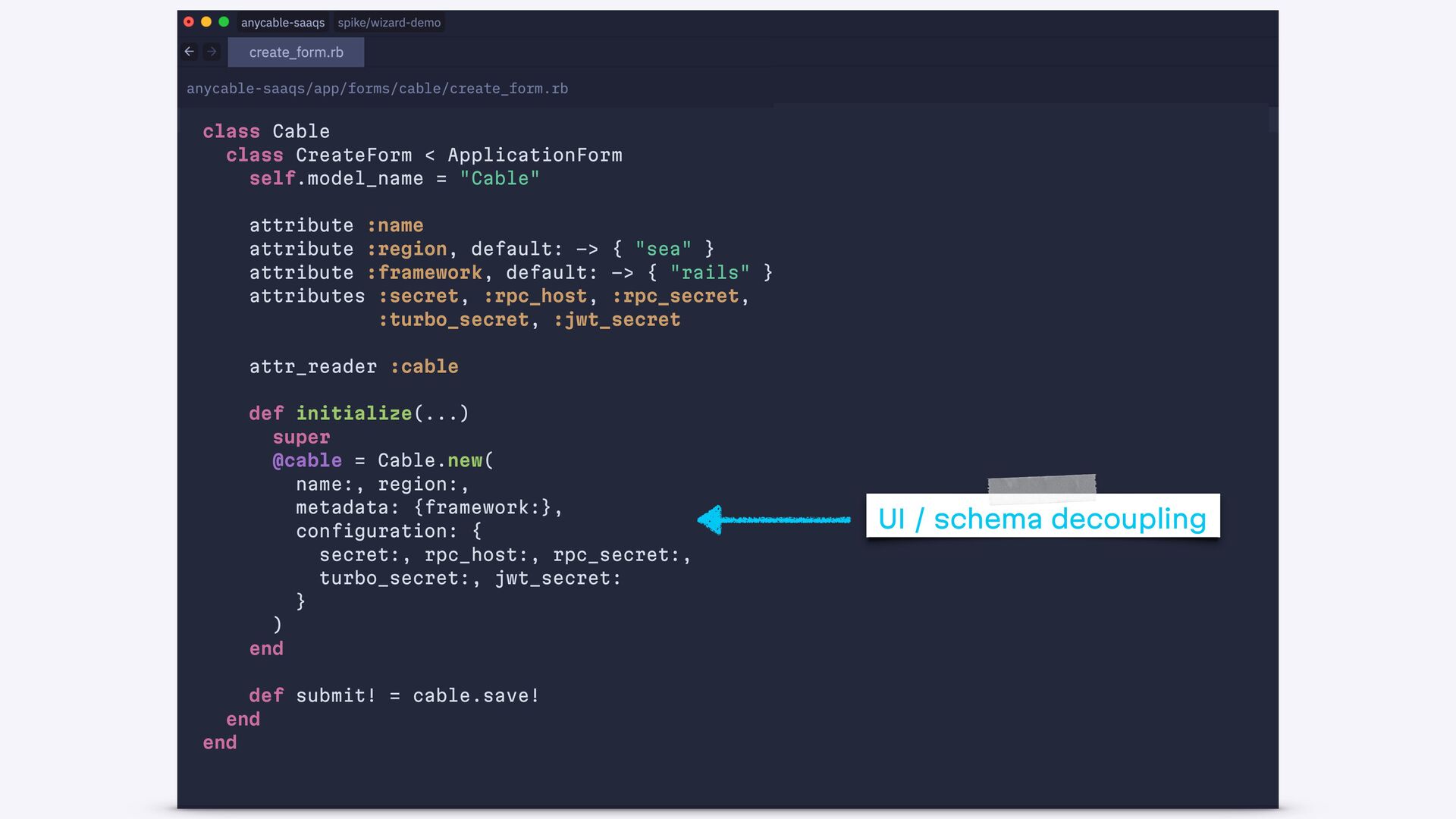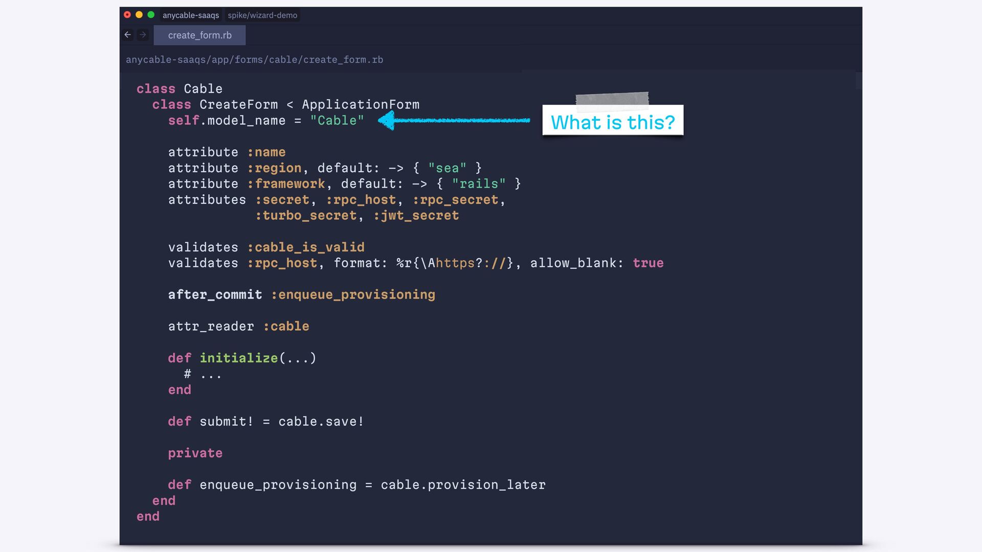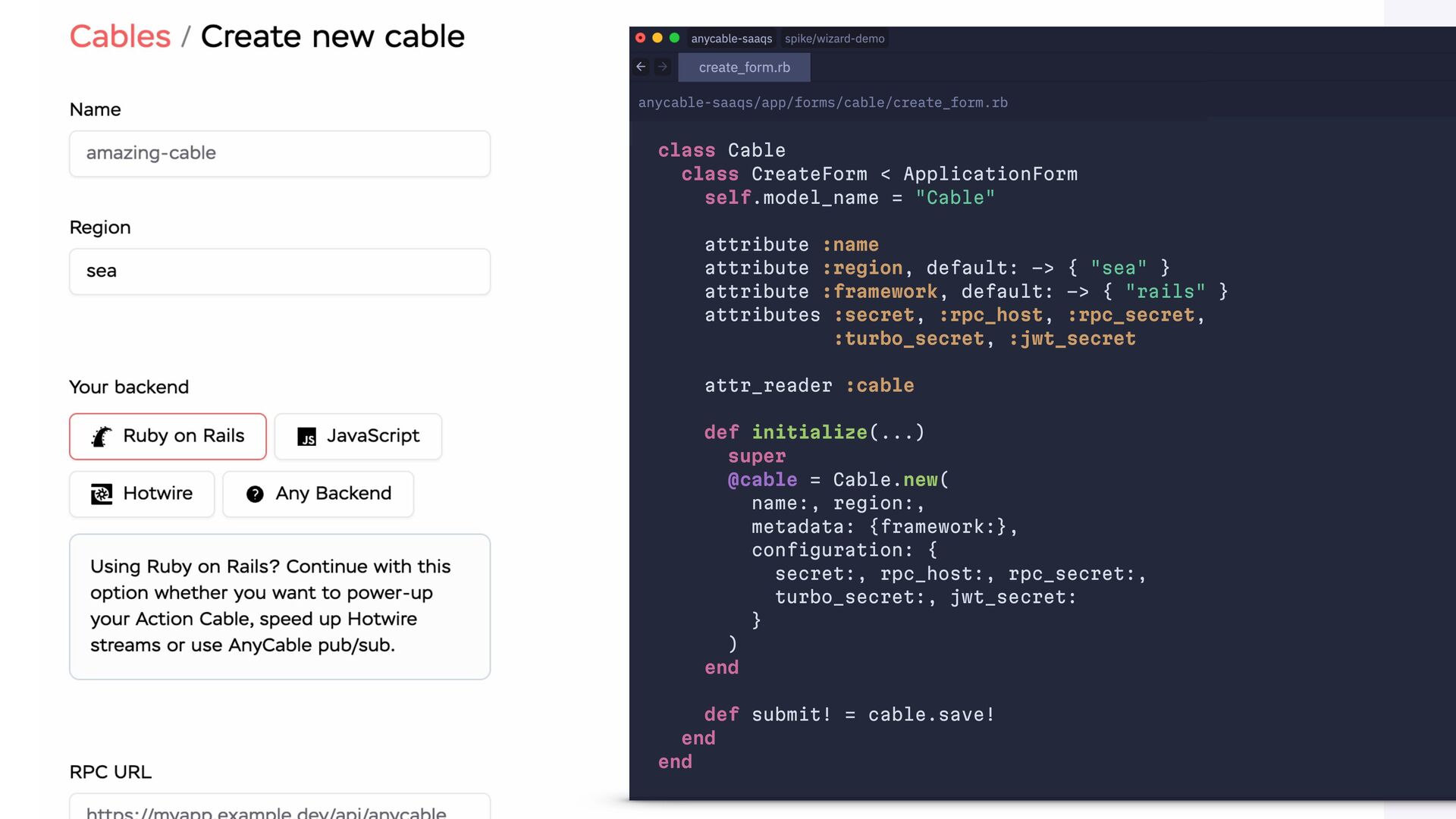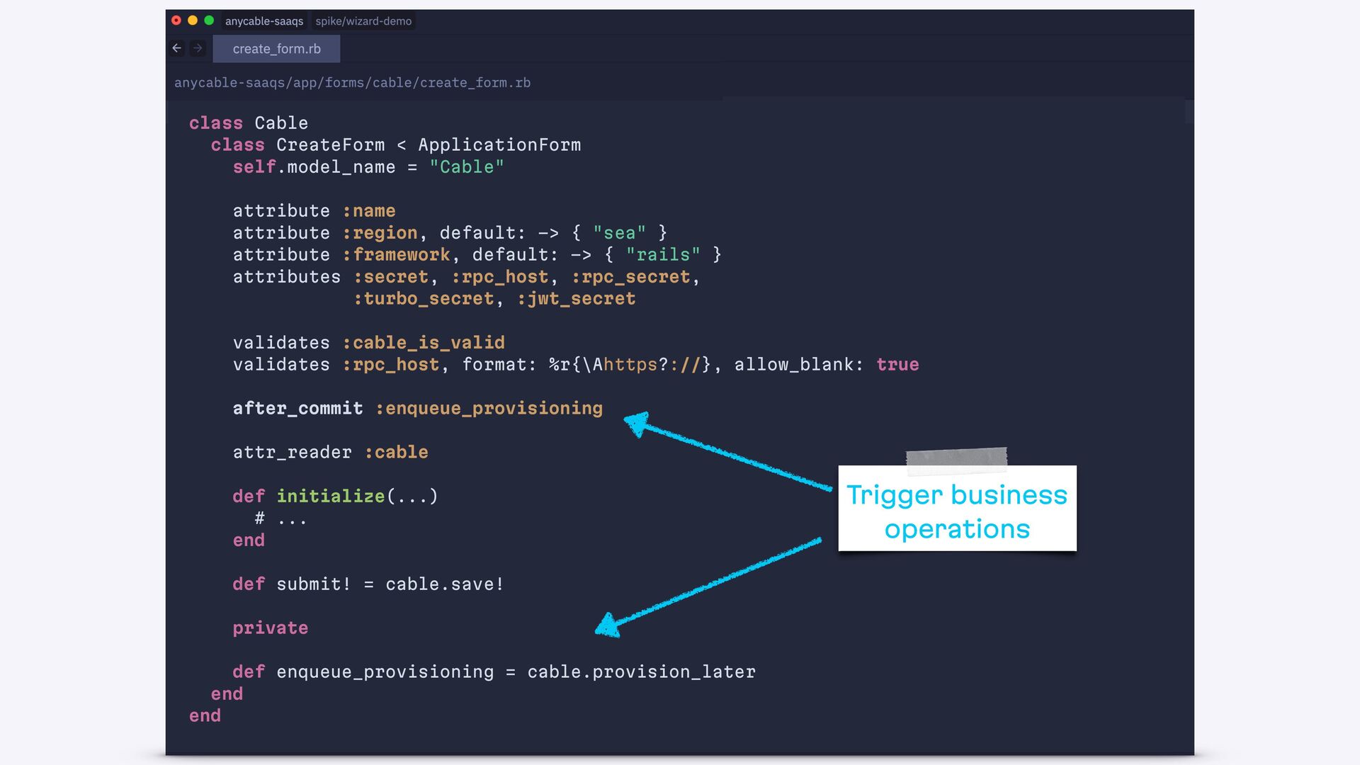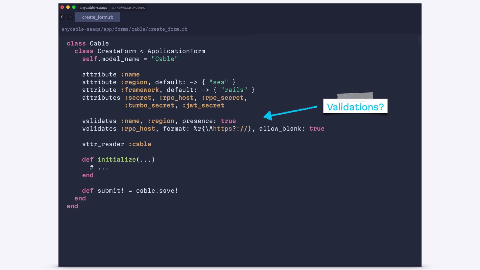 end def create authorize! @form = Cable::CreateForm.from(params.require(:cable)) if @form.save redirect_to cable_path(@form.cable), notice: "Success!" else status = @form.valid? ? :created : :unprocessable_entity render :new, status: end end end