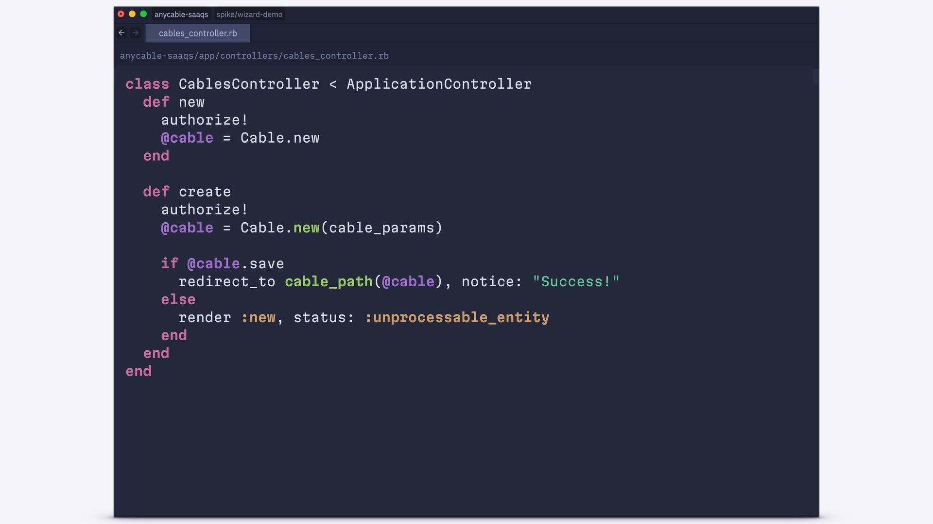 end def create authorize! @cable = Cable.new(cable_params) if @cable.save redirect_to cable_path(@cable), notice: "Success!" else render :new, status: :unprocessable_entity end end end