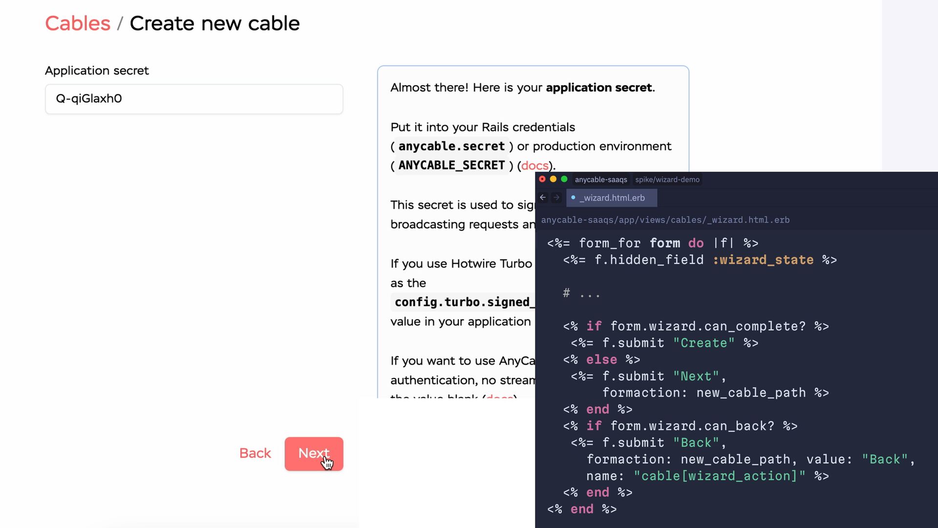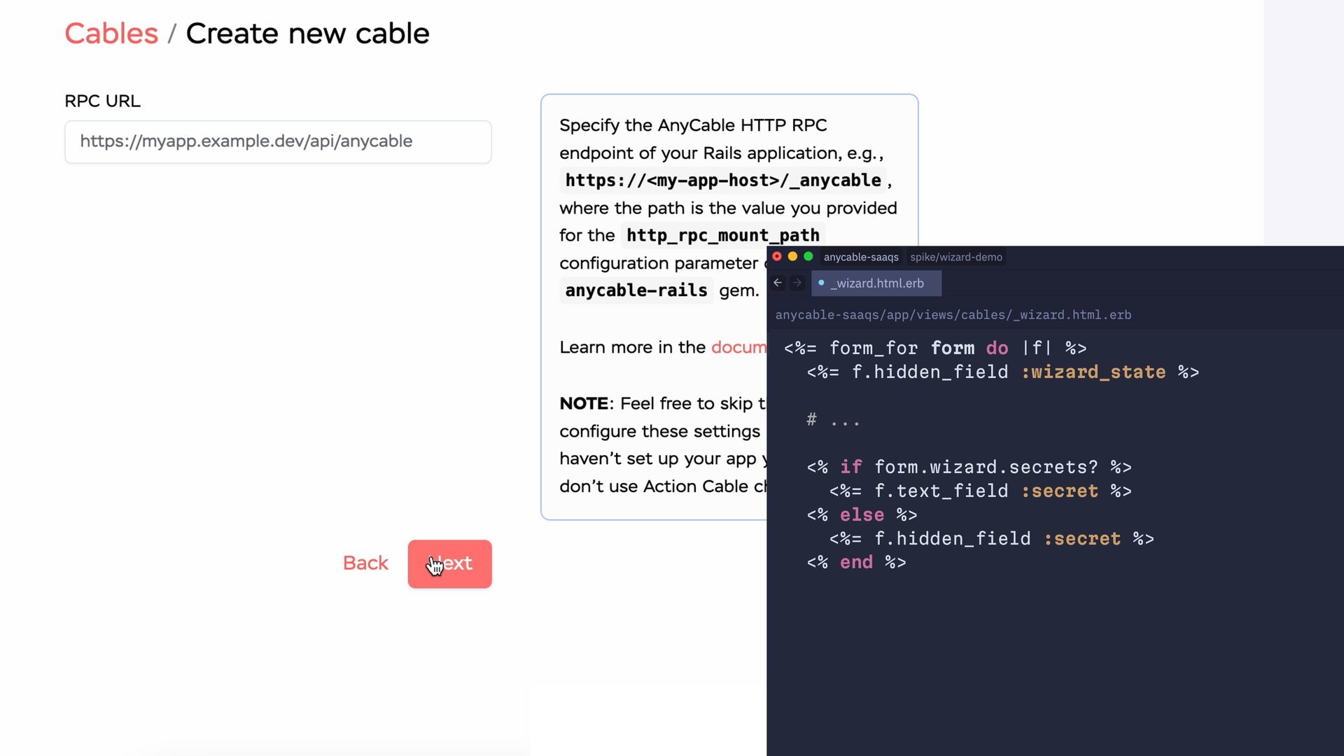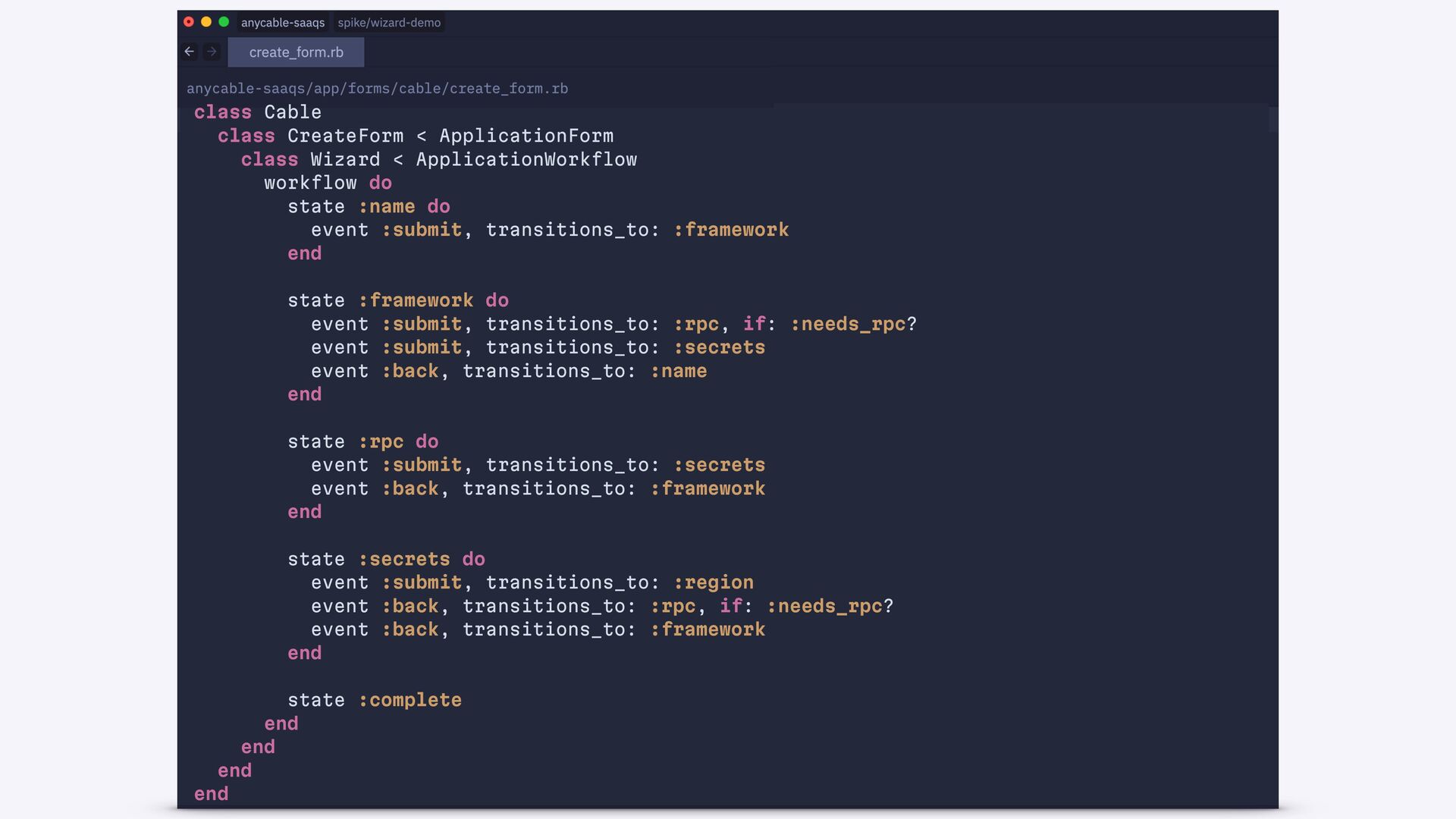 workflow do state :name do event :submit, transitions_to: :framework end state :framework do event :submit, transitions_to: :rpc, if: :needs_rpc? event :submit, transitions_to: :secrets event :back, transitions_to: :name end state :rpc do event :submit, transitions_to: :secrets event :back, transitions_to: :framework end state :secrets do event :submit, transitions_to: :region event :back, transitions_to: :rpc, if: :needs_rpc? event :back, transitions_to: :framework end state :complete end end end end