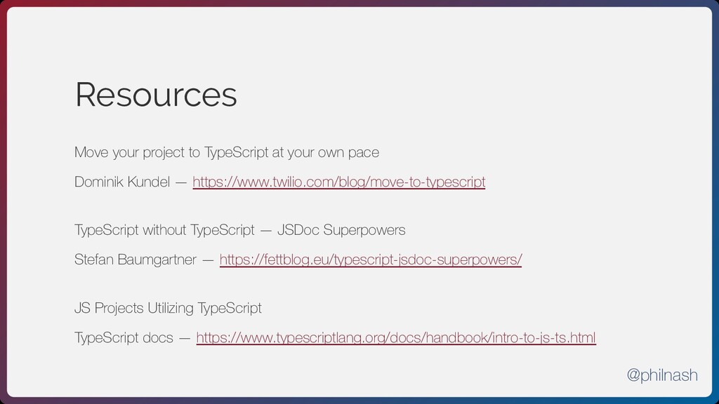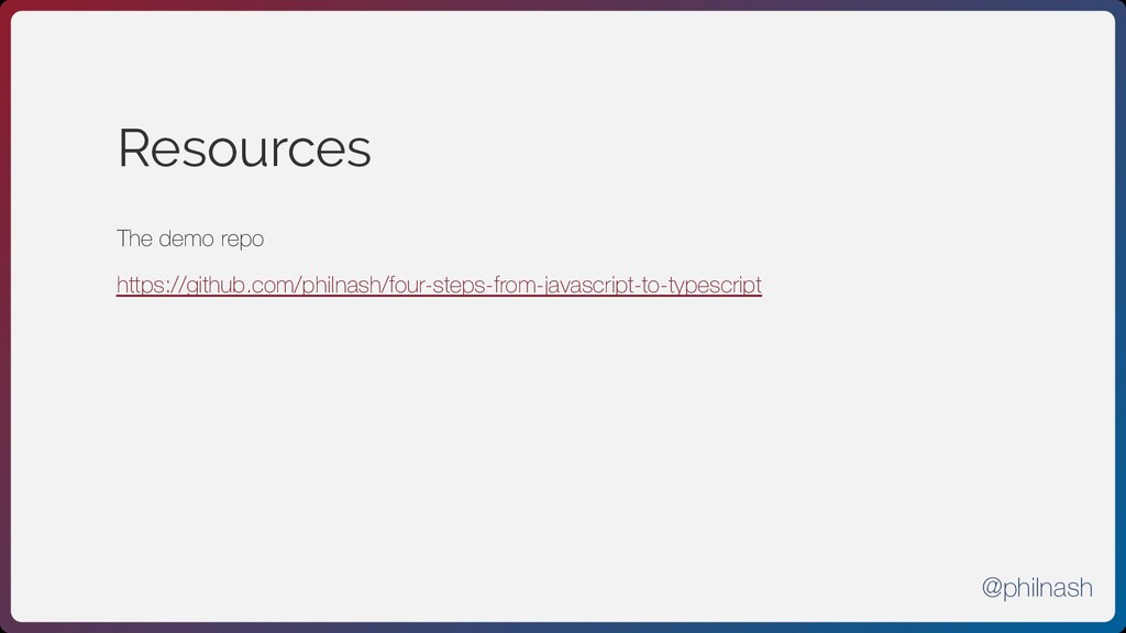 The demo repo: https://github.com/philnash/four-steps-from-javascript-to-typescript