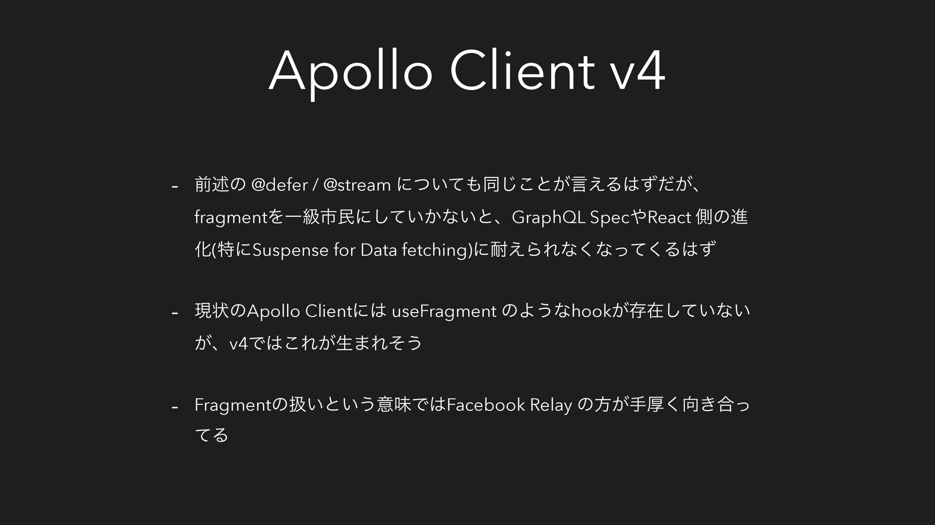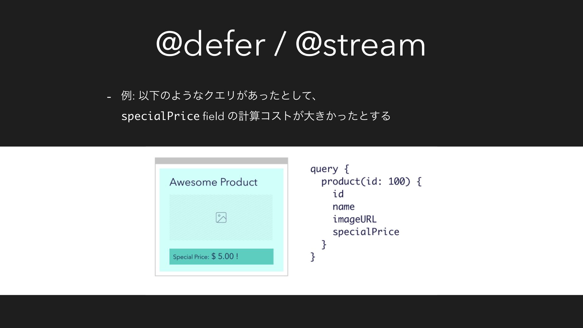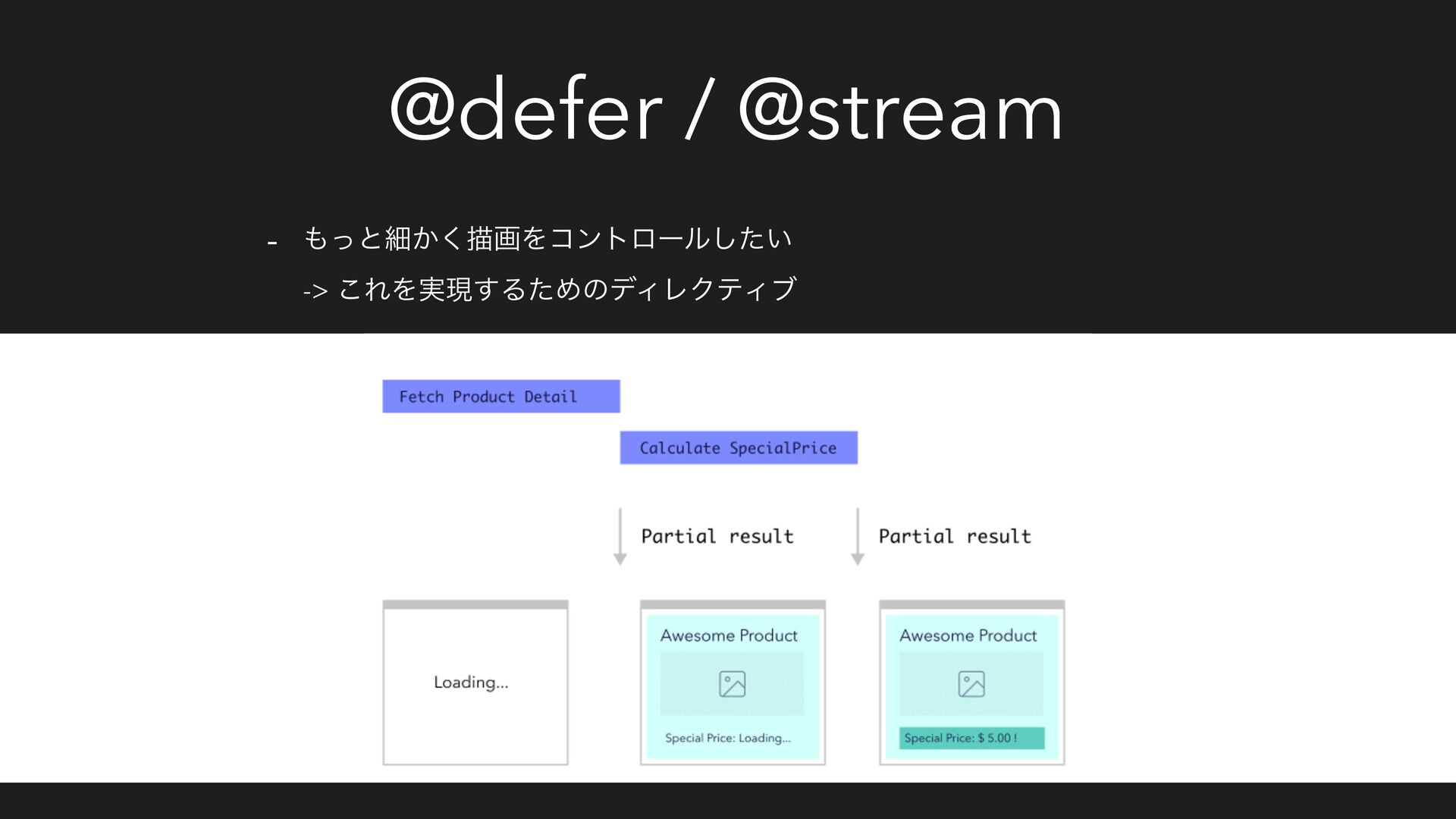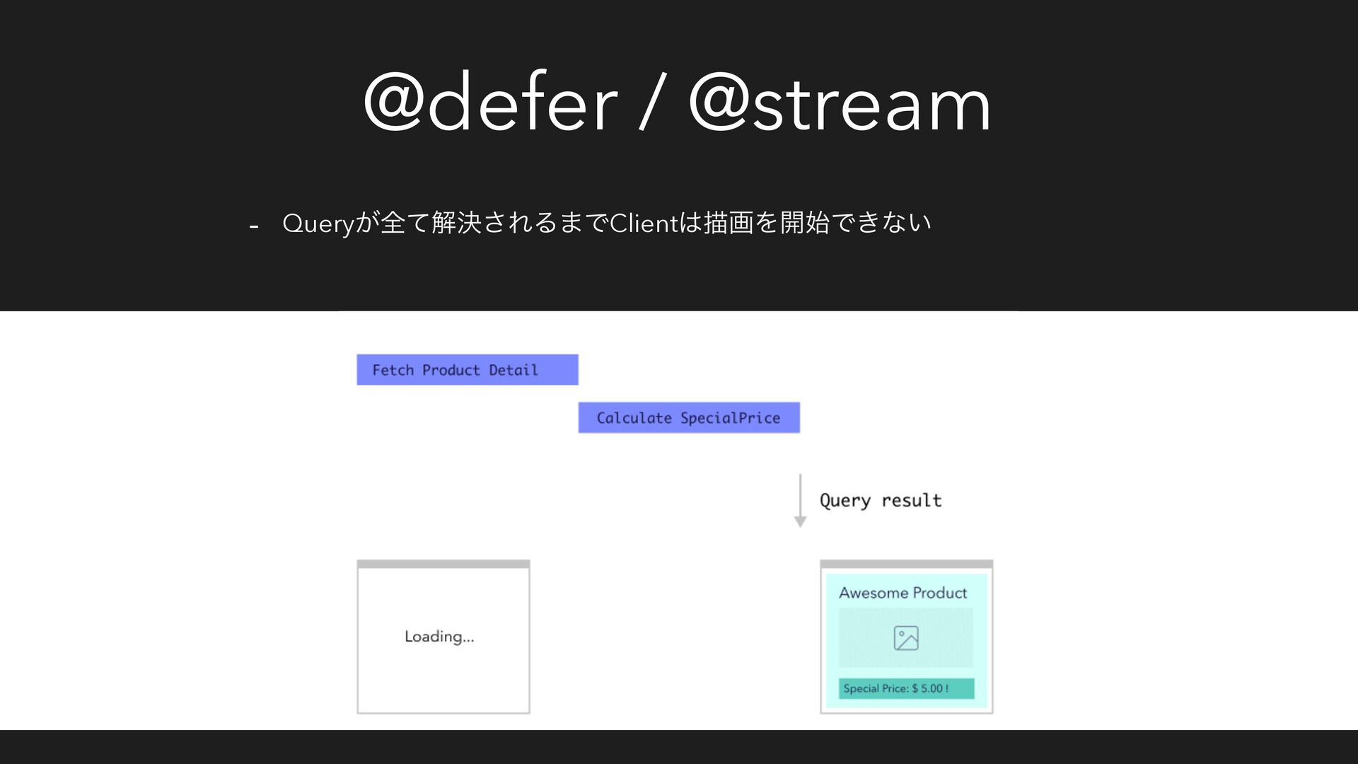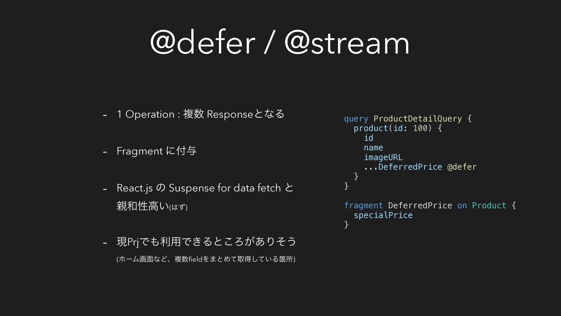 Fragment ʹ༩ - React.js ͷ Suspense for data fetch ͱ ੑߴ͍(ͣ) - ݱPrjͰར༻Ͱ͖Δͱ͜Ζ͕͋Γͦ͏ (ϗʔϜը໘ͳͲɺෳfieldΛ·ͱΊͯऔಘ͍ͯ͠ΔՕॴ) query ProductDetailQuery { product(id: 100) { id name imageURL ...DeferredPrice @defer } } fragment DeferredPrice on Product { specialPrice }