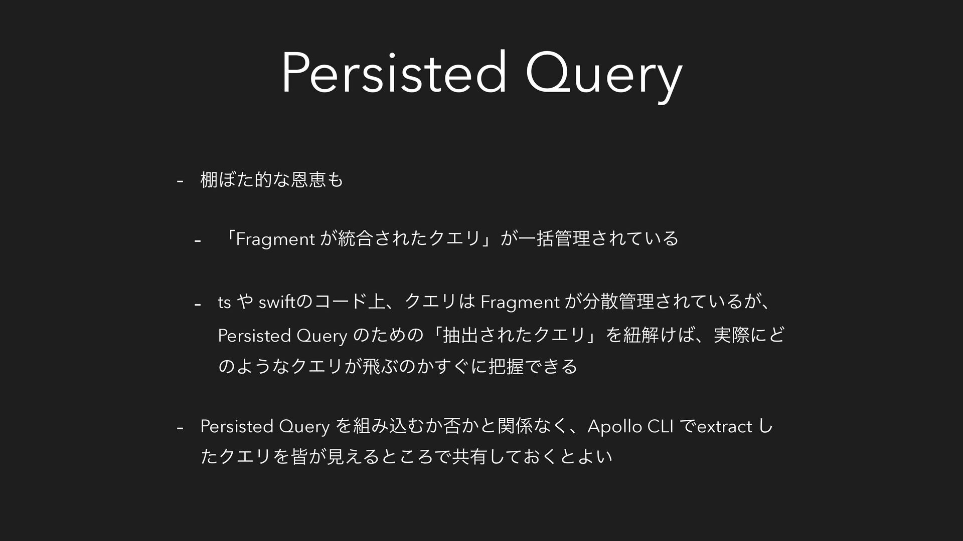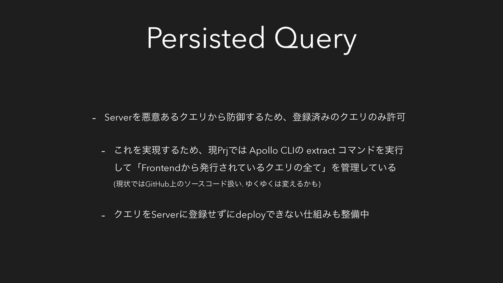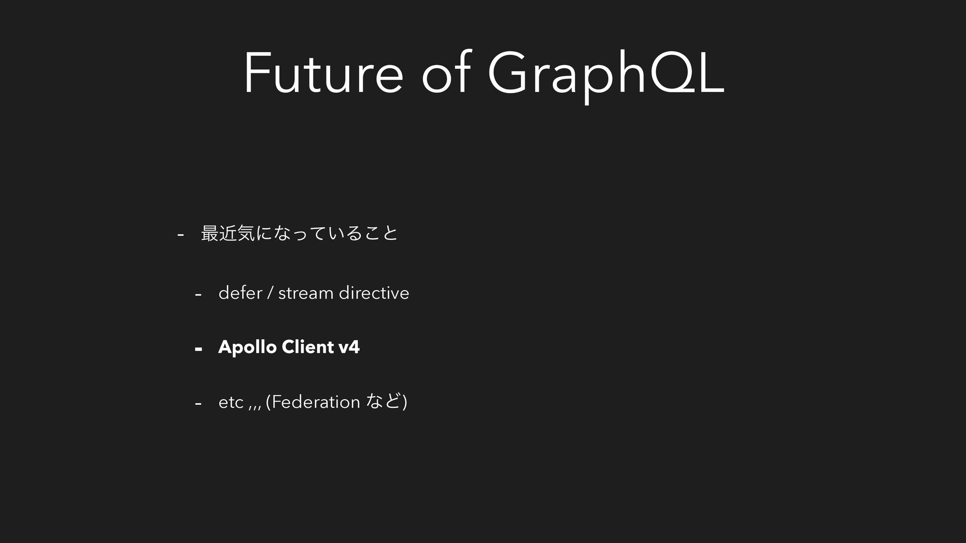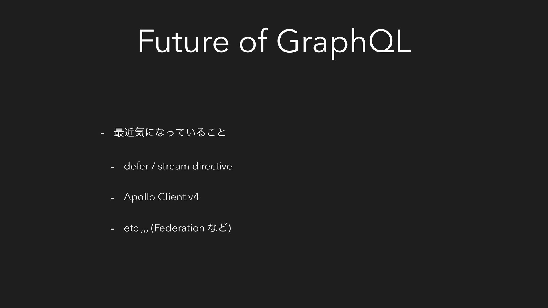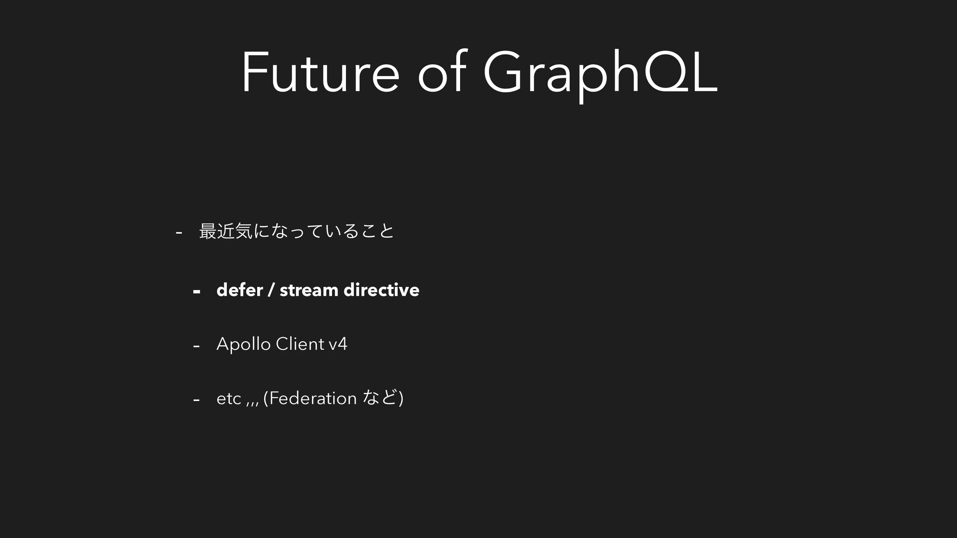 Fragment ʹ༩ - React.js ͷ Suspense for data fetch ͱ ੑߴ͍(ͣ) - ݱPrjͰར༻Ͱ͖Δͱ͜Ζ͕͋Γͦ͏ (ϗʔϜը໘ͳͲɺෳfieldΛ·ͱΊͯऔಘ͍ͯ͠ΔՕॴ) query ProductDetailQuery { product(id: 100) { id name imageURL ...DeferredPrice @defer } } fragment DeferredPrice on Product { specialPrice }