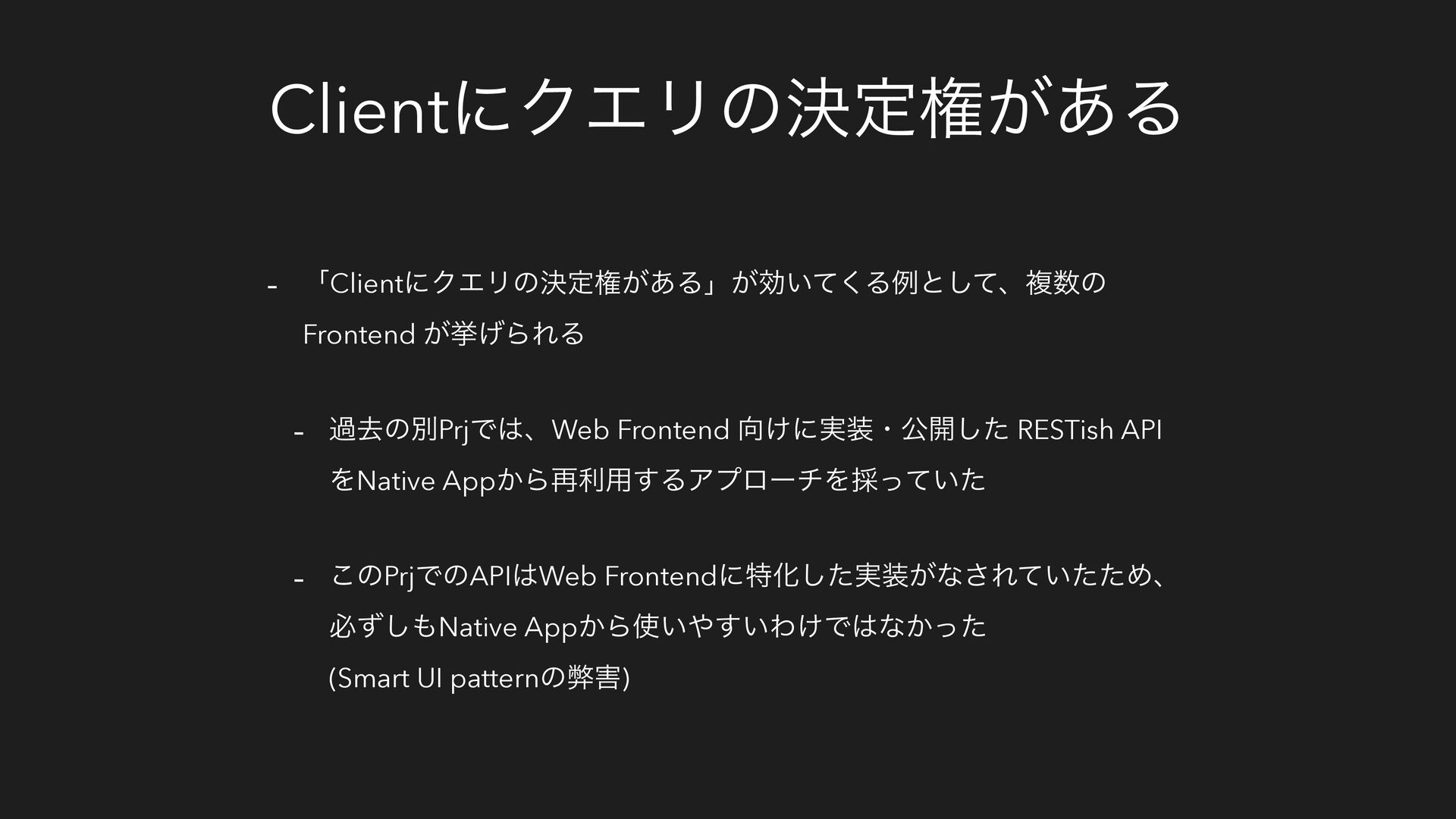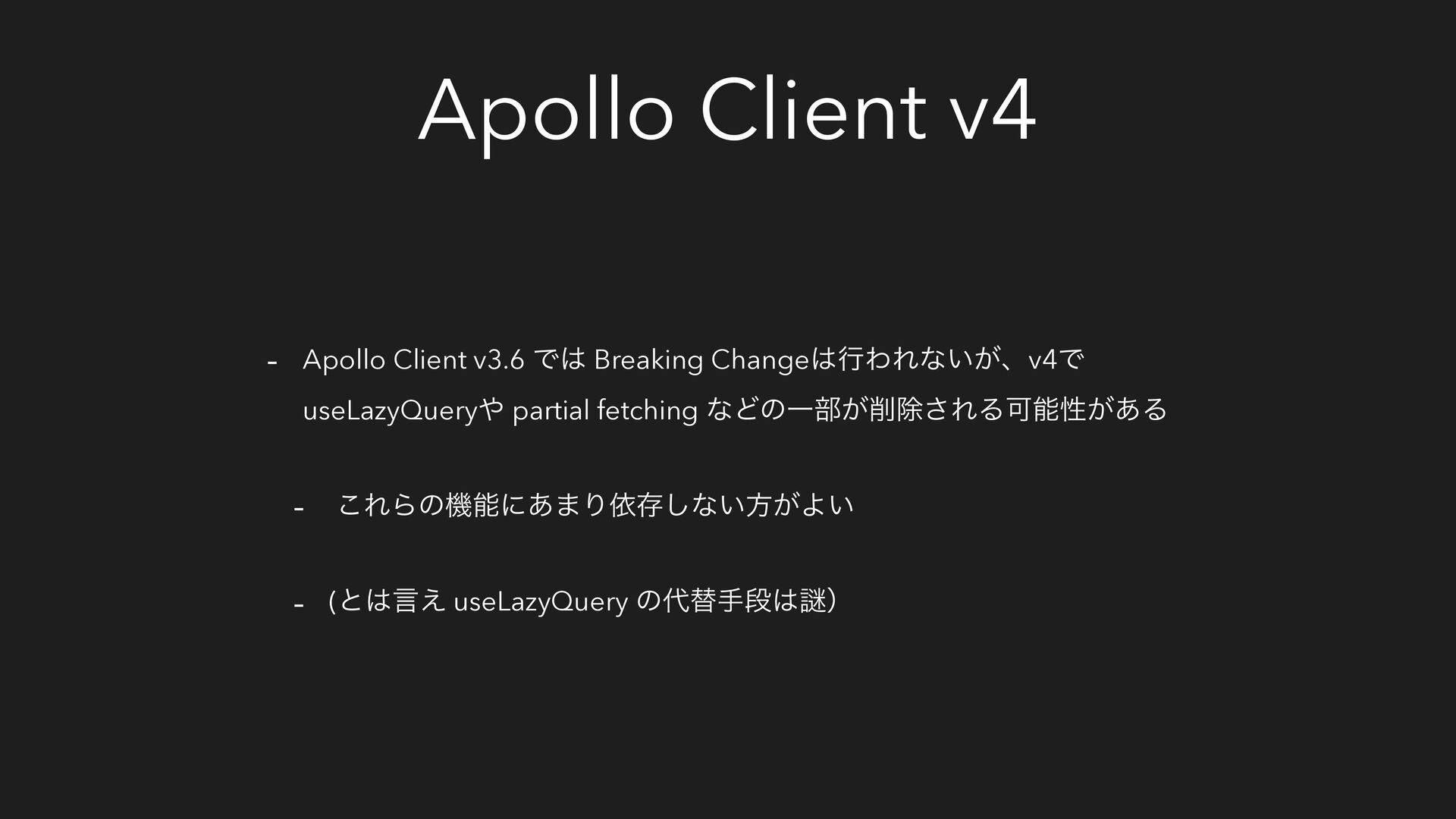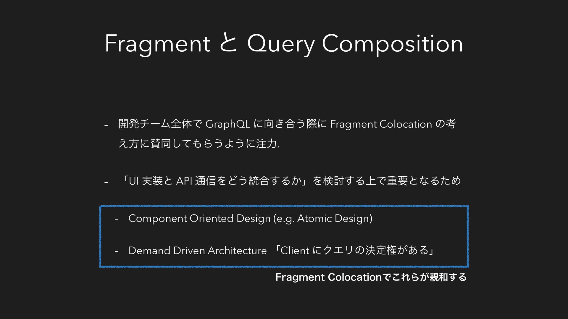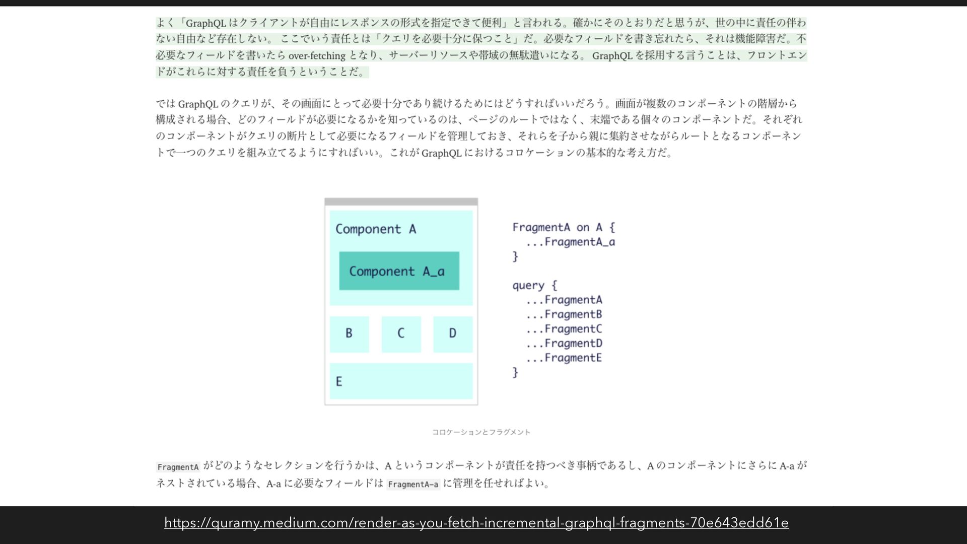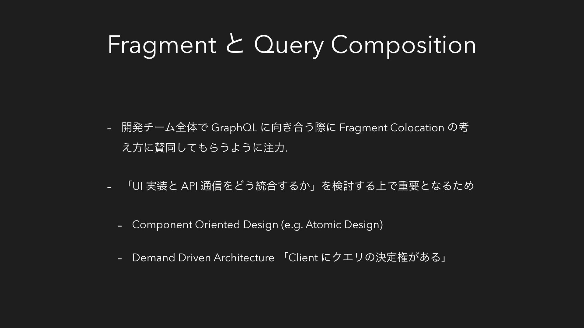 Fragment ʹ༩ - React.js ͷ Suspense for data fetch ͱ ੑߴ͍(ͣ) - ݱPrjͰར༻Ͱ͖Δͱ͜Ζ͕͋Γͦ͏ (ϗʔϜը໘ͳͲɺෳfieldΛ·ͱΊͯऔಘ͍ͯ͠ΔՕॴ) query ProductDetailQuery { product(id: 100) { id name imageURL ...DeferredPrice @defer } } fragment DeferredPrice on Product { specialPrice }