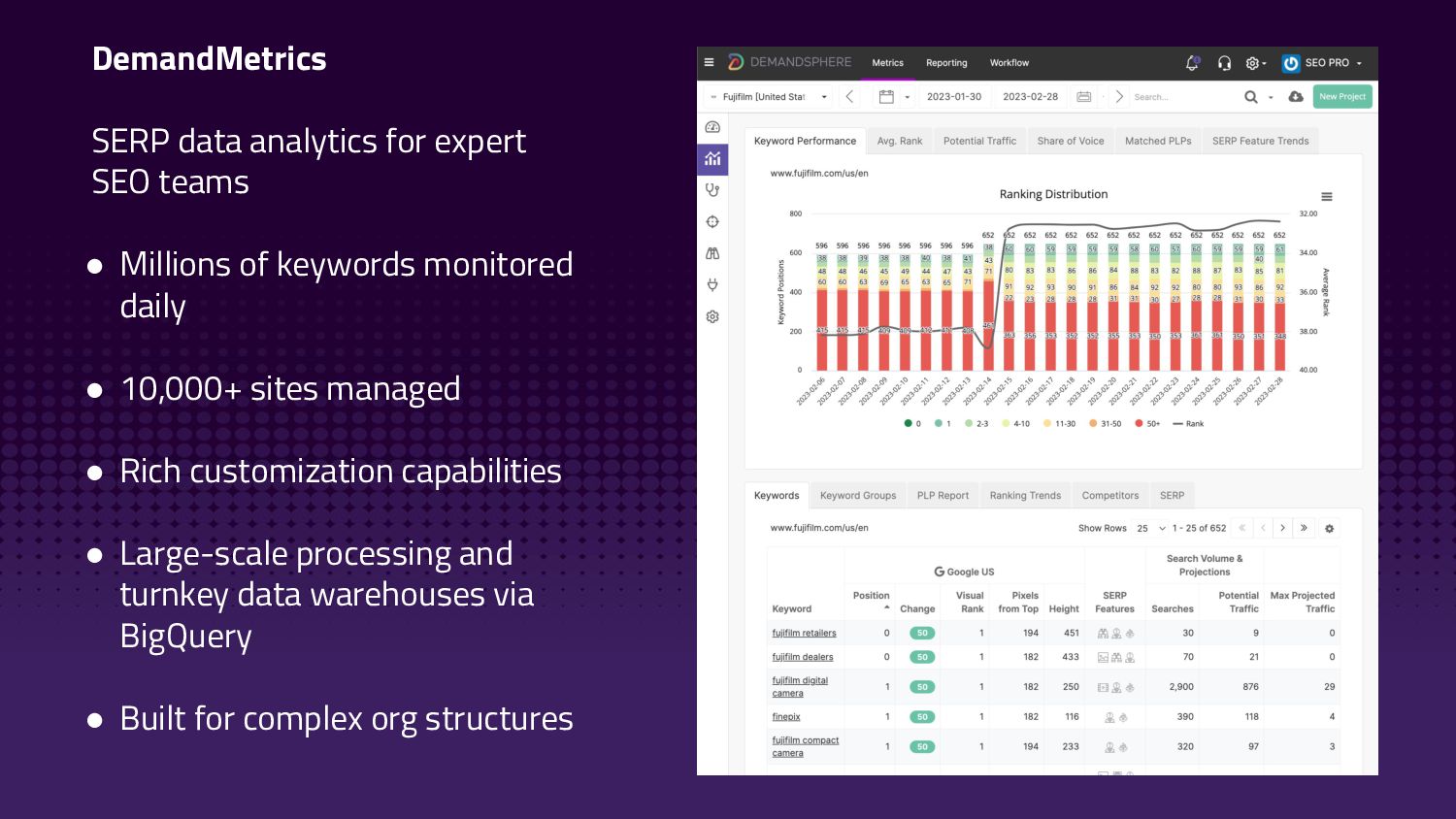 of keywords monitored daily • 10,000+ sites managed • Rich customization capabilities • Large-scale processing and turnkey data warehouses via BigQuery • Built for complex org structures