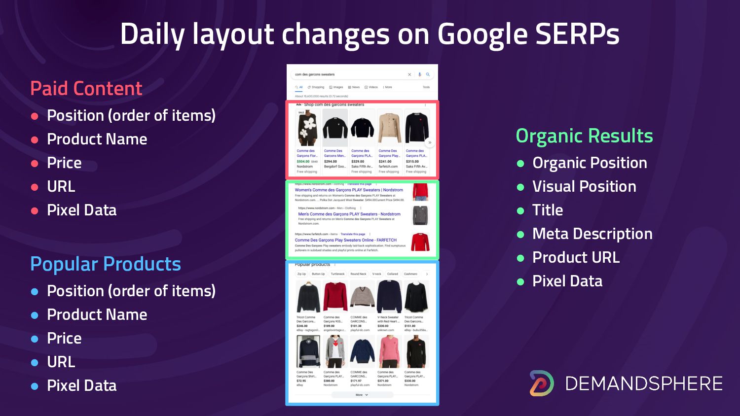 (order of items) • Product Name • Price • URL • Pixel Data Organic Results • Organic Position • Visual Position • Title • Meta Description • Product URL • Pixel Data Popular Products • Position (order of items) • Product Name • Price • URL • Pixel Data