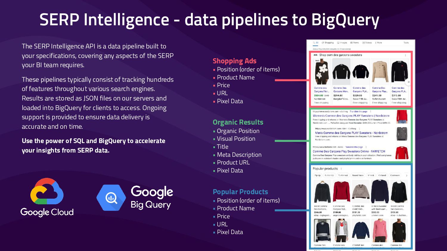 • Price • URL • Pixel Data Organic Results • Organic Position • Visual Position • Title • Meta Description • Product URL • Pixel Data Popular Products • Position (order of items) • Product Name • Price • URL • Pixel Data SERP Intelligence - data pipelines to BigQuery The SERP Intelligence API is a data pipeline built to your specifications, covering any aspects of the SERP your BI team requires. These pipelines typically consist of tracking hundreds of features throughout various search engines. Results are stored as JSON files on our servers and loaded into BigQuery for clients to access. Ongoing support is provided to ensure data delivery is accurate and on time. Use the power of SQL and BigQuery to accelerate your insights from SERP data.