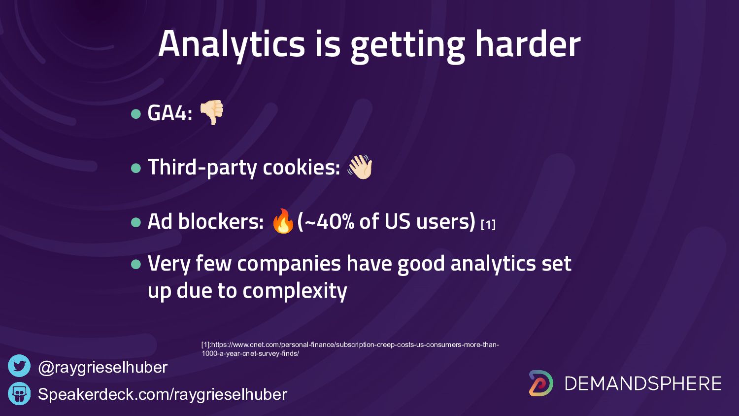 Third-party cookies: • Ad blockers: 🔥(~40% of US users) [1] • Very few companies have good analytics set up due to complexity [1]:https://www.cnet.com/personal-finance/subscription-creep-costs-us-consumers-more-than- 1000-a-year-cnet-survey-finds/