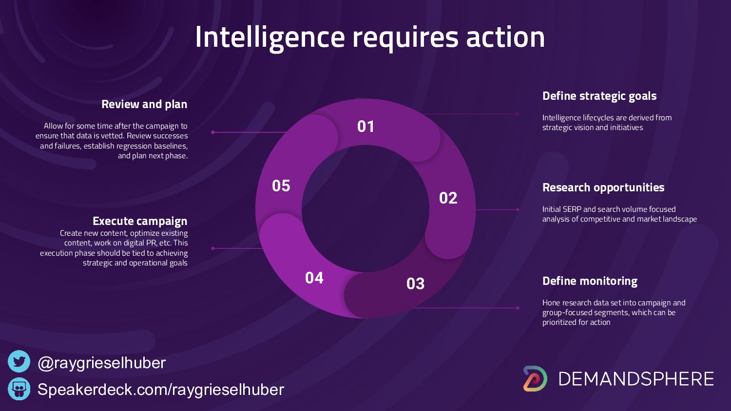 some time after the campaign to ensure that data is vetted. Review successes and failures, establish regression baselines, and plan next phase. Execute campaign Create new content, optimize existing content, work on digital PR, etc. This execution phase should be tied to achieving strategic and operational goals Define monitoring Hone research data set into campaign and group-focused segments, which can be prioritized for action Define strategic goals Intelligence lifecycles are derived from strategic vision and initiatives Research opportunities Initial SERP and search volume focused analysis of competitive and market landscape 01 05 04 03 02
