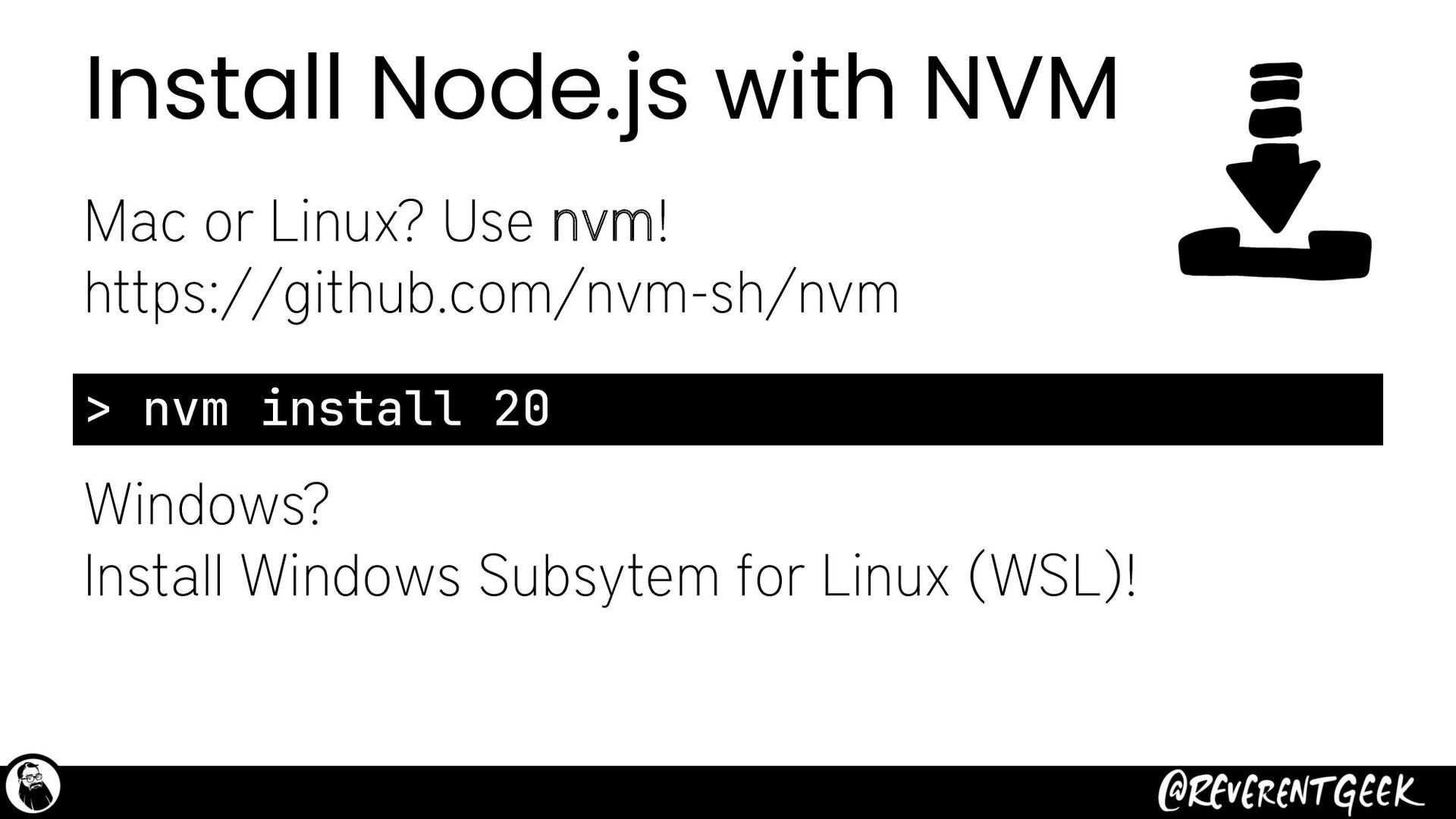 Windows? Install Windows Subsytem for Linux (WSL)! > nvm install 20