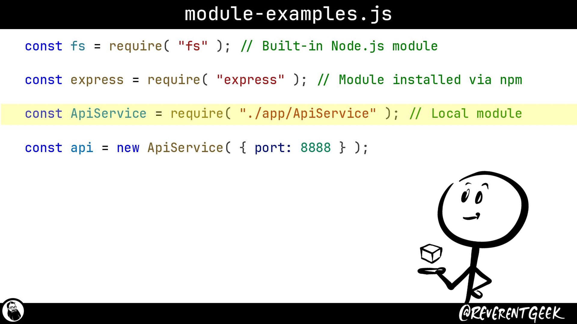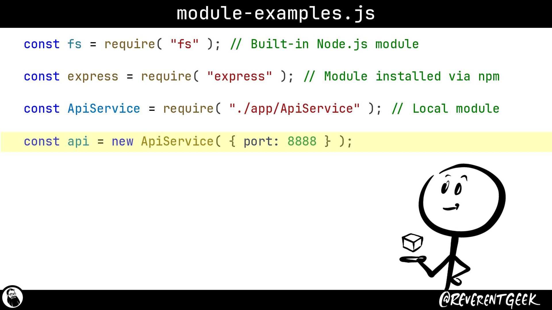 const express = require( "express" ); !// Module installed via npm const ApiService = require( "./app/ApiService" ); !// Local module const api = new ApiService( { port: 8888 } ); module-examples.js