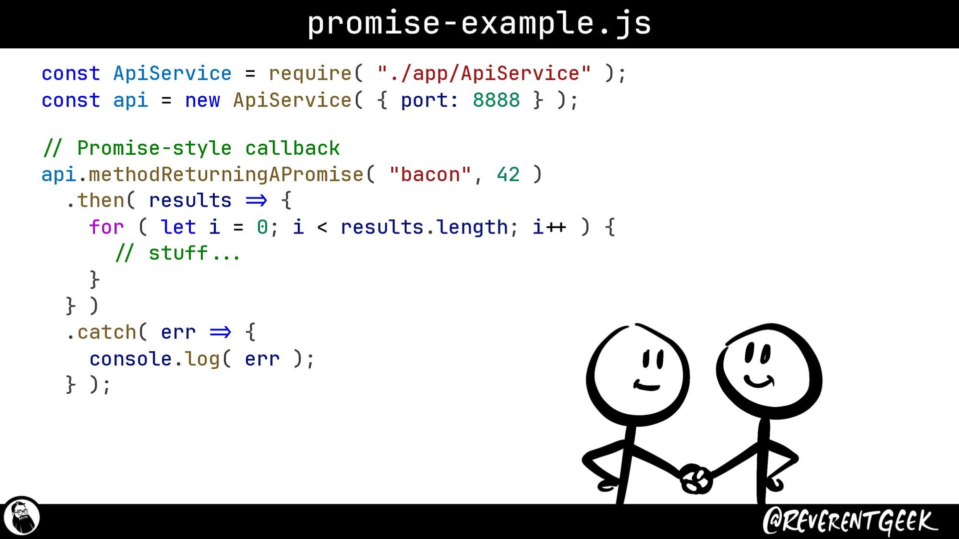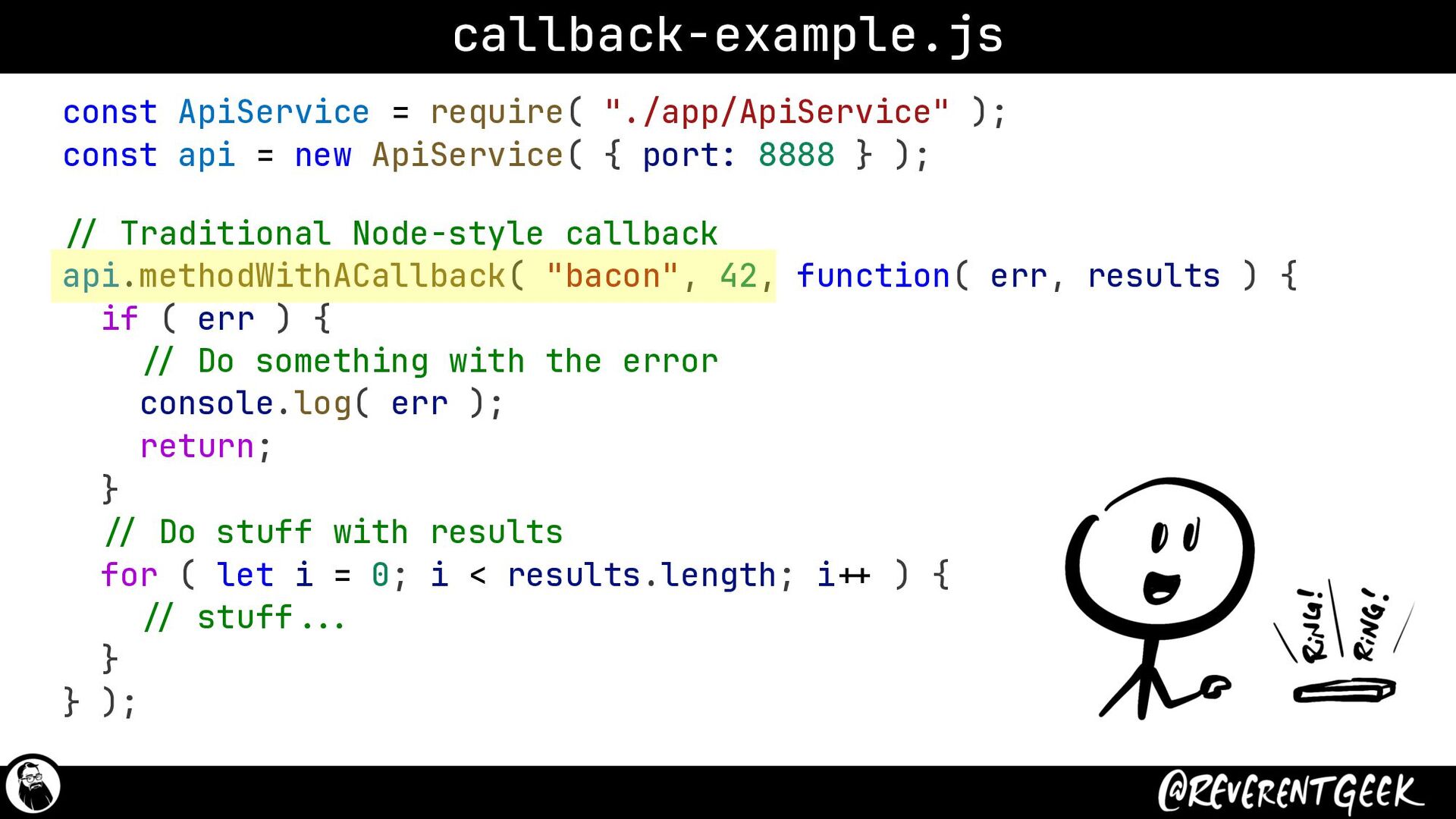 ApiService( { port: 8888 } ); !// Traditional Node-style callback api.methodWithACallback( "bacon", 42, function( err, results ) { if ( err ) { !// Do something with the error console.log( err ); return; } !// Do stuff with results for ( let i = 0; i < results.length; i!++ ) { !// stuff!!... } } ); callback-example.js