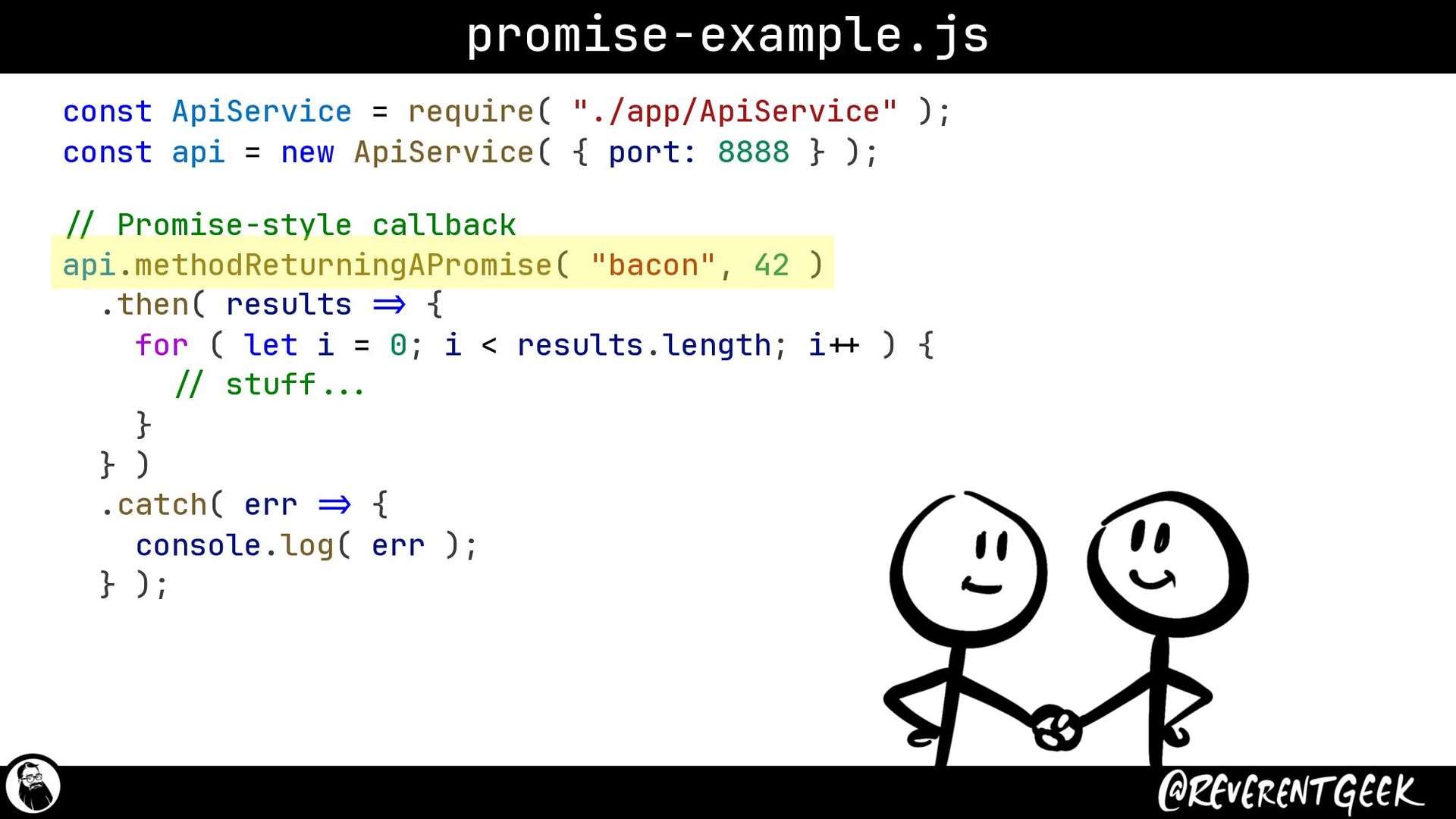 ApiService( { port: 8888 } ); !// Promise-style callback api.methodReturningAPromise( "bacon", 42 ) .then( results !=> { for ( let i = 0; i < results.length; i!++ ) { !// stuff!!... } } ) .catch( err !=> { console.log( err ); } ); promise-example.js
