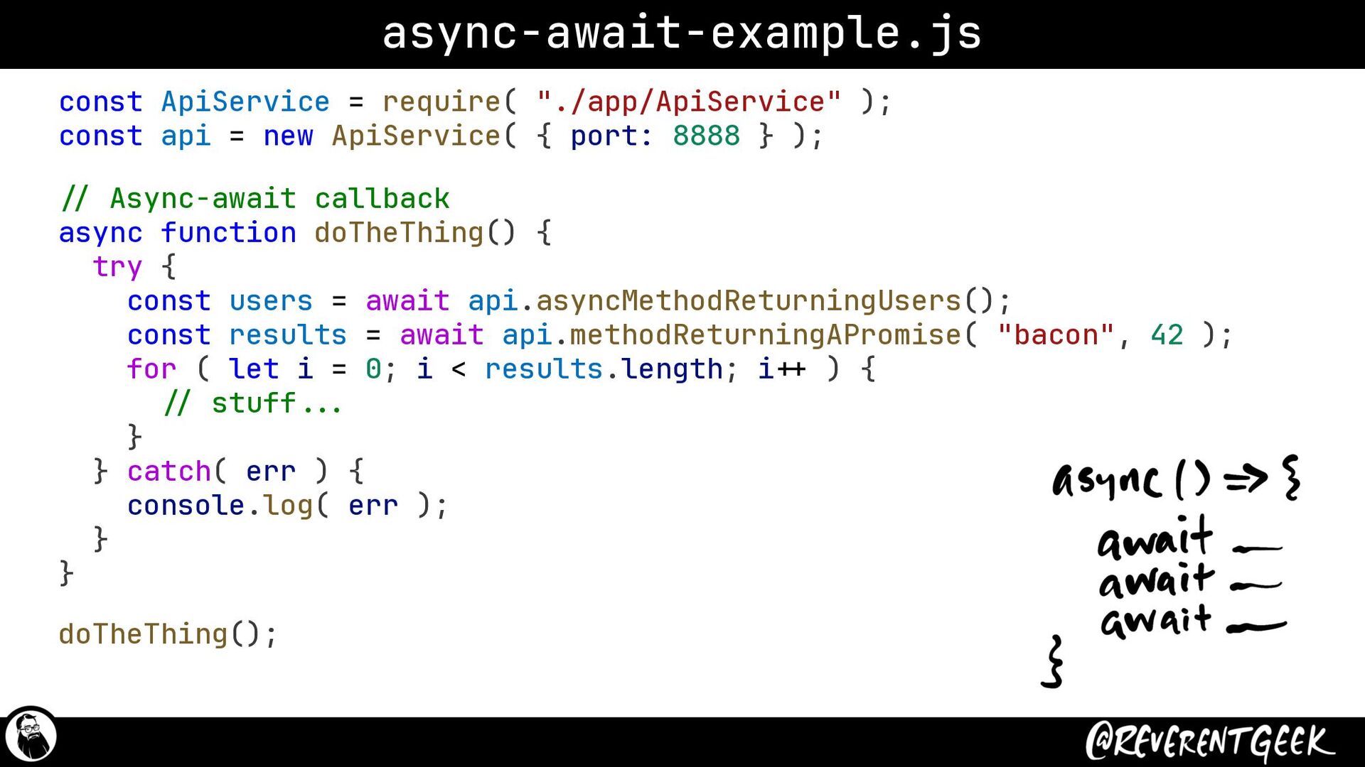 ApiService( { port: 8888 } ); !// Async-await callback async function doTheThing() { try { const users = await api.asyncMethodReturningUsers(); const results = await api.methodReturningAPromise( "bacon", 42 ); for ( let i = 0; i < results.length; i!++ ) { !// stuff!!... } } catch( err ) { console.log( err ); } } doTheThing(); async-await-example.js