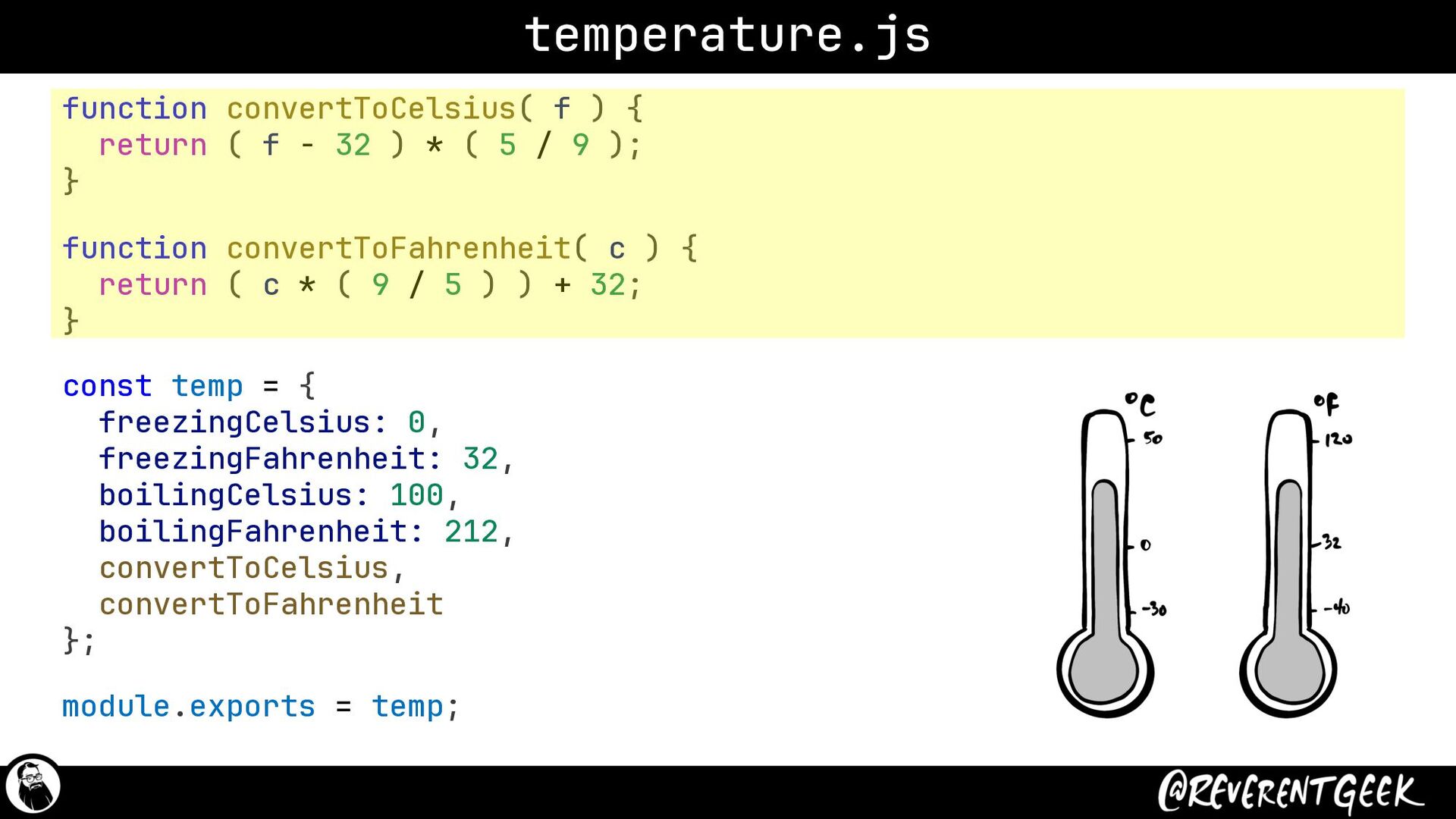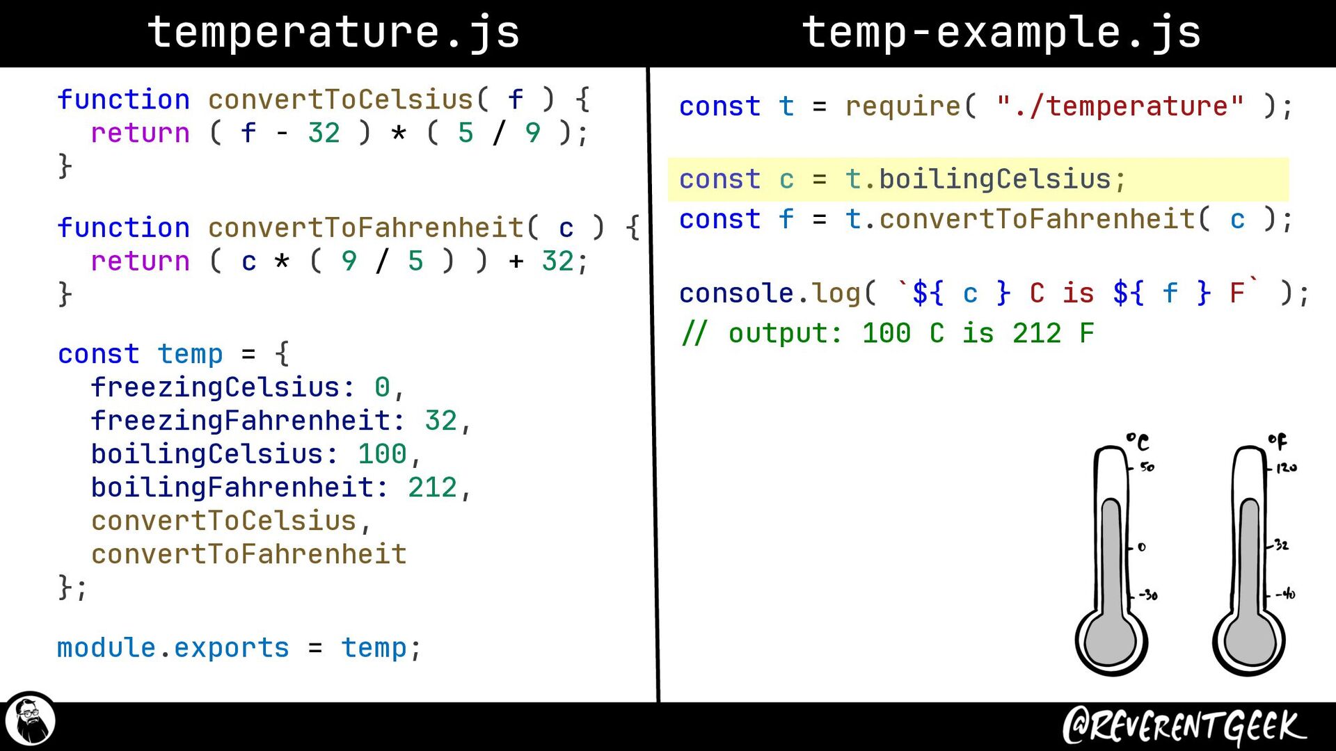 ) * ( 5 / 9 ); } function convertToFahrenheit( c ) { return ( c * ( 9 / 5 ) ) + 32; } const temp = { freezingCelsius: 0, freezingFahrenheit: 32, boilingCelsius: 100, boilingFahrenheit: 212, convertToCelsius, convertToFahrenheit }; module.exports = temp; temperature.js const t = require( "./temperature" ); const c = t.boilingCelsius; const f = t.convertToFahrenheit( c ); console.log( `${ c } C is ${ f } F` ); !// output: 100 C is 212 F temp-example.js
