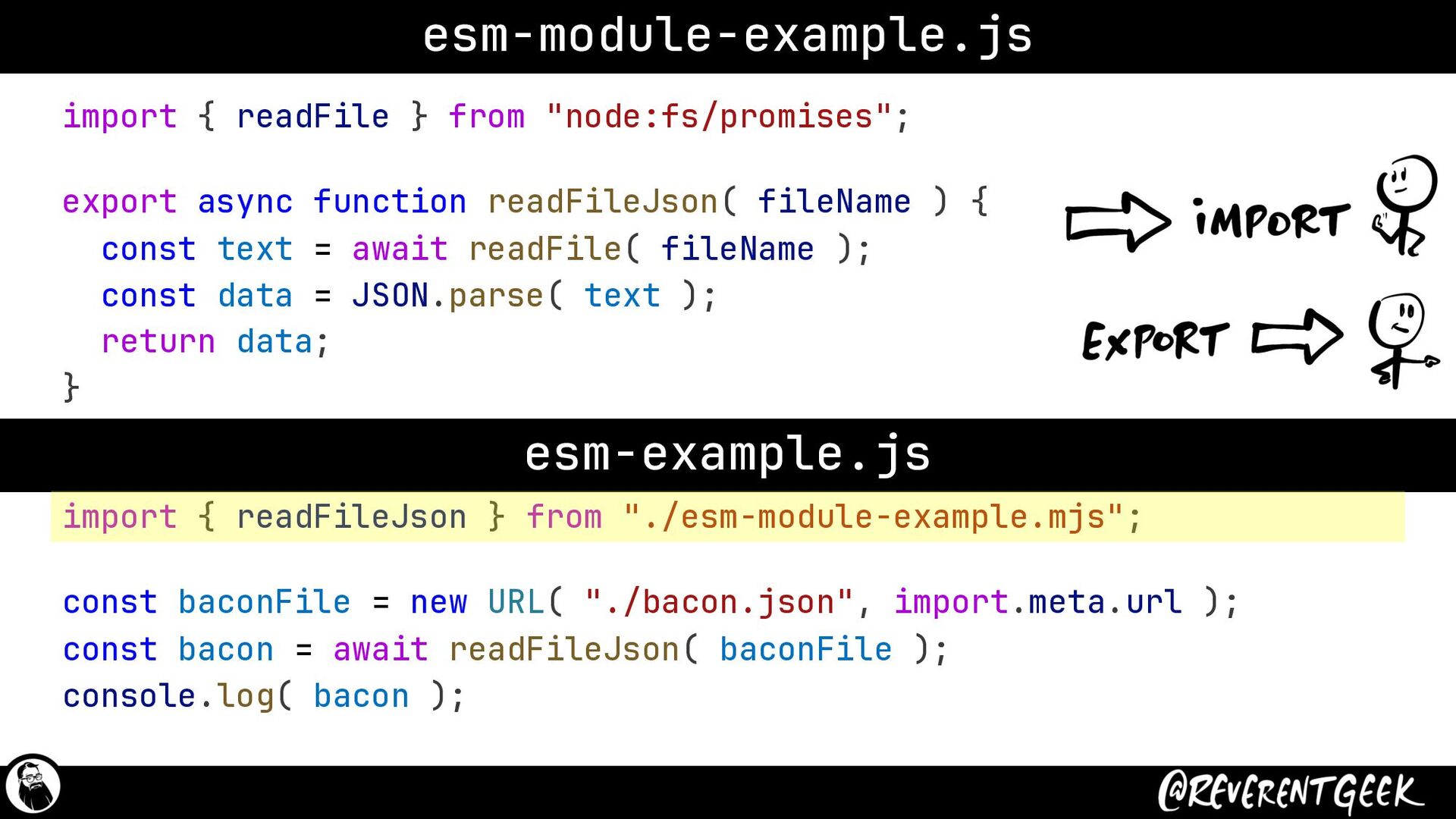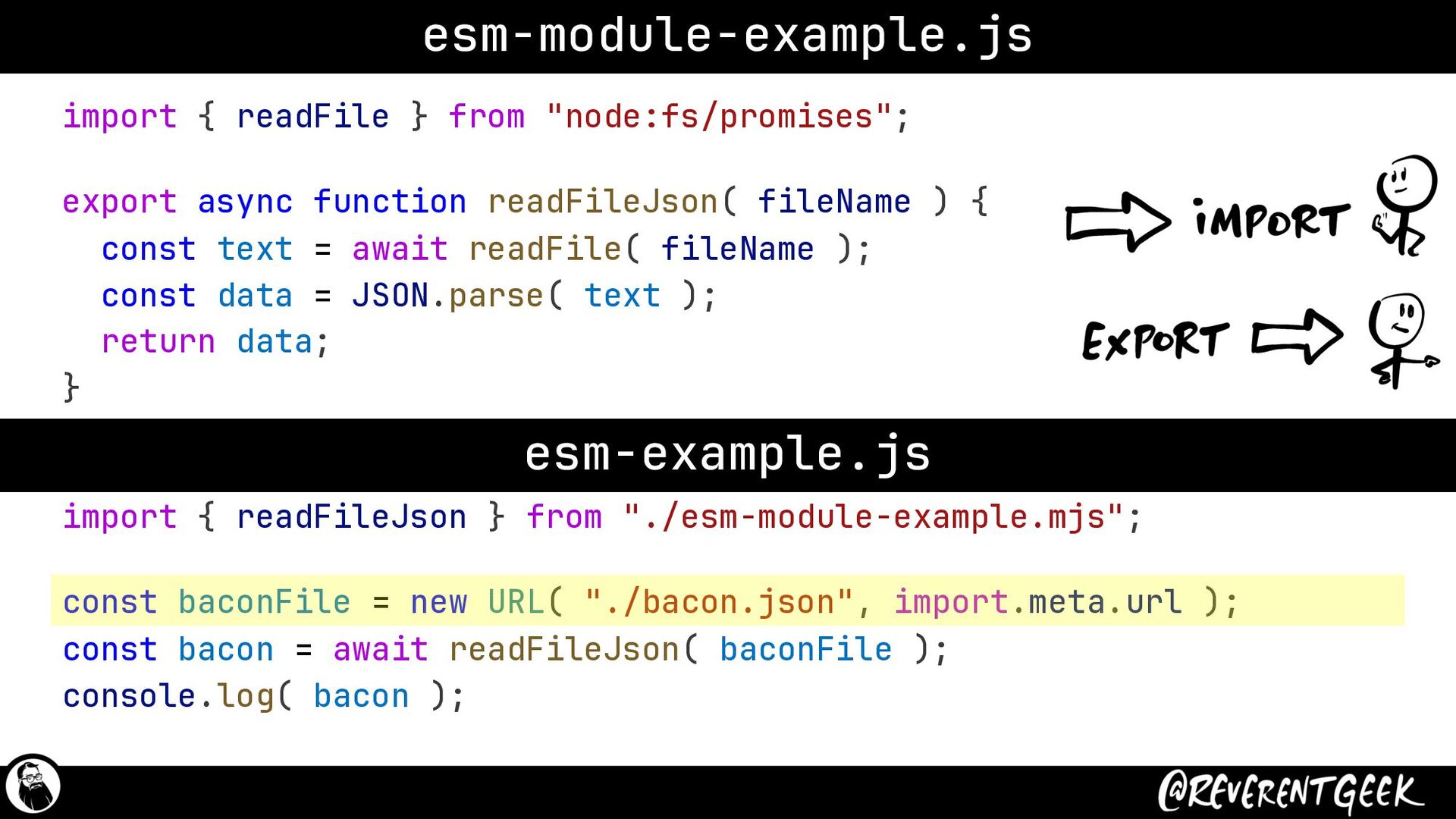 readFileJson( fileName ) { const text = await readFile( fileName ); const data = JSON.parse( text ); return data; } esm-example.js import { readFileJson } from "./esm-module-example.mjs"; const baconFile = new URL( "./bacon.json", import.meta.url ); const bacon = await readFileJson( baconFile ); console.log( bacon );