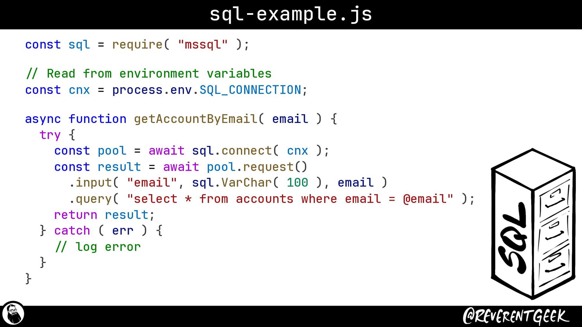 variables const cnx = process.env.SQL_CONNECTION; async function getAccountByEmail( email ) { try { const pool = await sql.connect( cnx ); const result = await pool.request() .input( "email", sql.VarChar( 100 ), email ) .query( "select * from accounts where email = @email" ); return result; } catch ( err ) { !// log error } } sql-example.js
