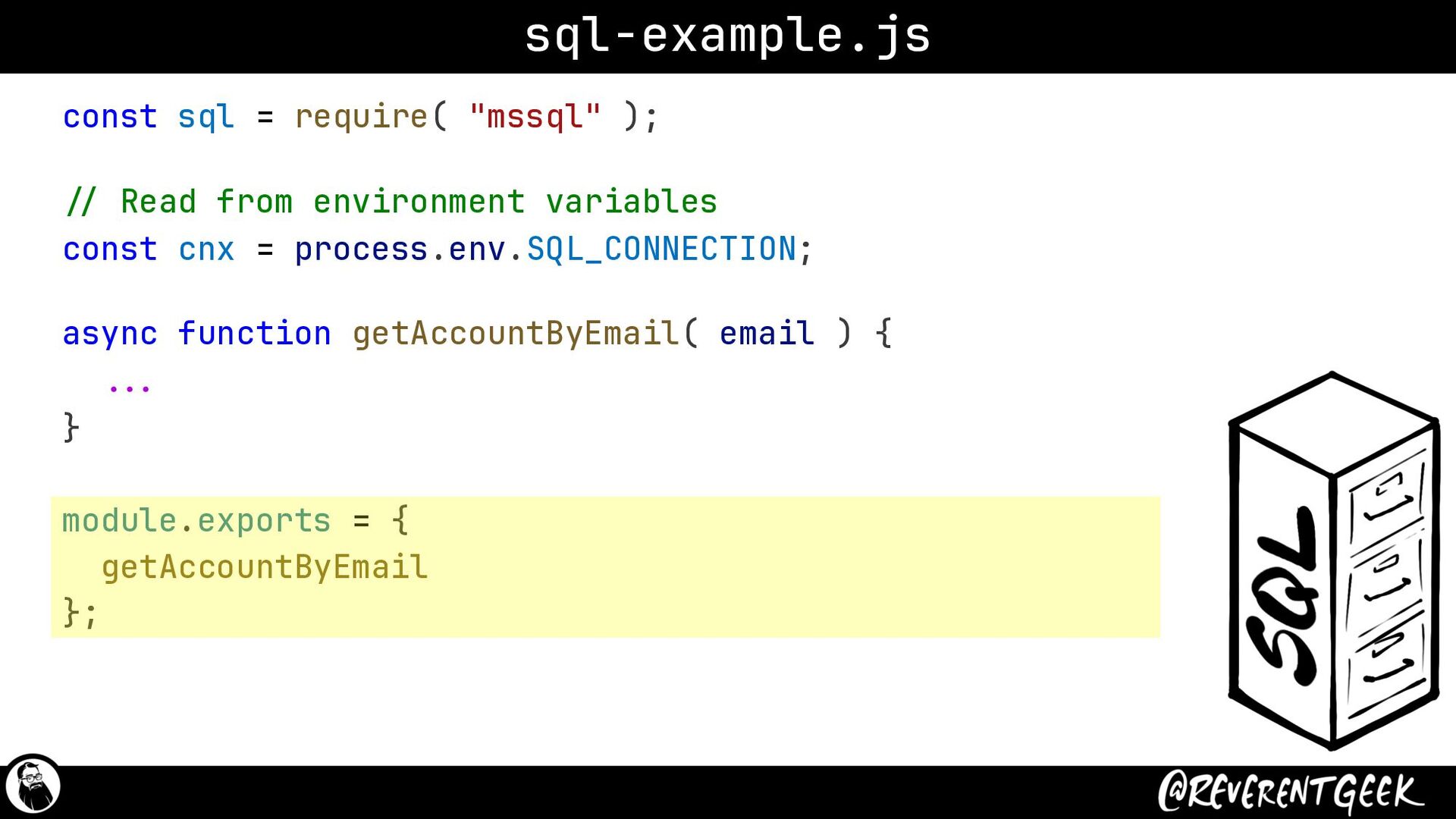 variables const cnx = process.env.SQL_CONNECTION; async function getAccountByEmail( email ) { !!... } module.exports = { getAccountByEmail }; sql-example.js