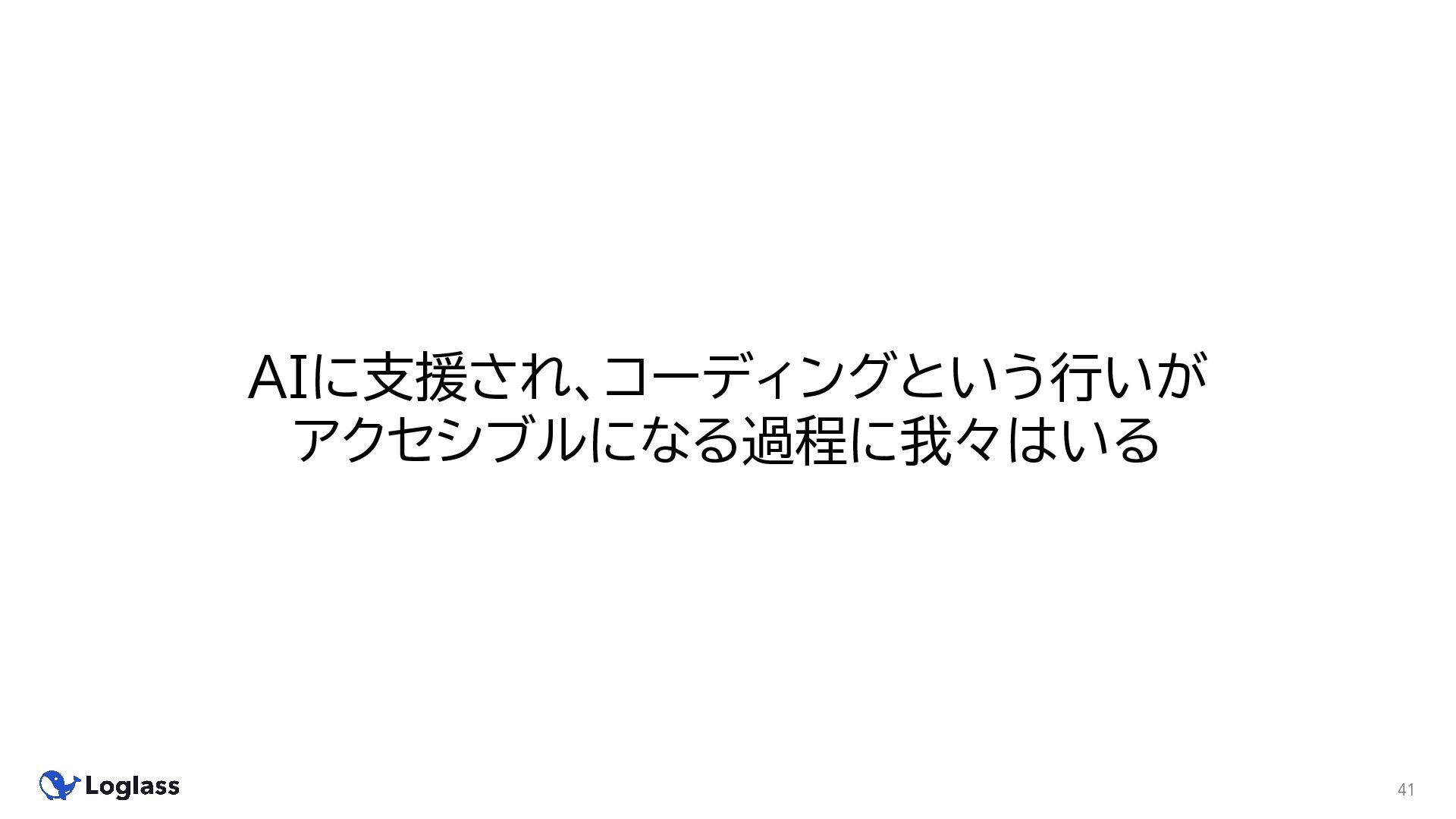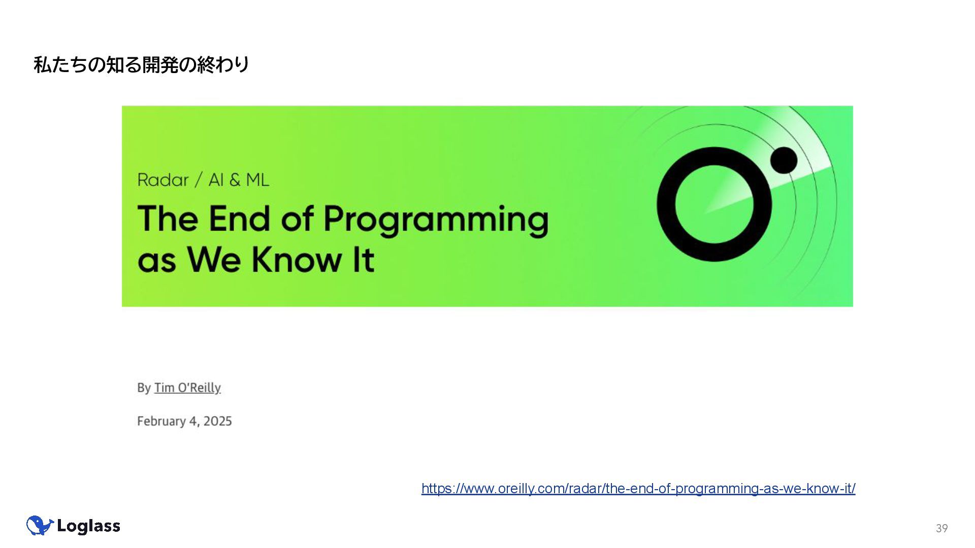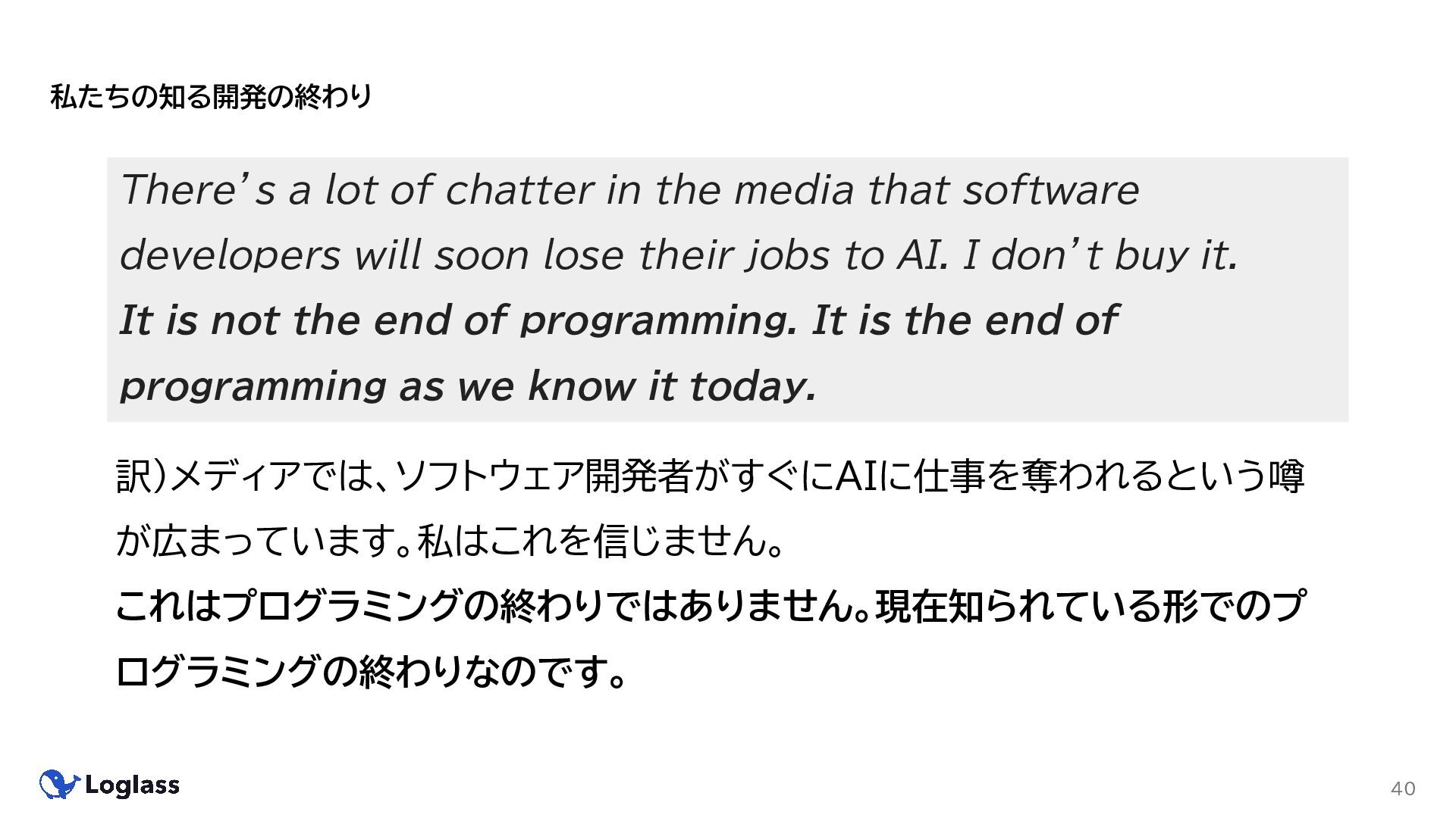 software developers will soon lose their jobs to AI. I don’t buy it. It is not the end of programming. It is the end of programming as we know it today. 訳)メディアでは、ソフトウェア開発者がすぐにAIに仕事を奪われるという噂 が広まっています。私はこれを信じません。 これはプログラミングの終わりではありません。現在知られている形でのプ ログラミングの終わりなのです。 私たちの知る開発の終わり