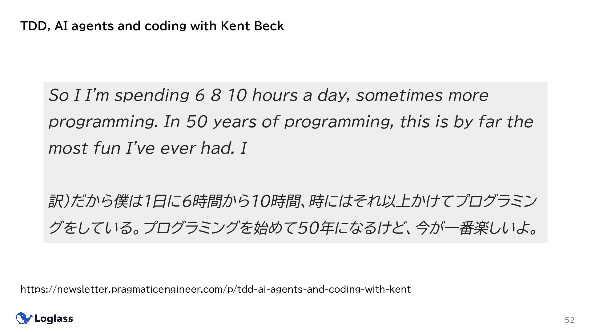 So I I'm spending 6 8 10 hours a day, sometimes more programming. In 50 years of programming, this is by far the most fun I've ever had. I 訳)だから僕は1日に6時間から10時間、時にはそれ以上かけてプログラミン グをしている。プログラミングを始めて50年になるけど、今が一番楽しいよ。