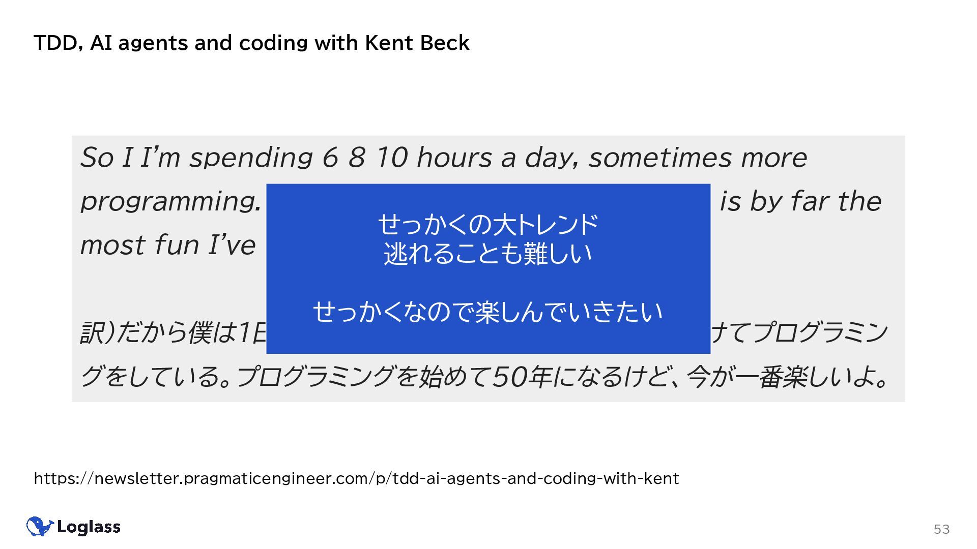 So I I'm spending 6 8 10 hours a day, sometimes more programming. In 50 years of programming, this is by far the most fun I've ever had. I 訳)だから僕は1日に6時間から10時間、時にはそれ以上かけてプログラミン グをしている。プログラミングを始めて50年になるけど、今が一番楽しいよ。 せっかくの大トレンド 逃れることも難しい せっかくなので楽しんでいきたい