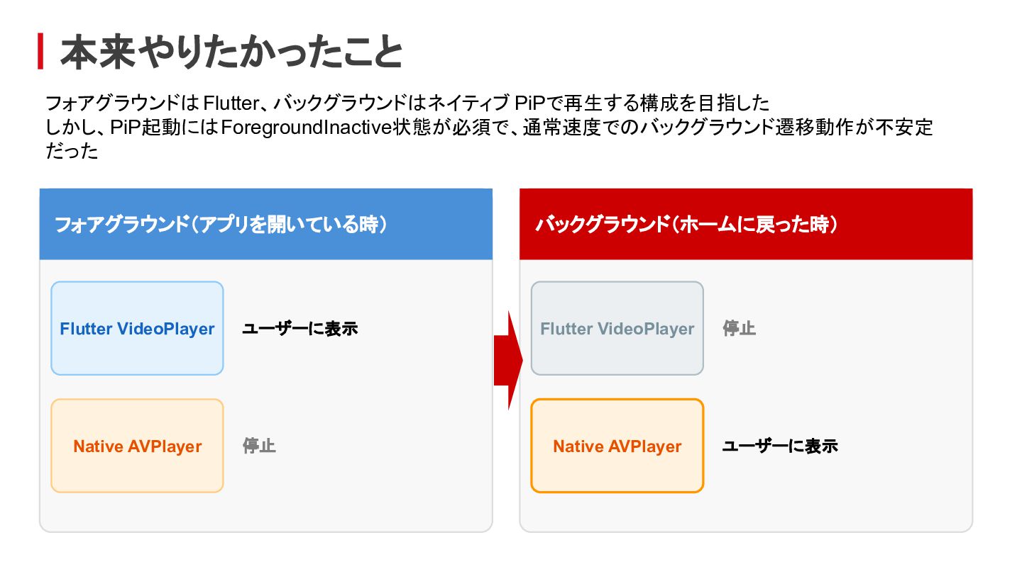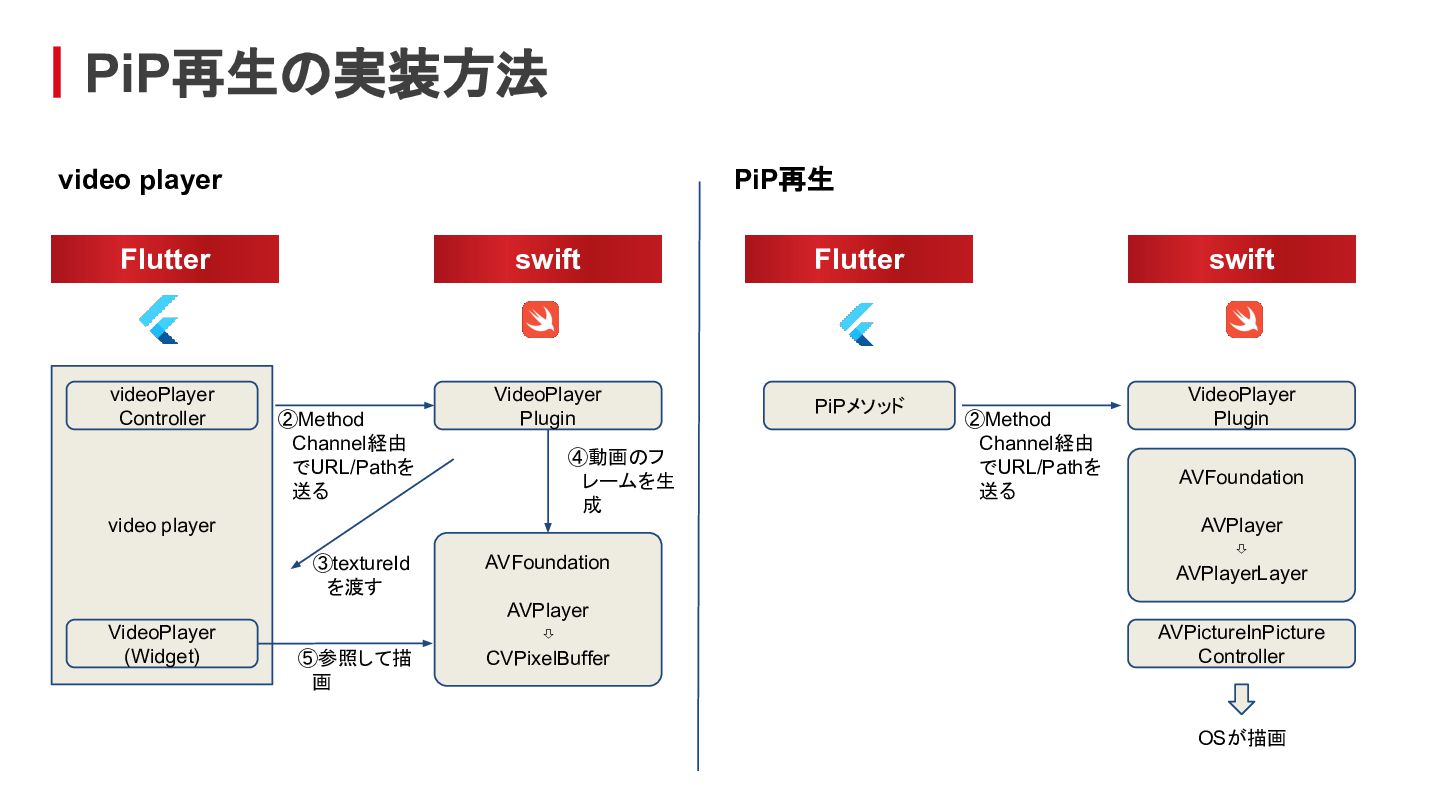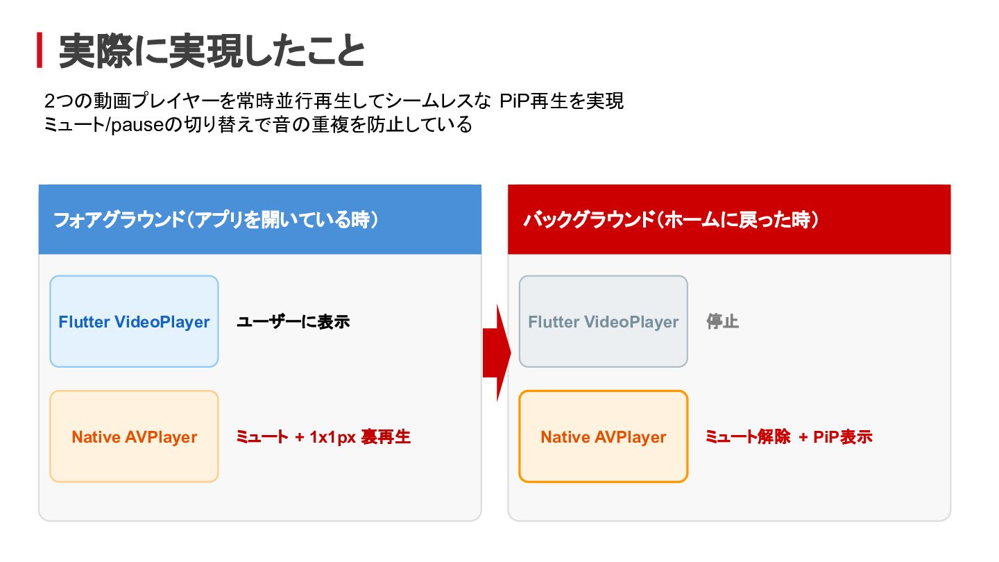 Flutter x Swift連携によるPiP(Picture-in-Picture)再生の実装方法を紹介します。video_playerパッケージをベースに、フォアグラウンドはFlutter、バックグラウンドはネイティブAVPlayerが担当する2プレーヤー並行再生方式で、シームレスなPiP体験を実現しました。