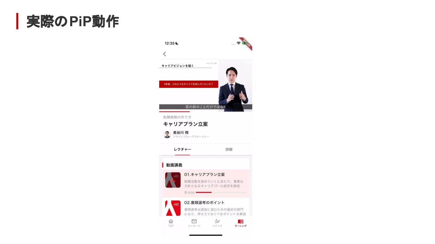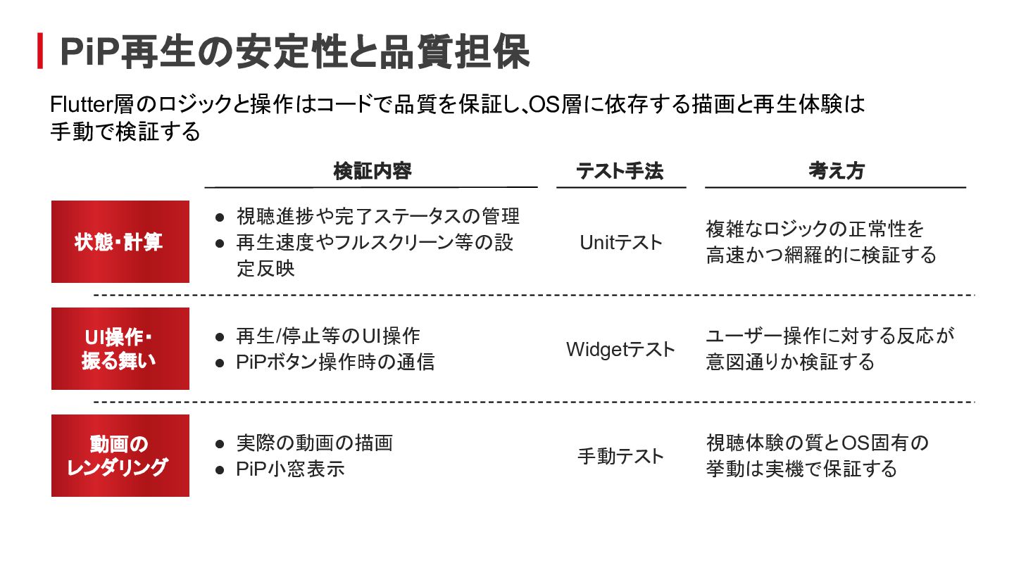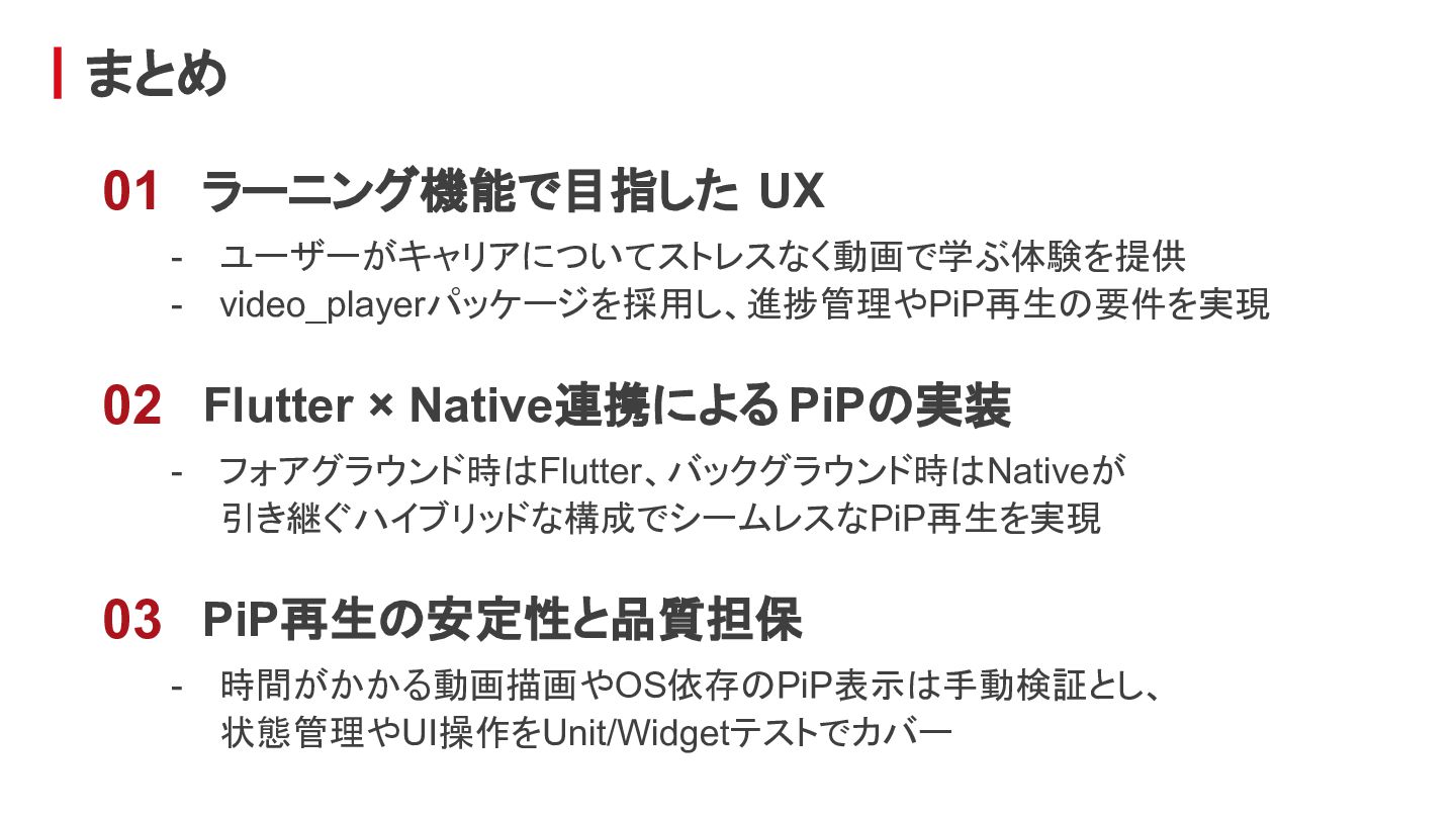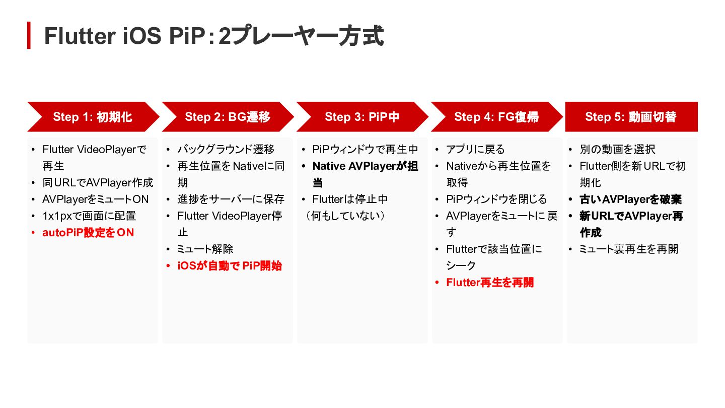 Flutter x Swift連携によるPiP(Picture-in-Picture)再生の実装方法を紹介します。video_playerパッケージをベースに、フォアグラウンドはFlutter、バックグラウンドはネイティブAVPlayerが担当する2プレーヤー並行再生方式で、シームレスなPiP体験を実現しました。