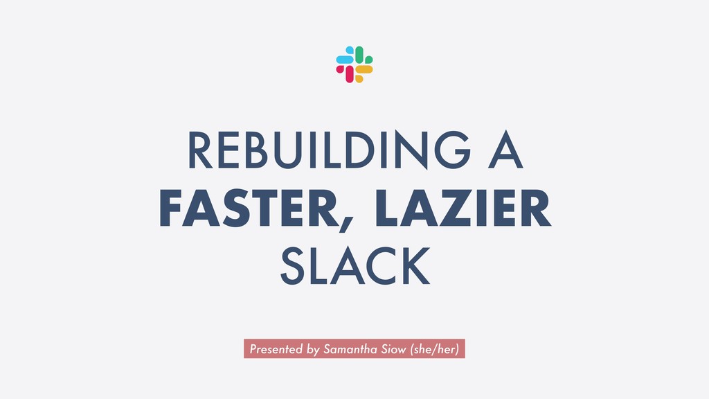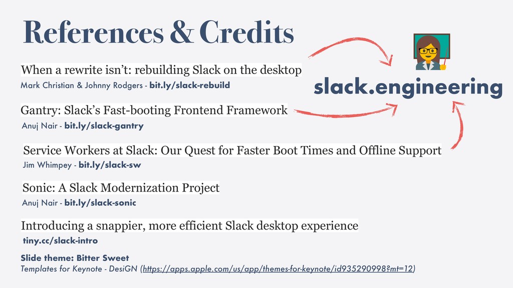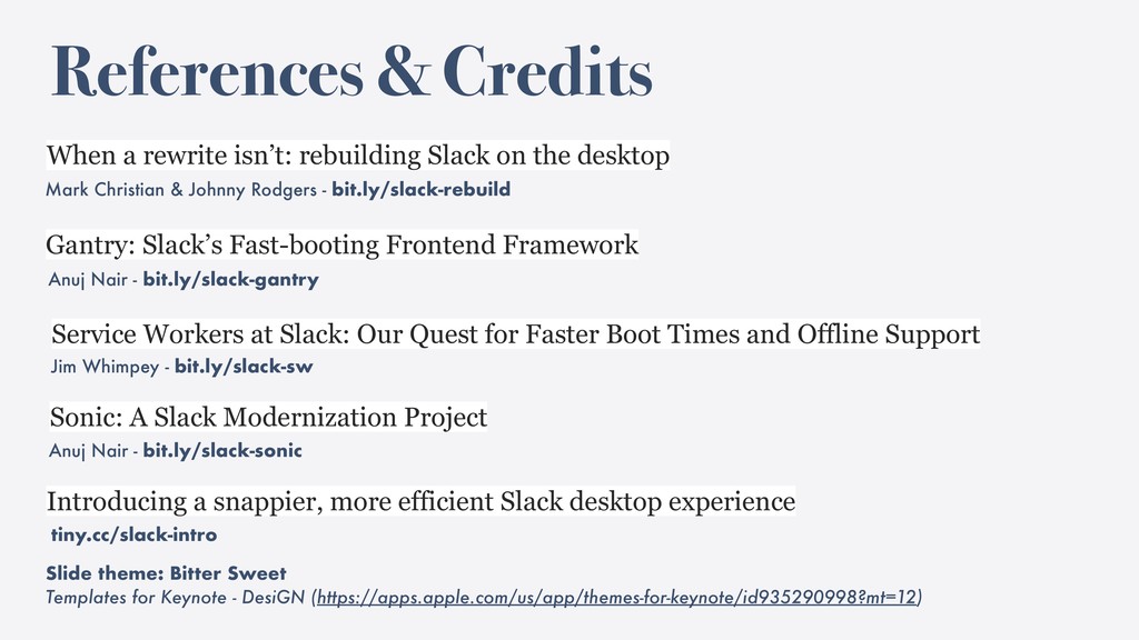 bit.ly/slack-rebuild When a rewrite isn’t: rebuilding Slack on the desktop Service Workers at Slack: Our Quest for Faster Boot Times and Offline Support Jim Whimpey - bit.ly/slack-sw Introducing a snappier, more efficient Slack desktop experience tiny.cc/slack-intro Slide theme: Bitter Sweet Templates for Keynote - DesiGN (https://apps.apple.com/us/app/themes-for-keynote/id935290998?mt=12) Anuj Nair - bit.ly/slack-gantry Gantry: Slack’s Fast-booting Frontend Framework Anuj Nair - bit.ly/slack-sonic Sonic: A Slack Modernization Project