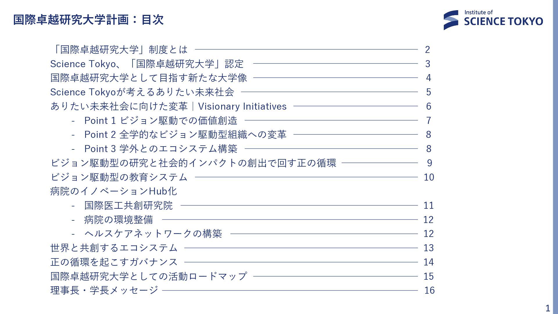 1. 国際卓越研究大学計画:目次 「国際卓越研究大学」制度とは 2 Science Tokyo、「国際卓越研究大学」認定 3 国際卓越研究大学として目指す新たな大学像 4 Science Tokyoが考えるありたい未来社会