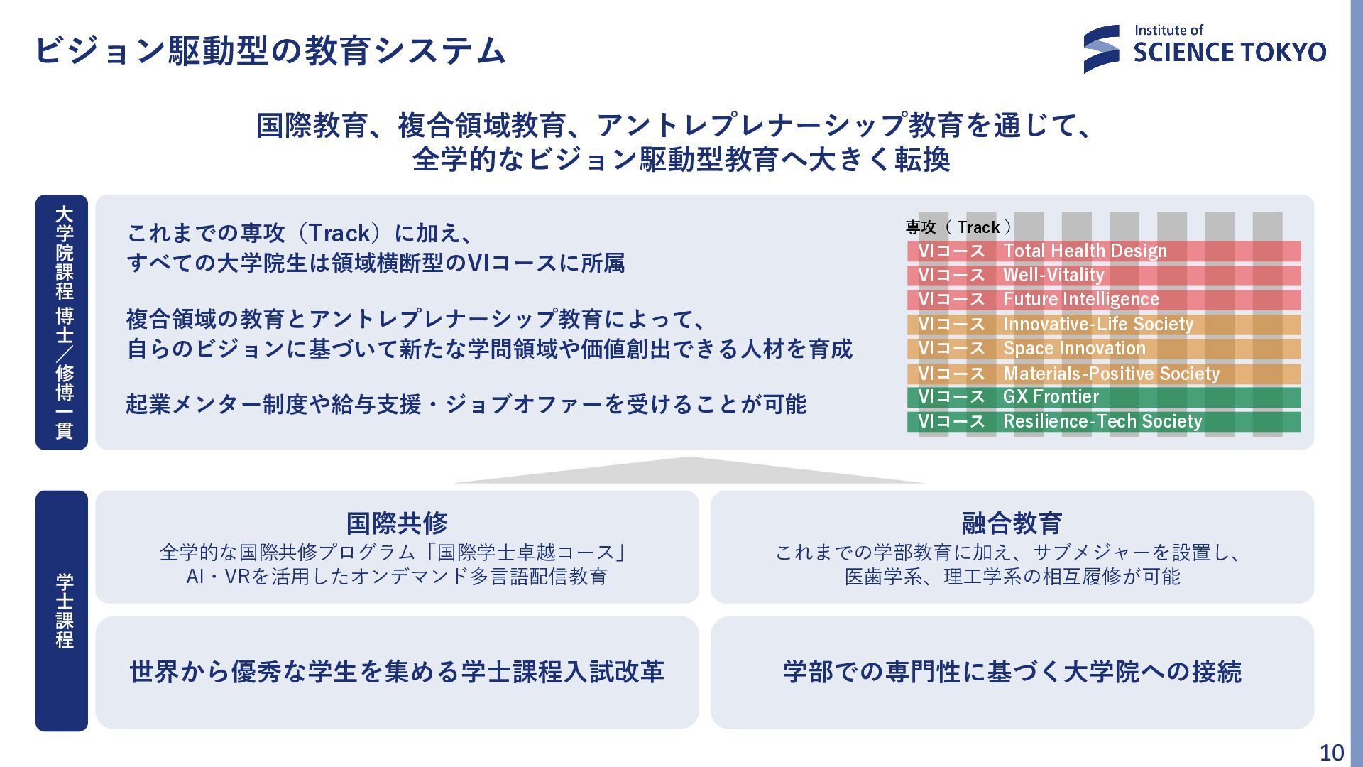 Materials-Positive Society VIコース Well-Vitality VIコース Resilience-Tech Society 専攻( Track ) 世界から優秀な学生を集める学士課程入試改革 国際共修 全学的な国際共修プログラム「国際学士卓越コース」 AI・VRを活用したオンデマンド多言語配信教育 融合教育 これまでの学部教育に加え、サブメジャーを設置し、 医歯学系、理工学系の相互履修が可能 学 士 課 程 大 学 院 課 程 博 士 / 修 博 一 貫 VIコース Innovative-Life Society VIコース Total Health Design VIコース GX Frontier VIコース Space Innovation VIコース Future Intelligence 学部での専門性に基づく大学院への接続