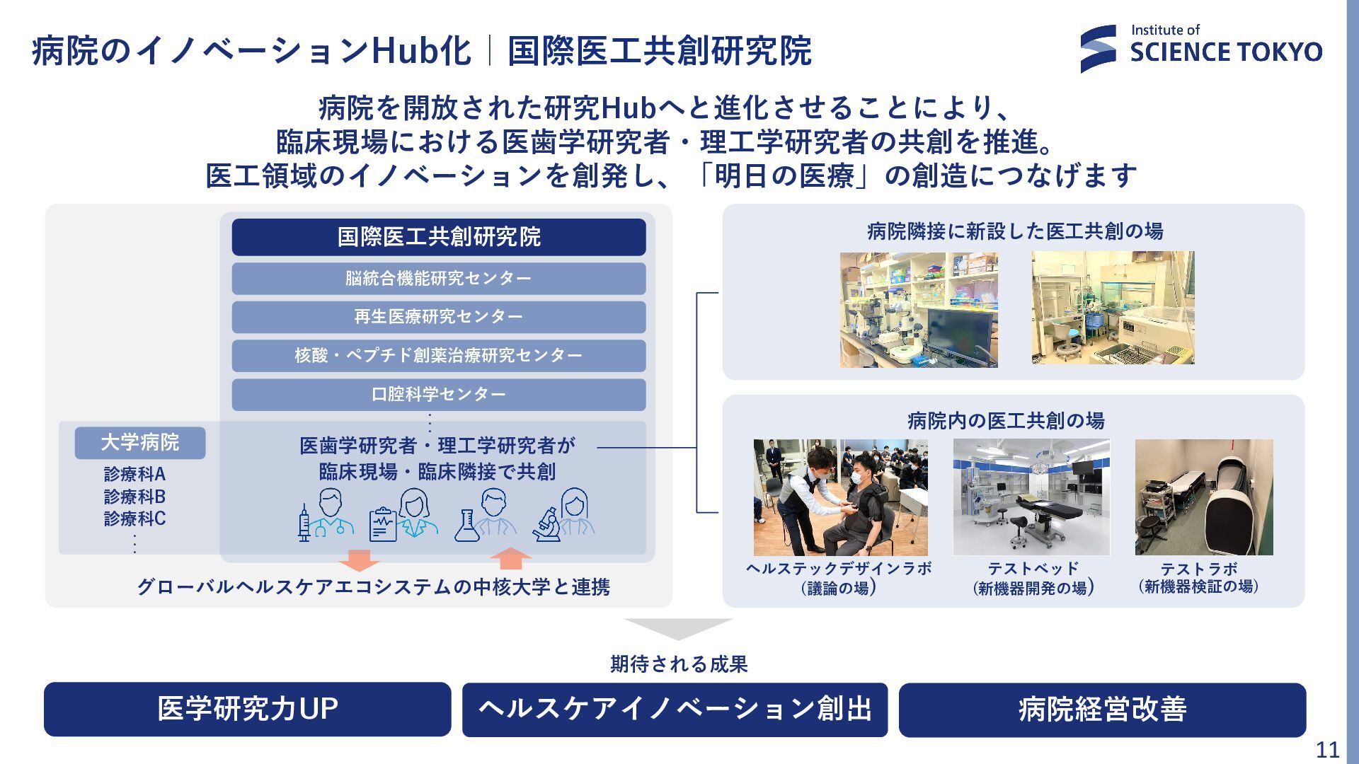 10. 病院のイノベーションHub化|国際医工共創研究院 病院を開放された研究Hubへと進化させることにより、 臨床現場における医歯学研究者・理工学研究者の共創を推進。 医工領域のイノベーションを創発し、「明日の医療」の創造につなげます 11 グローバルヘルスケアエコシステムの中核大学と連携 国際医工共創研究院 脳統合機能研究センター 再生医療研究センター 口腔科学センター