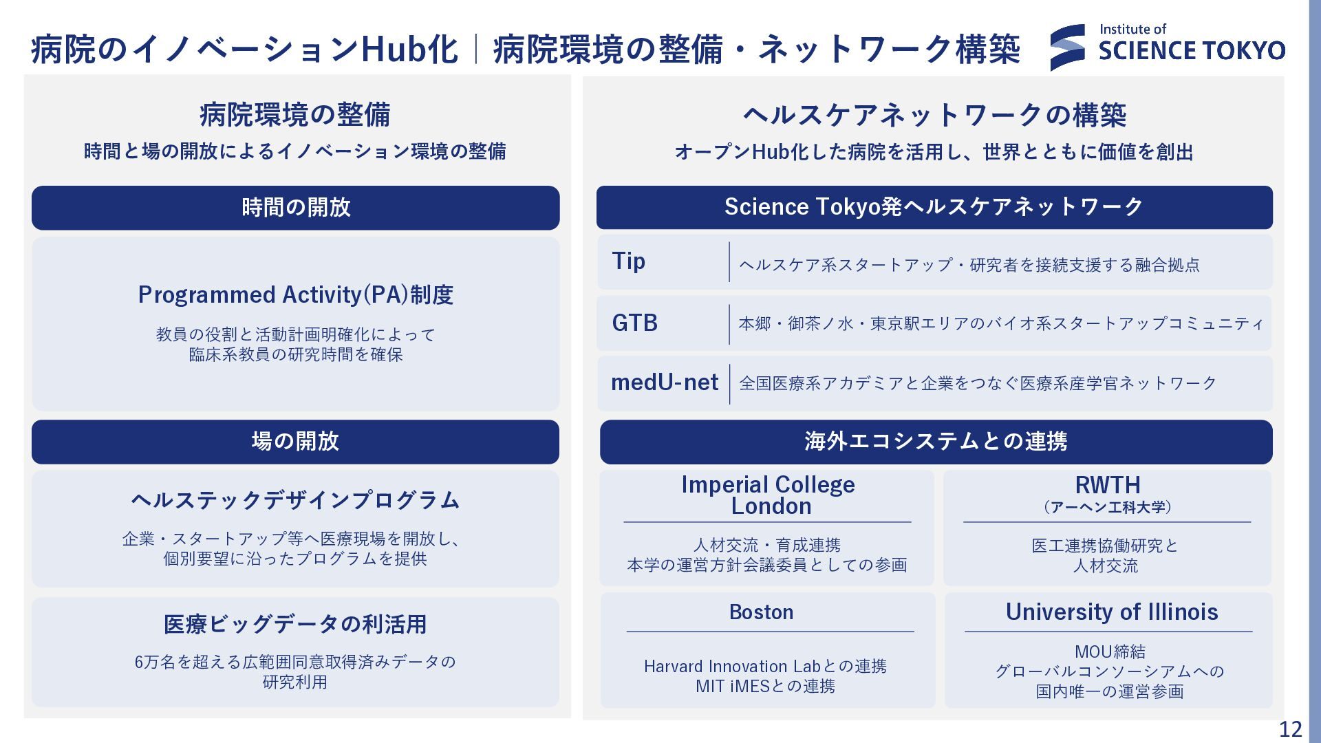 11. 病院のイノベーションHub化|病院環境の整備・ネットワーク構築 12 Tip GTB medU-net ヘルスケア系スタートアップ・研究者を接続支援する融合拠点 本郷・御茶ノ水・東京駅エリアのバイオ系スタートアップコミュニティ 全国医療系アカデミアと企業をつなぐ医療系産学官ネットワーク Science Tokyo発ヘルスケアネットワーク