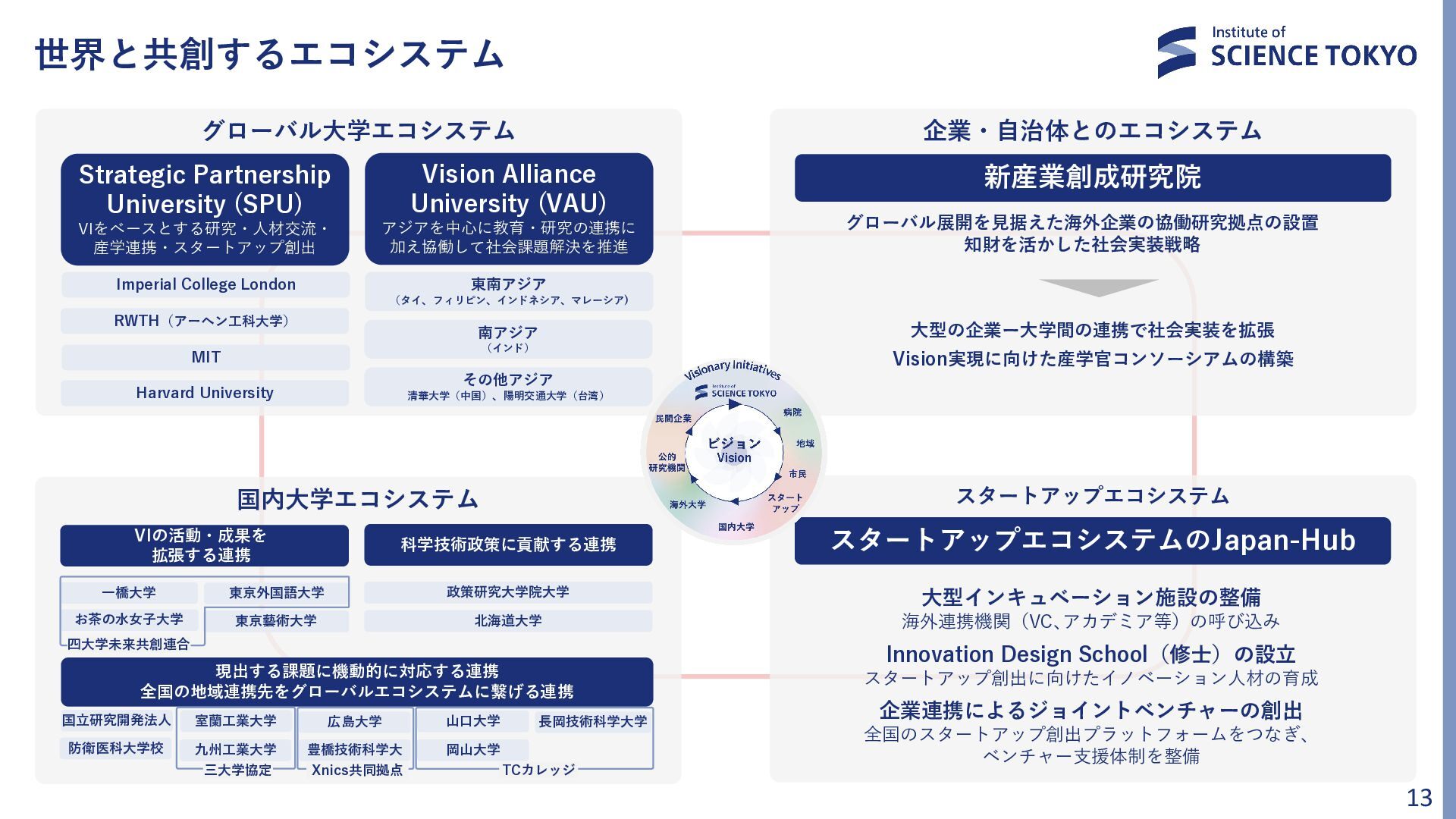 大型インキュベーション施設の整備 海外連携機関(VC、アカデミア等)の呼び込み Innovation Design School(修士)の設立 スタートアップ創出に向けたイノベーション人材の育成 企業連携によるジョイントベンチャーの創出 全国のスタートアップ創出プラットフォームをつなぎ、 ベンチャー支援体制を整備 VIの活動・成果を 拡張する連携 新産業創成研究院 スタートアップエコシステムのJapan-Hub Strategic Partnership University (SPU) VIをベースとする研究・人材交流・ 産学連携・スタートアップ創出 Imperial College London 一橋大学 東京外国語大学 お茶の水女子大学 Vision Alliance University (VAU) アジアを中心に教育・研究の連携に 加え協働して社会課題解決を推進 東南アジア (タイ、フィリピン、インドネシア、マレーシア) 南アジア (インド) その他アジア 清華大学(中国)、陽明交通大学(台湾) RWTH(アーヘン工科大学) MIT Harvard University 現出する課題に機動的に対応する連携 全国の地域連携先をグローバルエコシステムに繋げる連携 科学技術政策に貢献する連携 東京藝術大学 四大学未来共創連合 北海道大学 政策研究大学院大学 室蘭工業大学 長岡技術科学大学 広島大学 国立研究開発法人 防衛医科大学校 山口大学 九州工業大学 豊橋技術科学大 岡山大学 三大学協定 Xnics共同拠点 TCカレッジ